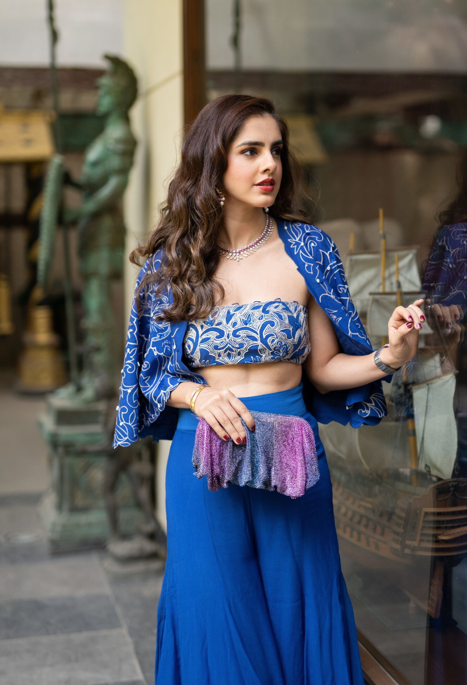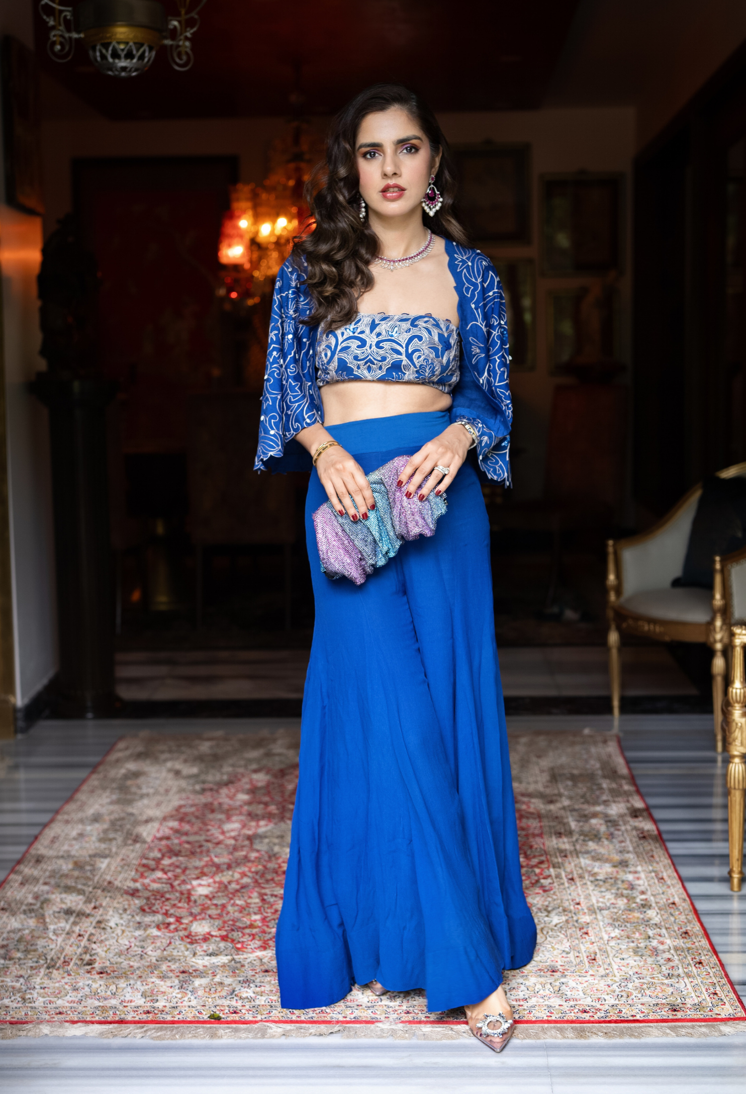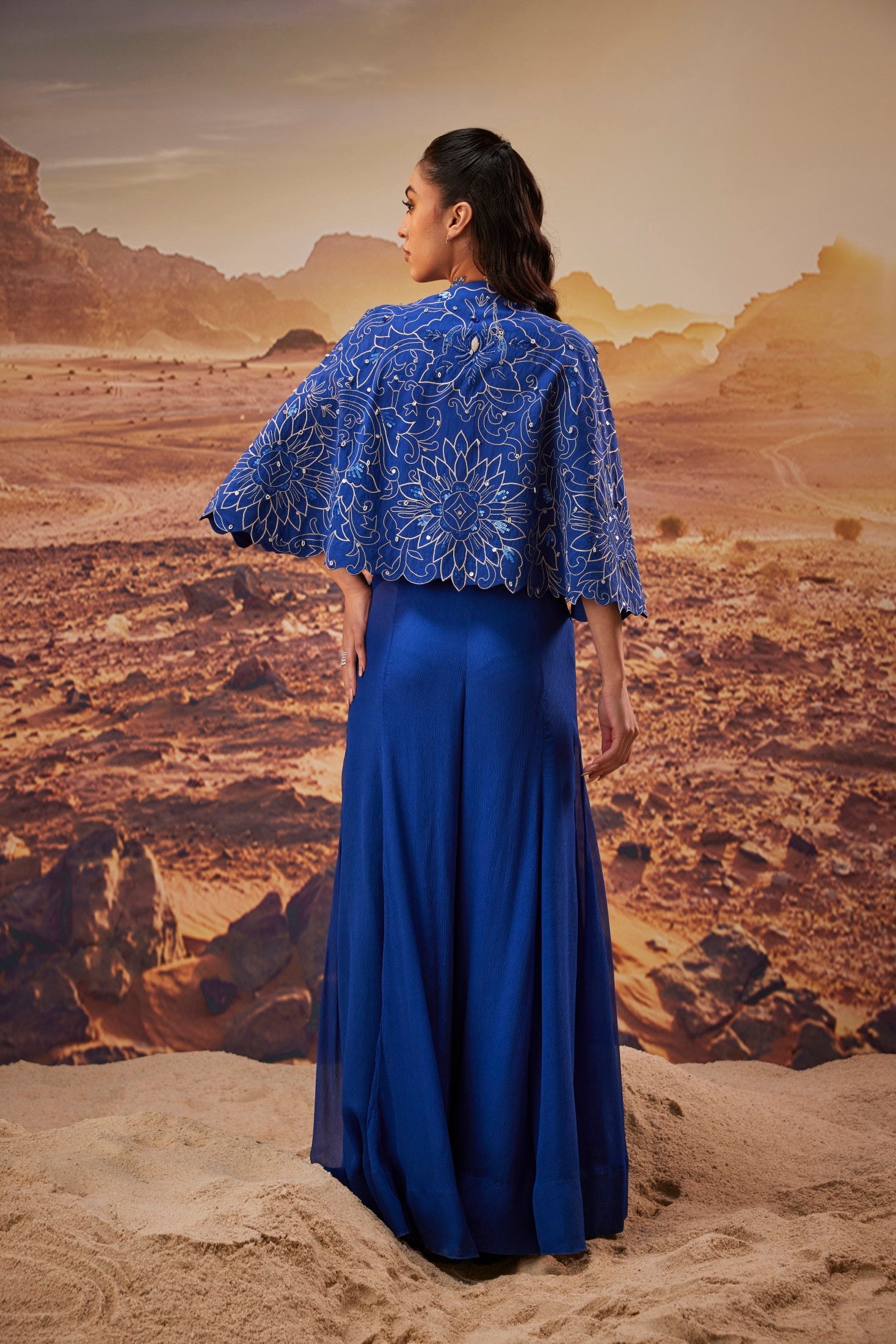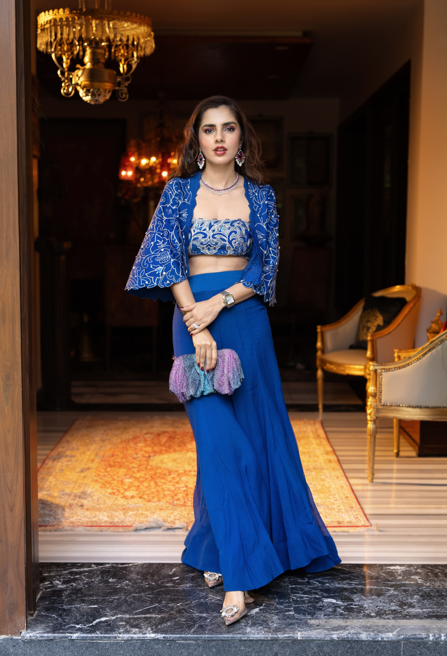 Ethereal and statement-making, this blue ensemble features a delicately jaal-embroidered cape paired with embroidered inner and flowing chiffon sharara. The soft textures and intricate detailing create a graceful silhouette, perfect for festive celebrations, evening events, or modern traditional occasions.