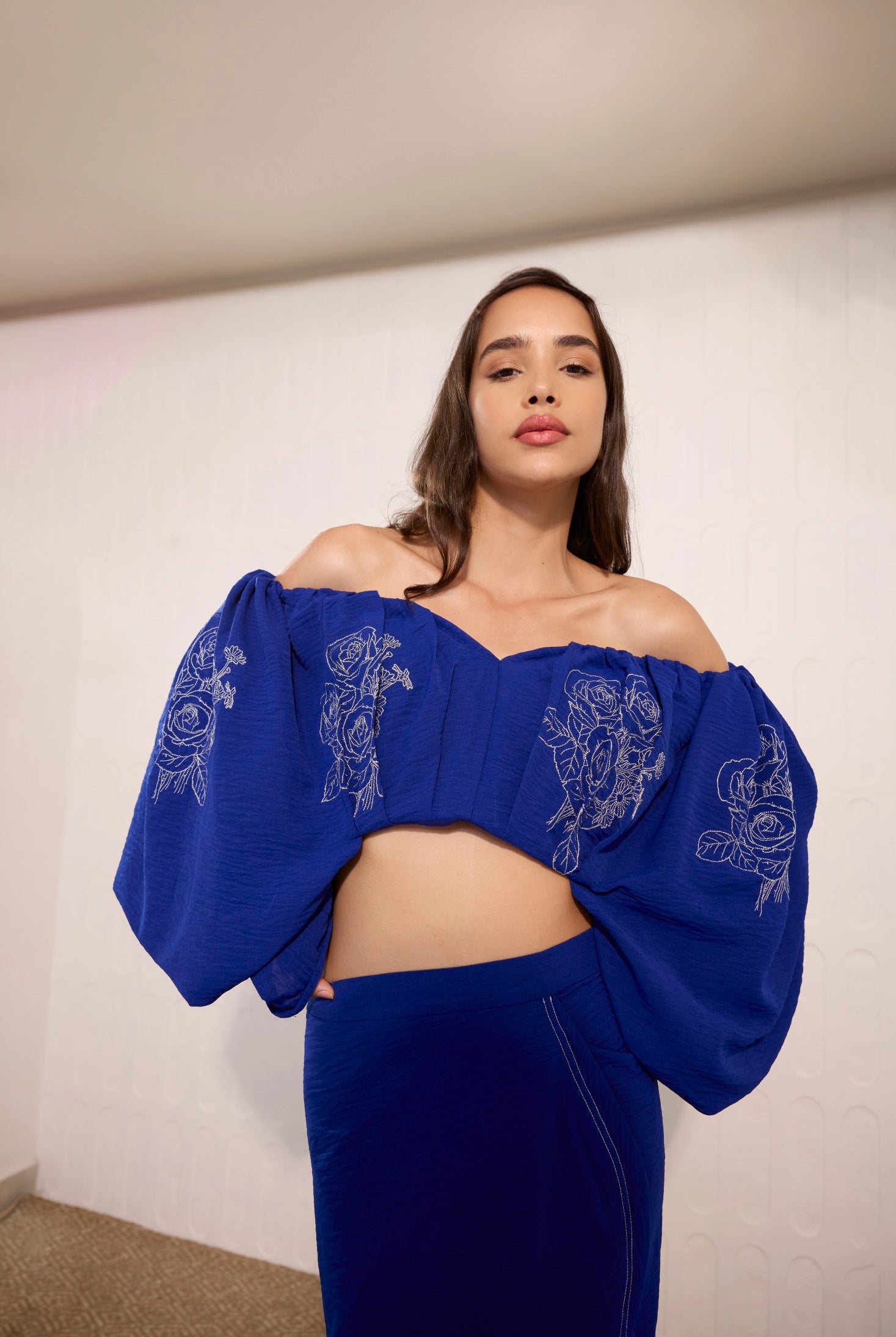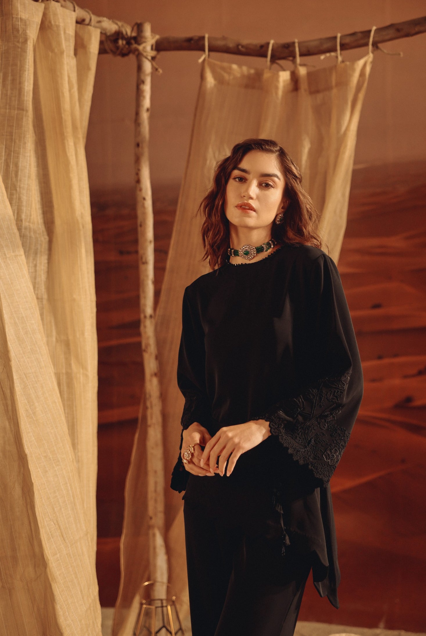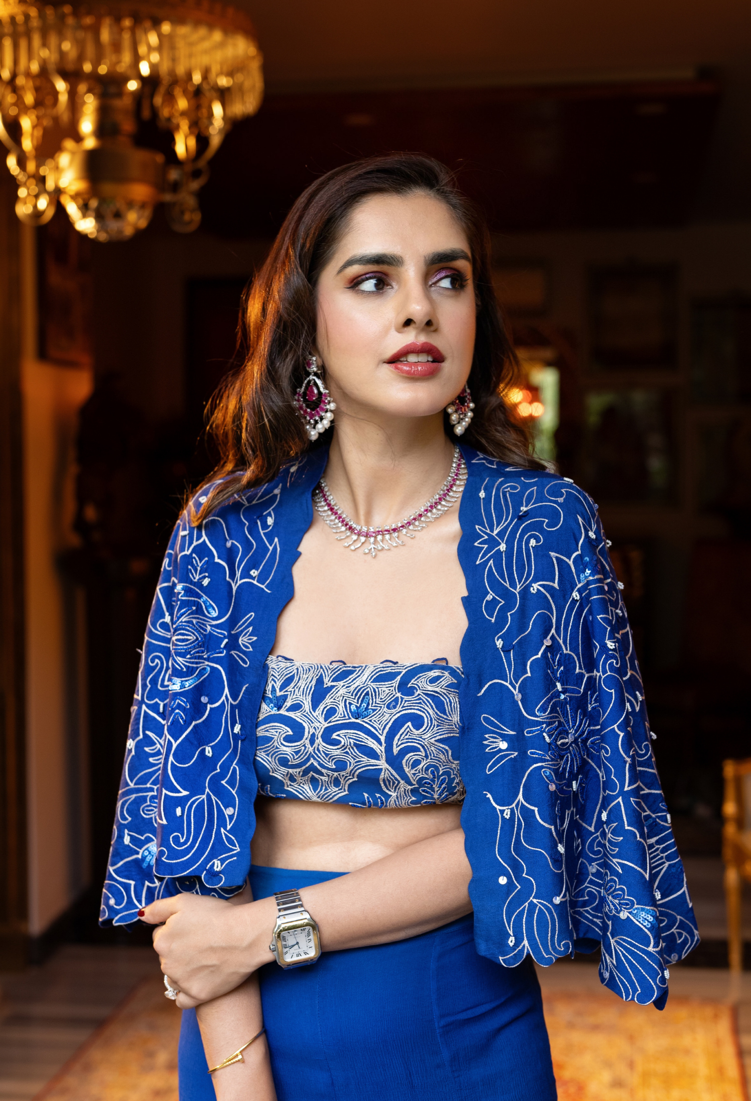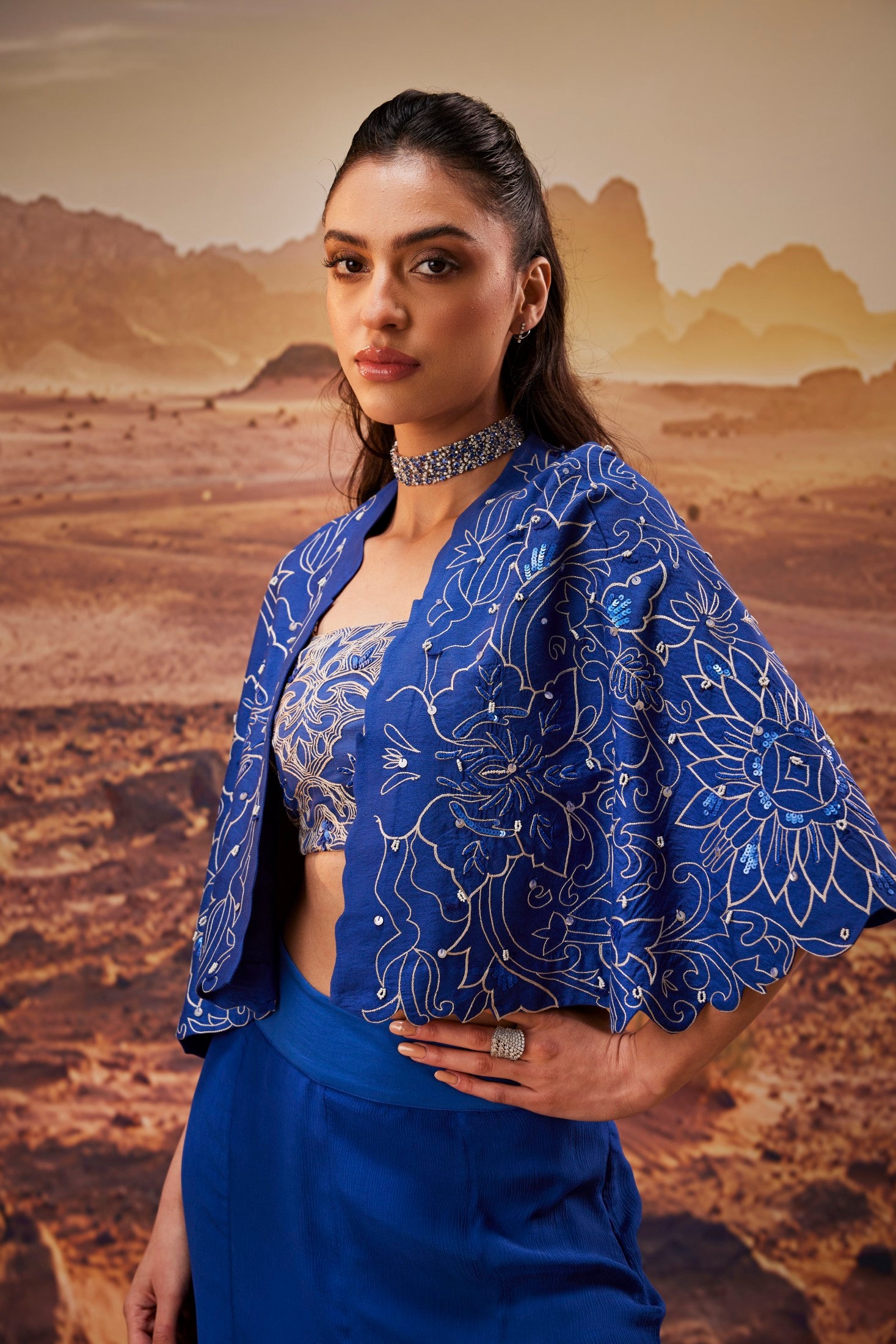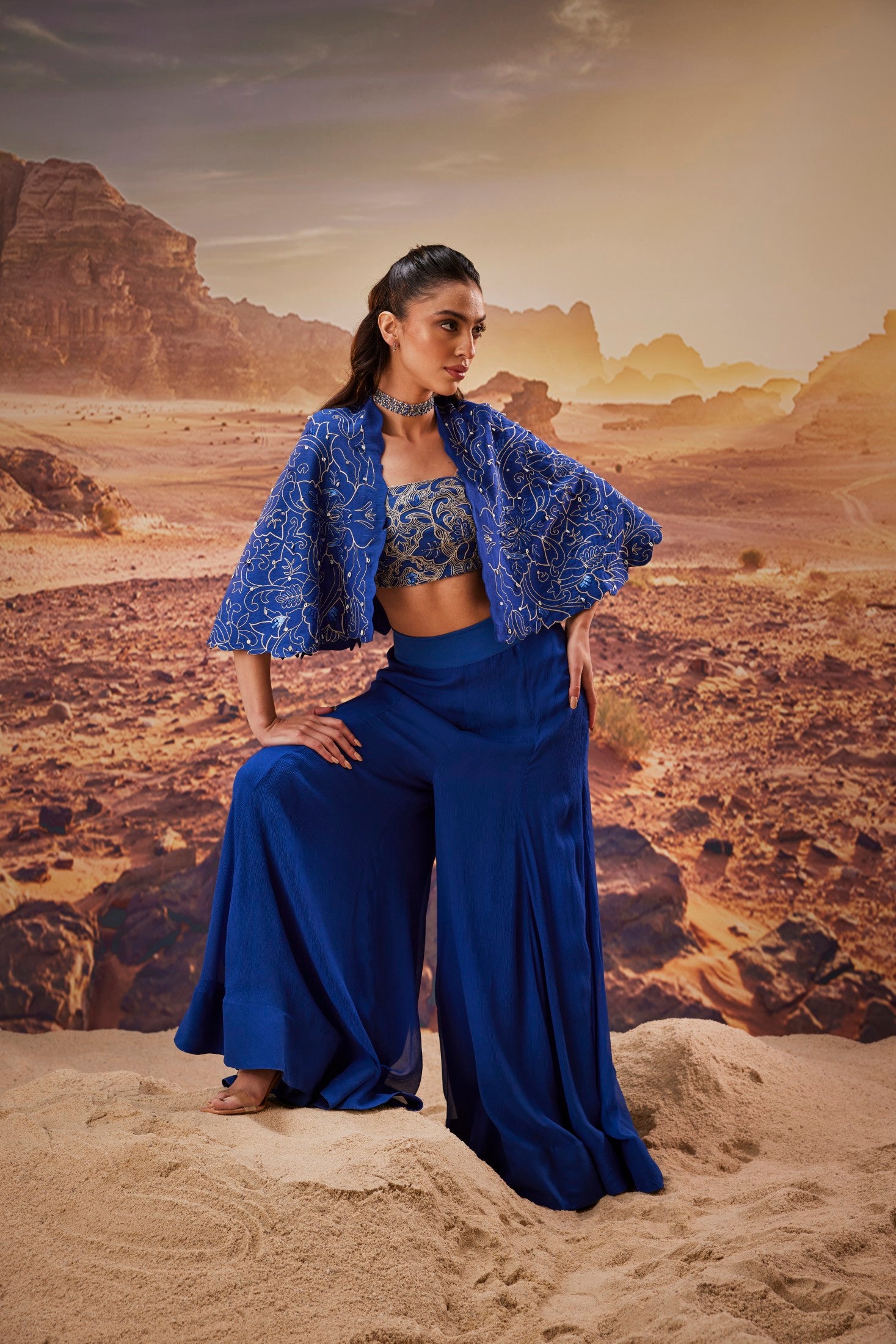 Ethereal and statement-making, this blue ensemble features a delicately jaal-embroidered cape paired with embroidered inner and flowing chiffon sharara. The soft textures and intricate detailing create a graceful silhouette, perfect for festive celebrations, evening events, or modern traditional occasions.