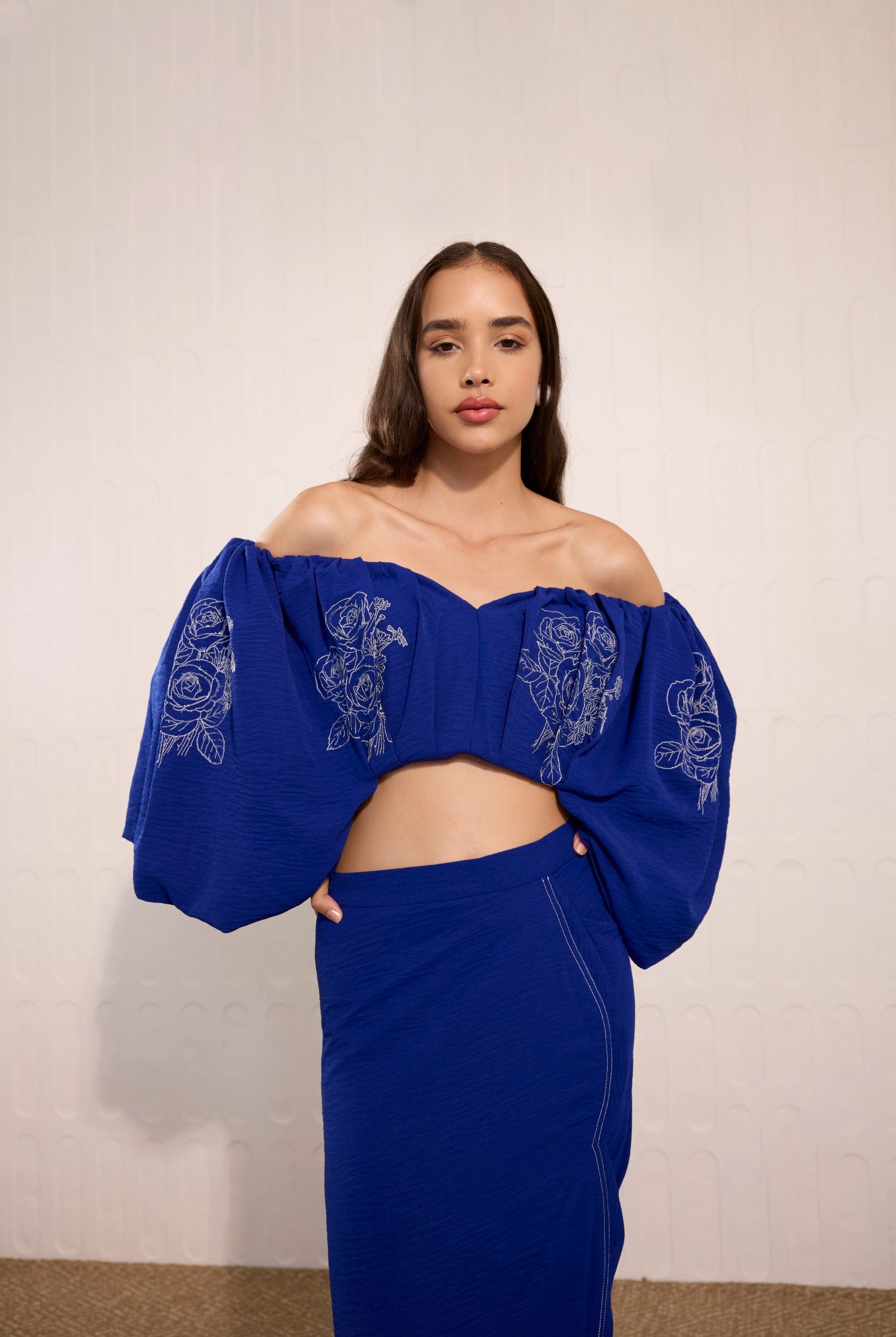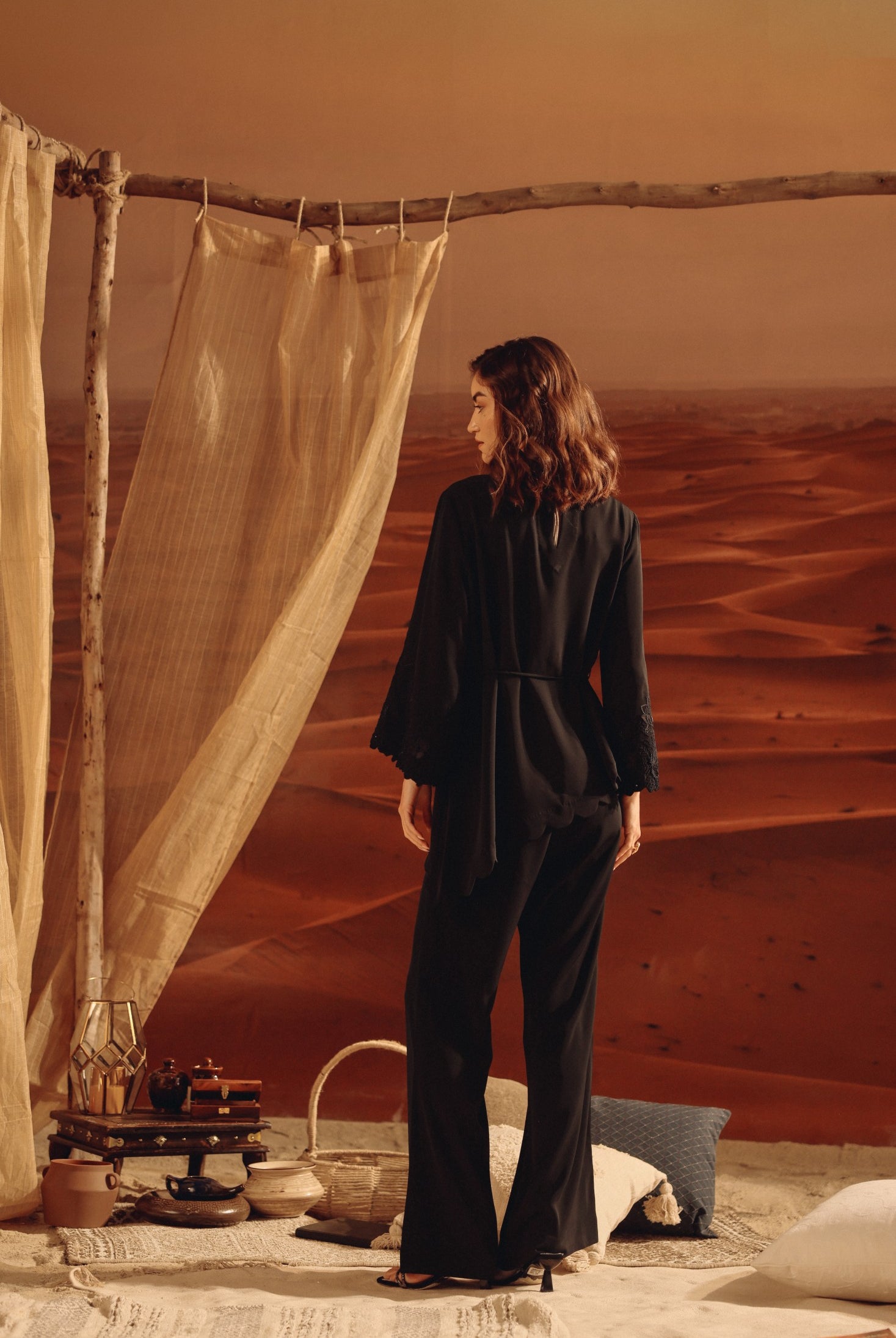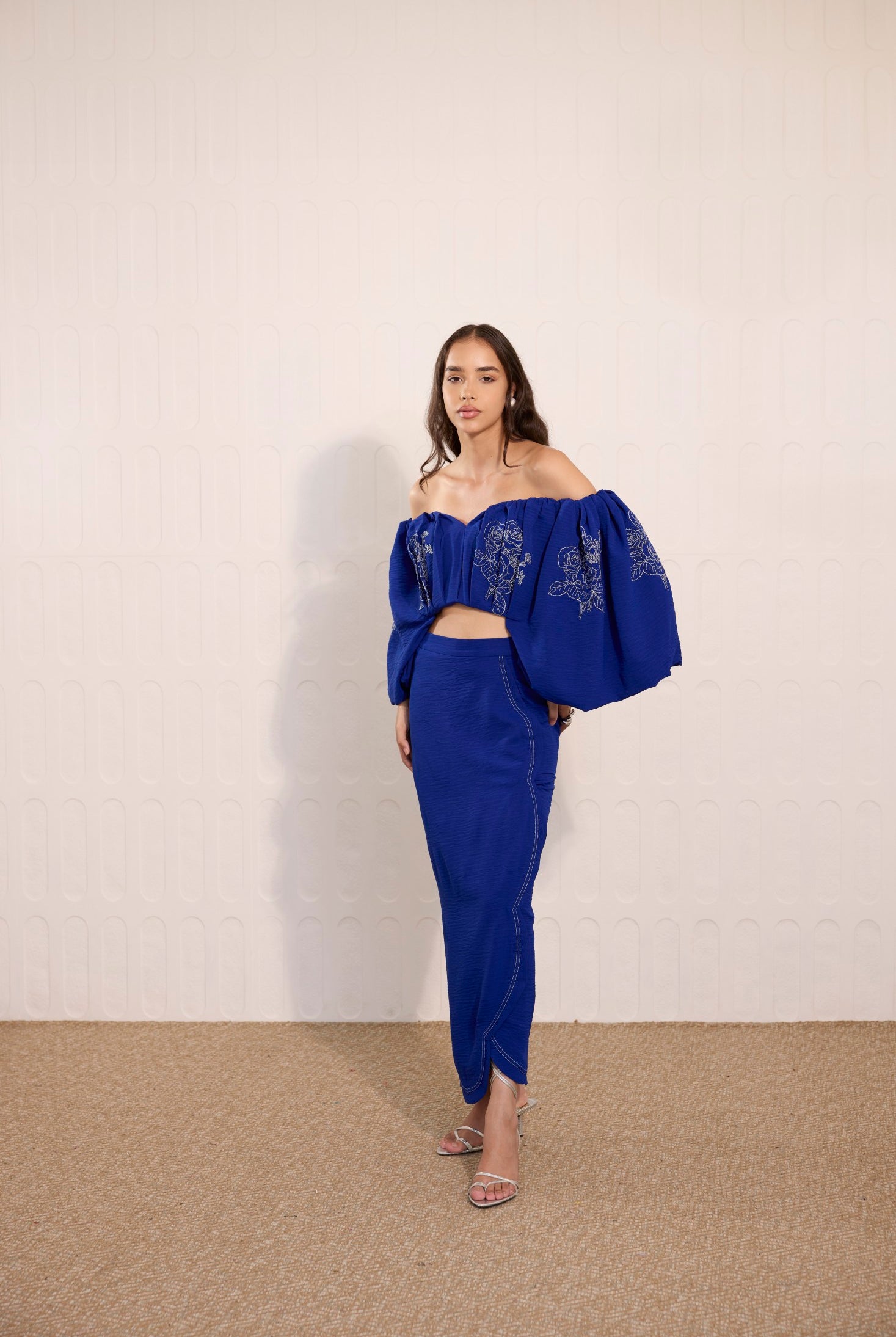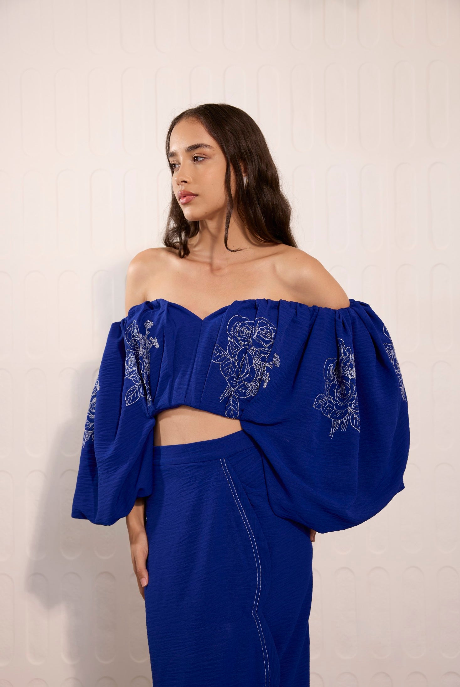 Ethereal and statement-making, this blue ensemble features a delicately jaal-embroidered cape paired with embroidered inner and flowing chiffon sharara. The soft textures and intricate detailing create a graceful silhouette, perfect for festive celebrations, evening events, or modern traditional occasions.