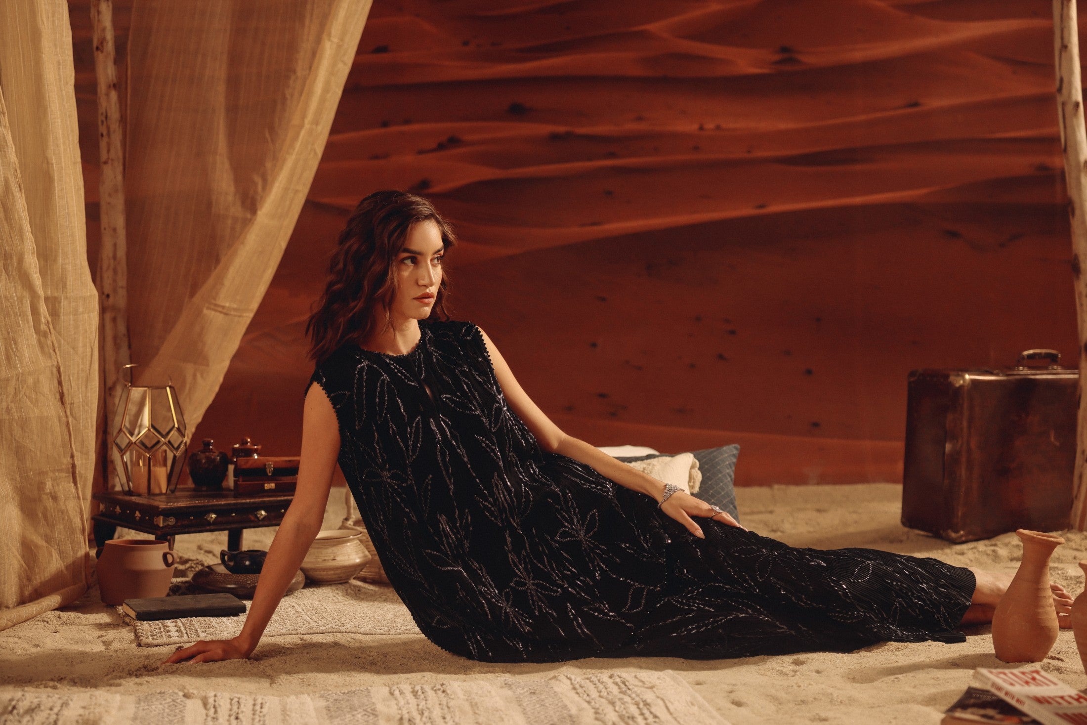 Ethereal and statement-making, this blue ensemble features a delicately jaal-embroidered cape paired with embroidered inner and flowing chiffon sharara. The soft textures and intricate detailing create a graceful silhouette, perfect for festive celebrations, evening events, or modern traditional occasions.