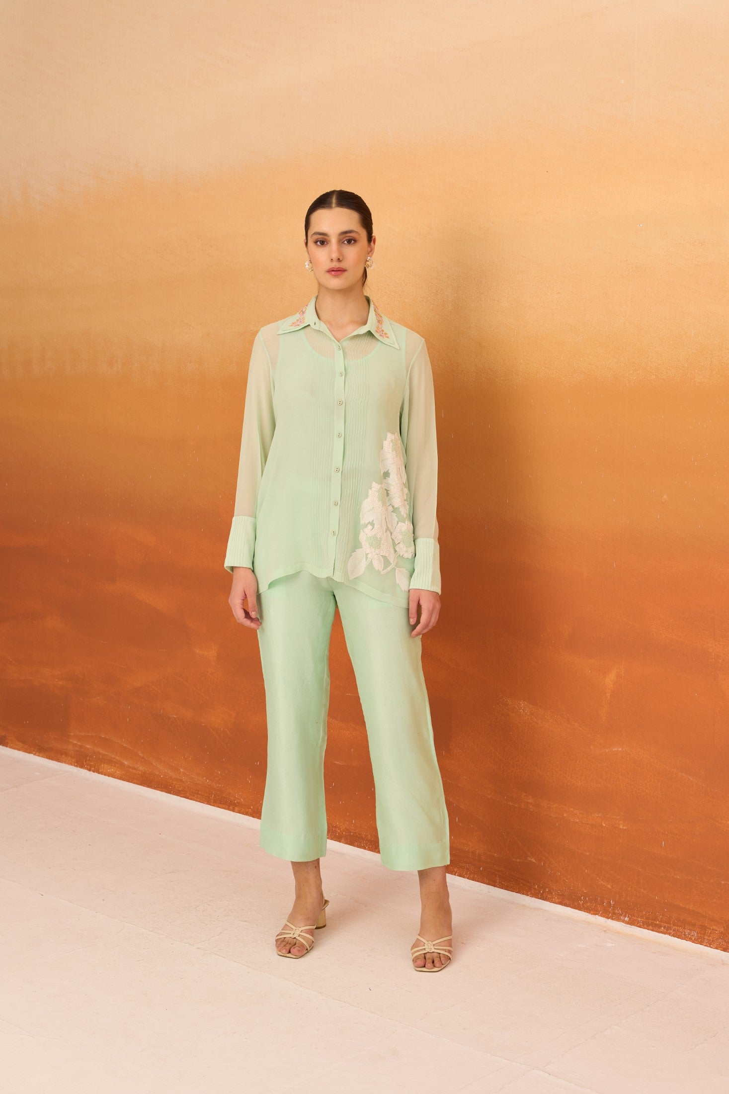 Graceful and refined, this 2-piece set features mint green silk pants paired with a delicately embroidered pure georgette shirt, complete with a soft inner lining for added comfort. The intricate embroidery adds a touch of sophistication to the lightweight, flowing silhouette. Designed to offer both style and ease, this ensemble is perfect for festive occasions, intimate gatherings, or elegant daytime events.