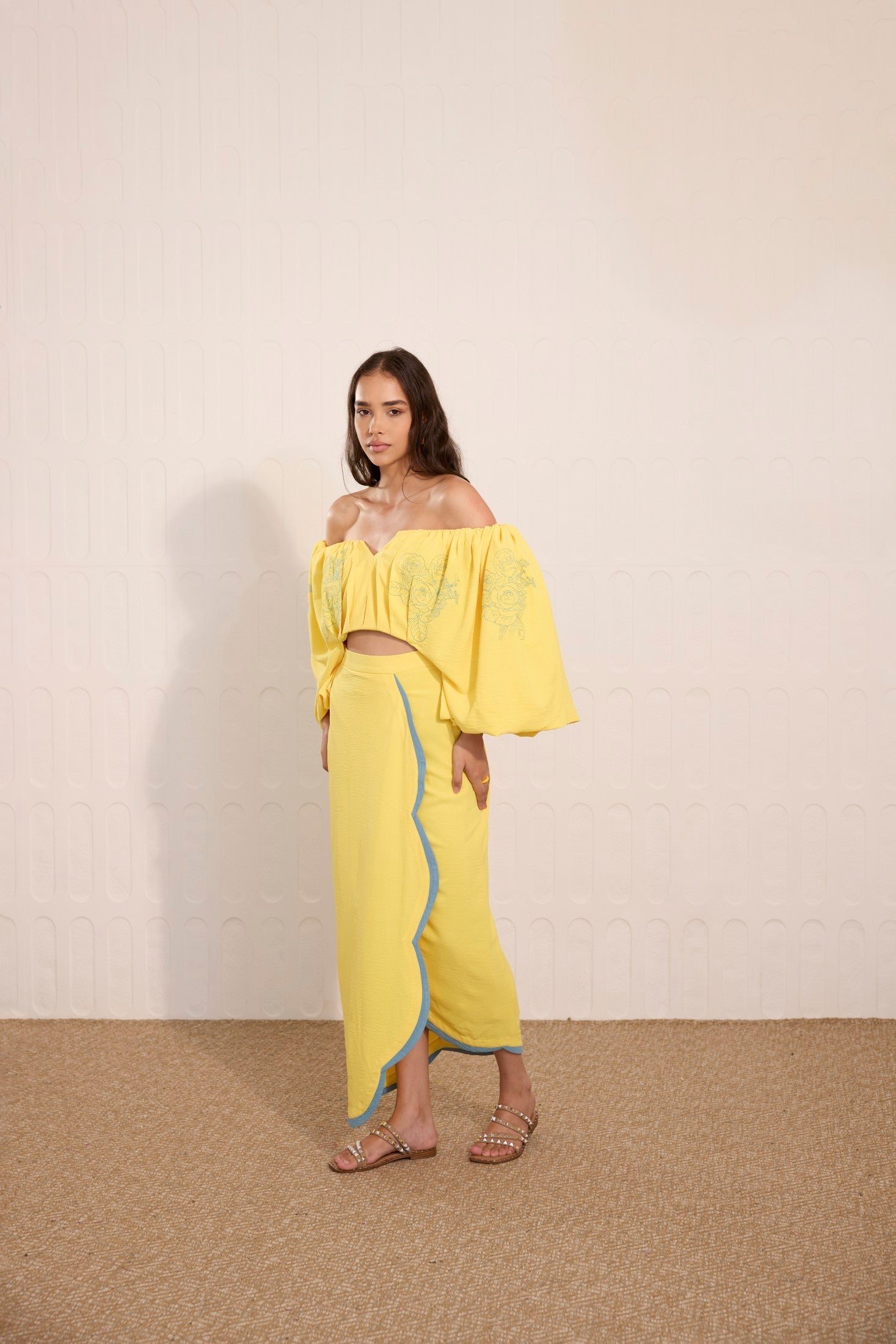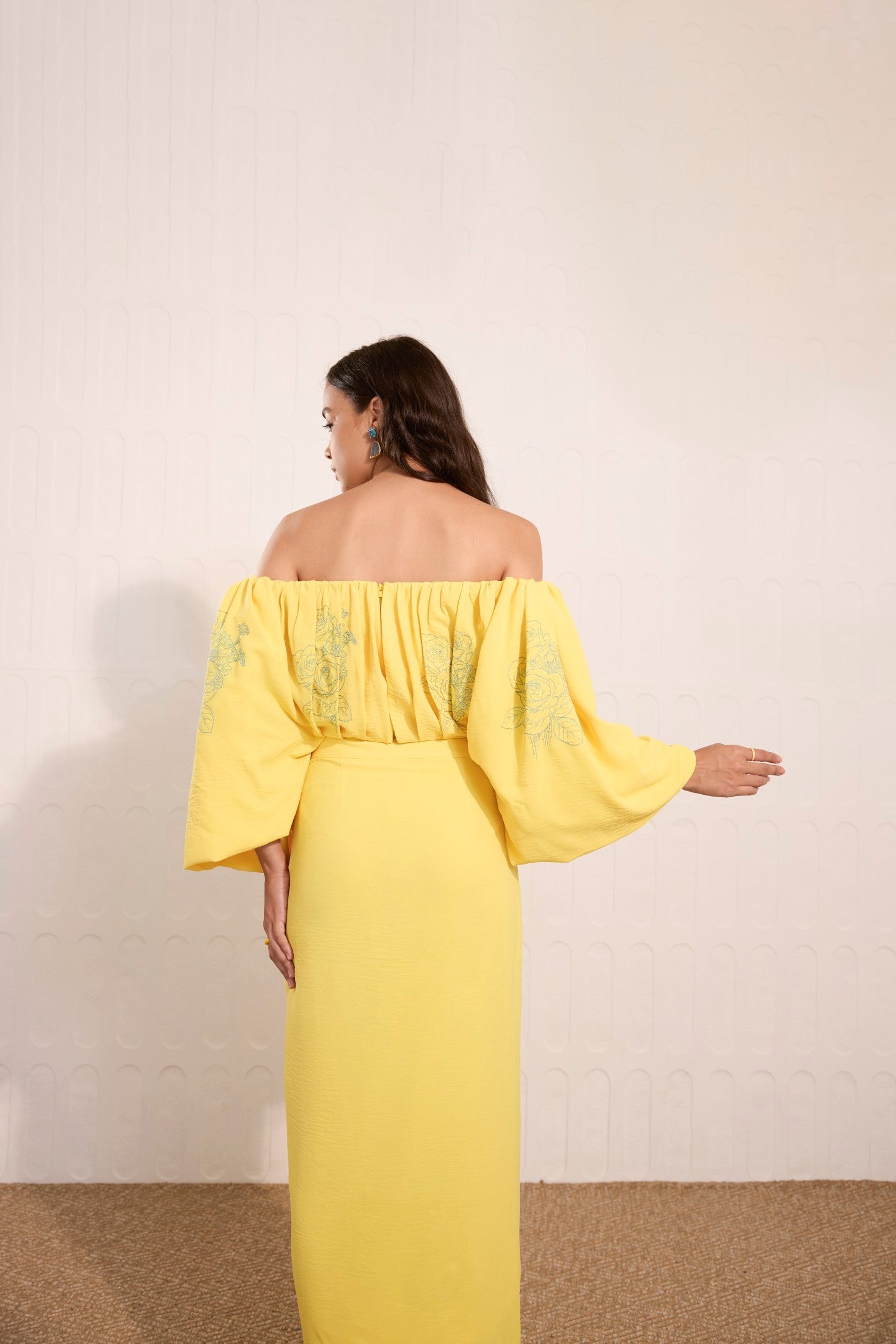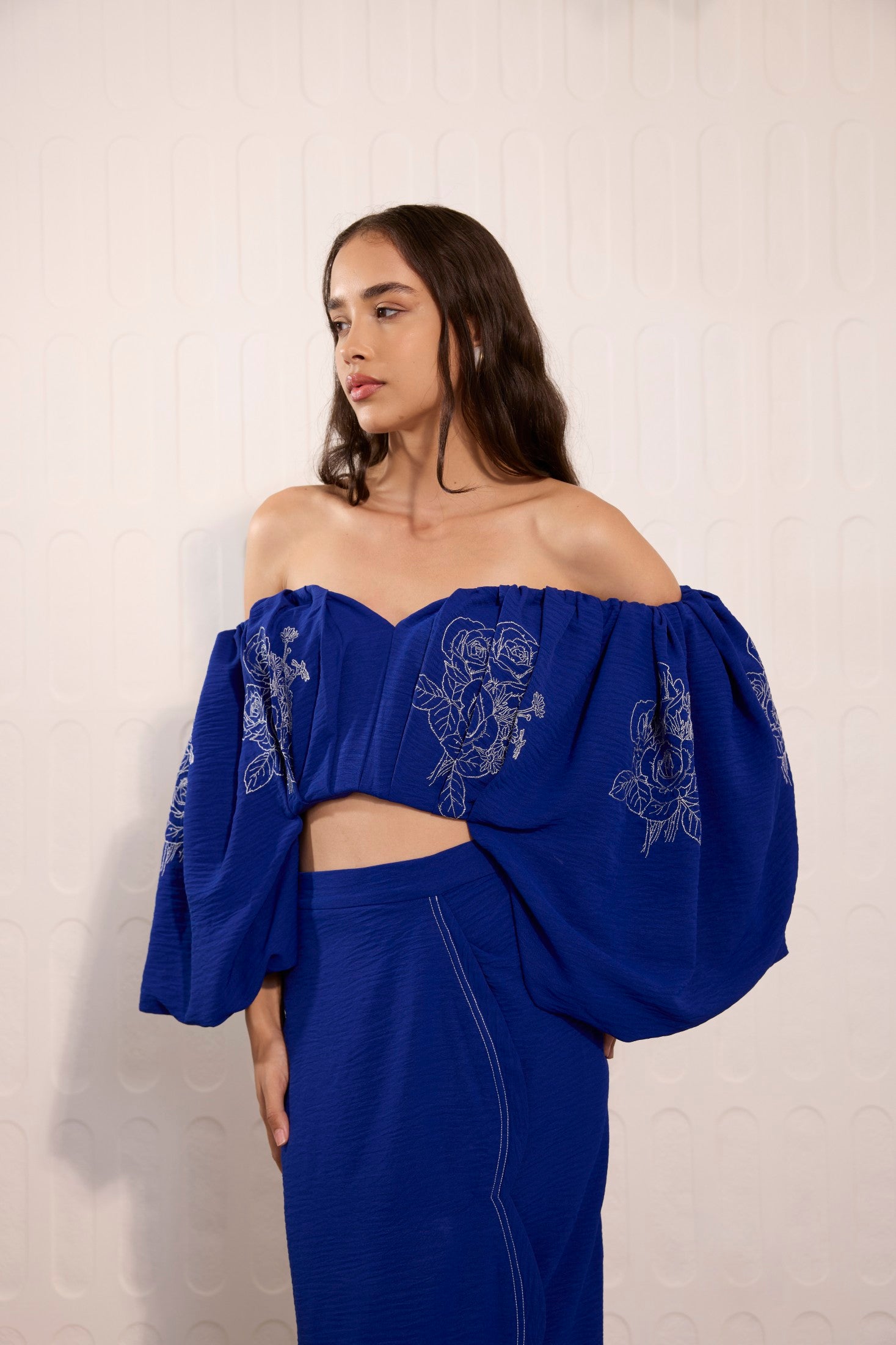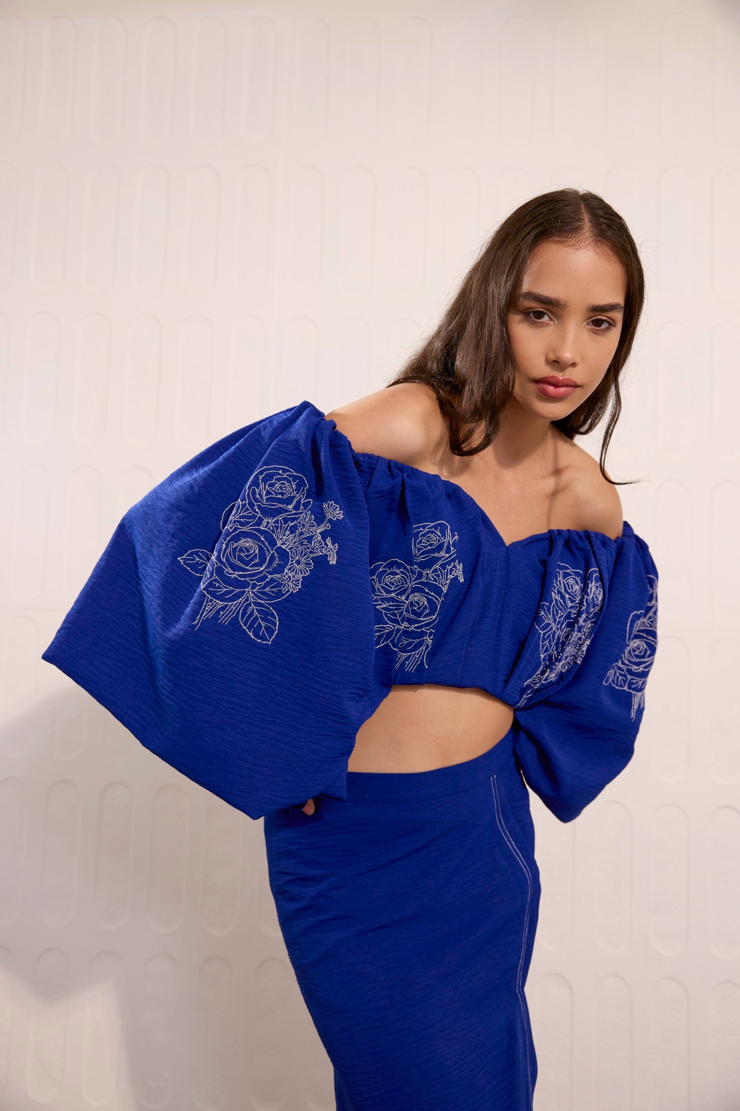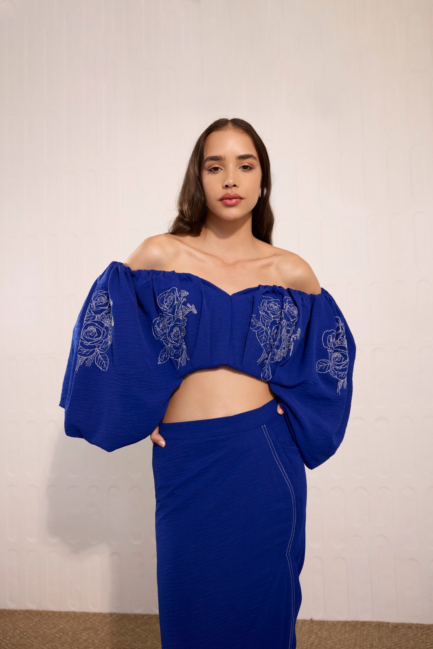 Off-Shoulder Pleated Crop Top with Accent Embroidery & Overlay Skirt