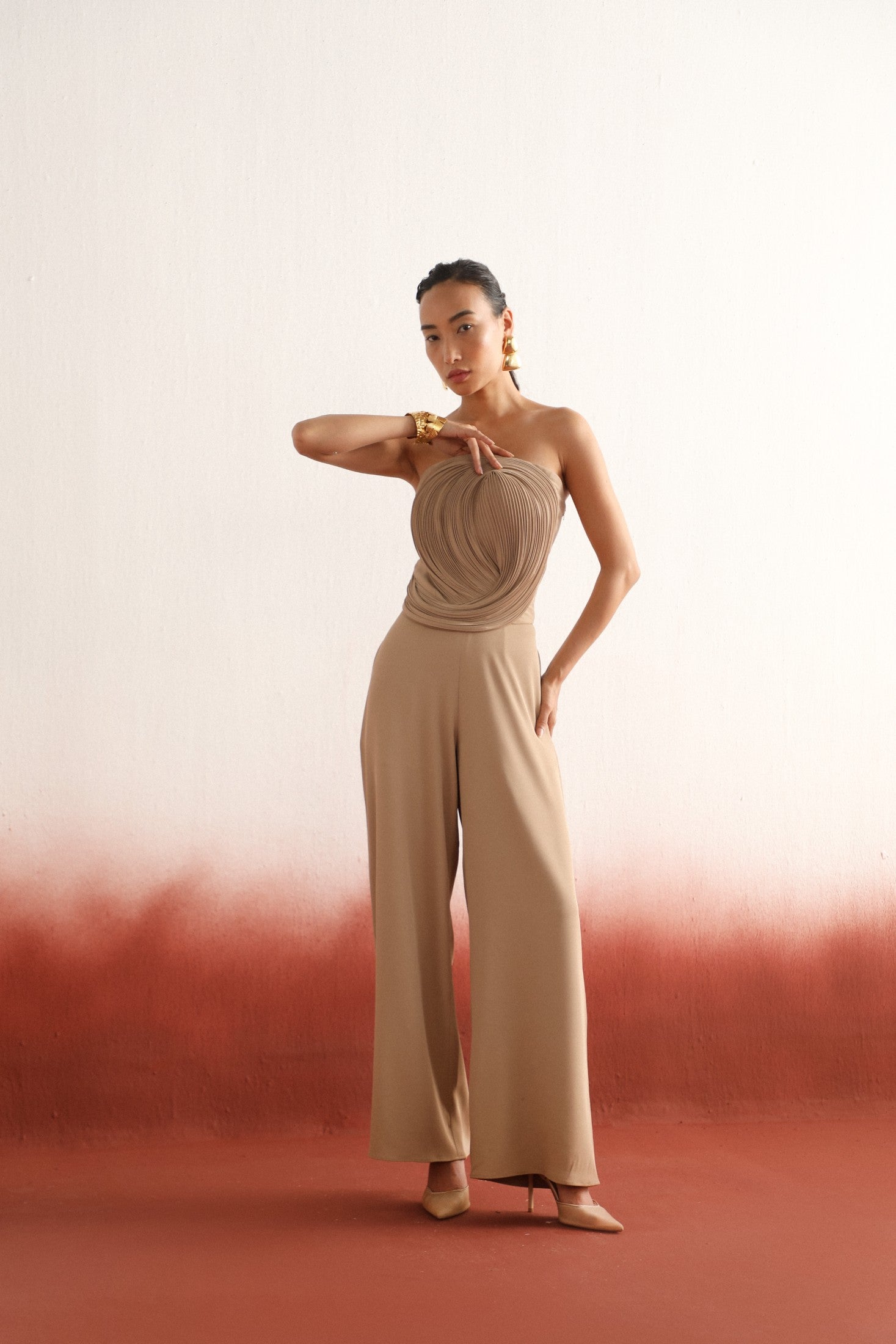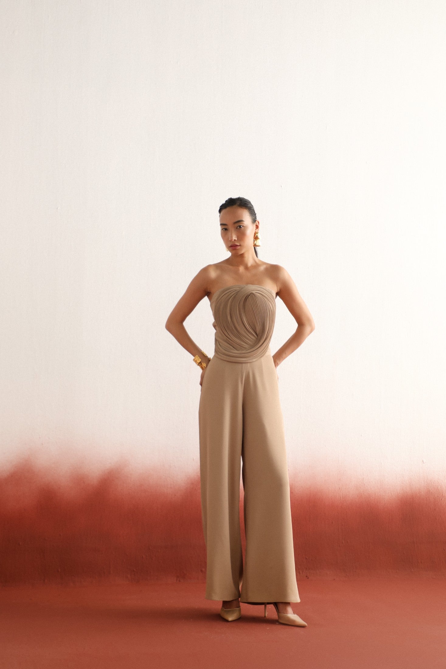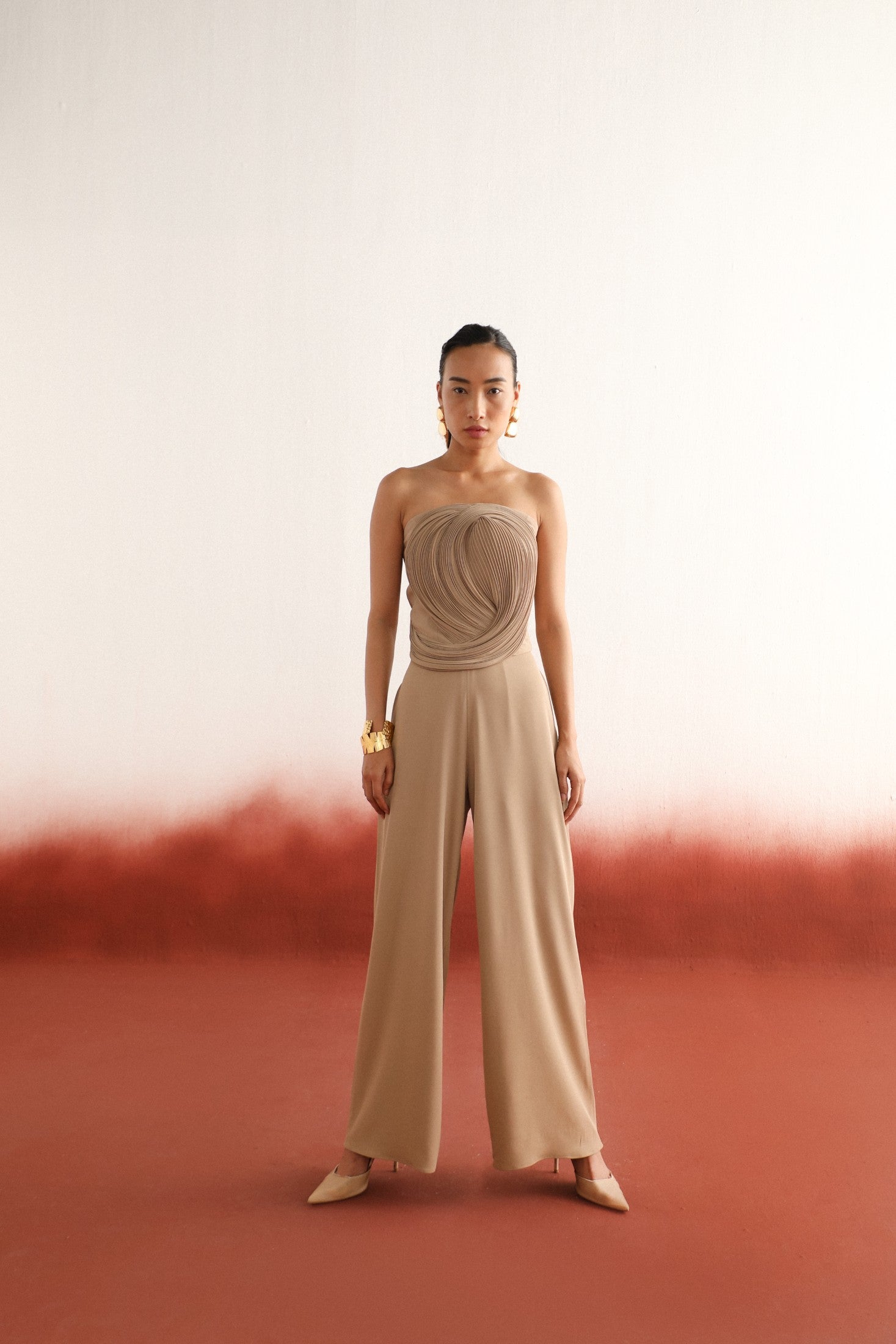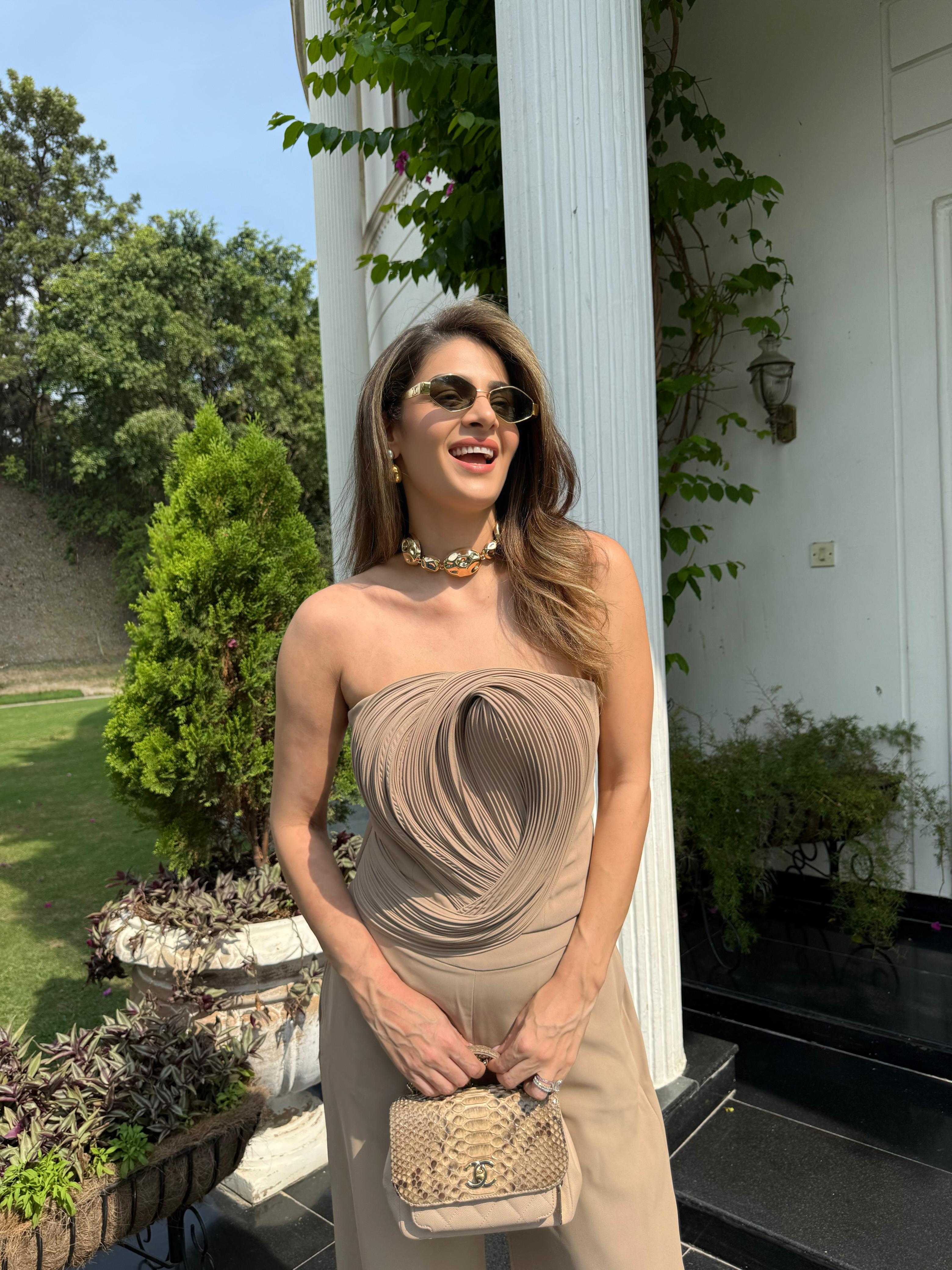 Bold and sculpted, this beige structured corset features a unique couch-inspired silhouette that adds an architectural edge to your look. Paired with tailored pants for a sleek finish, this ensemble is designed for elevated style and confident comfort — perfect for evenings out or standout fashion moments.