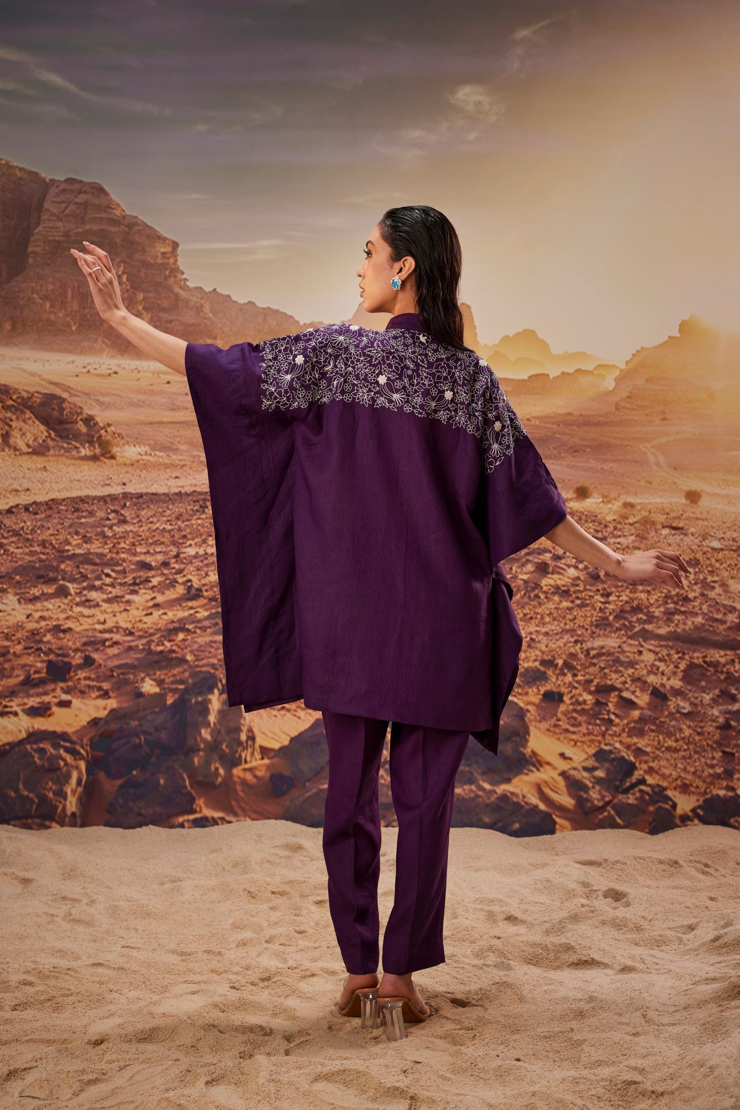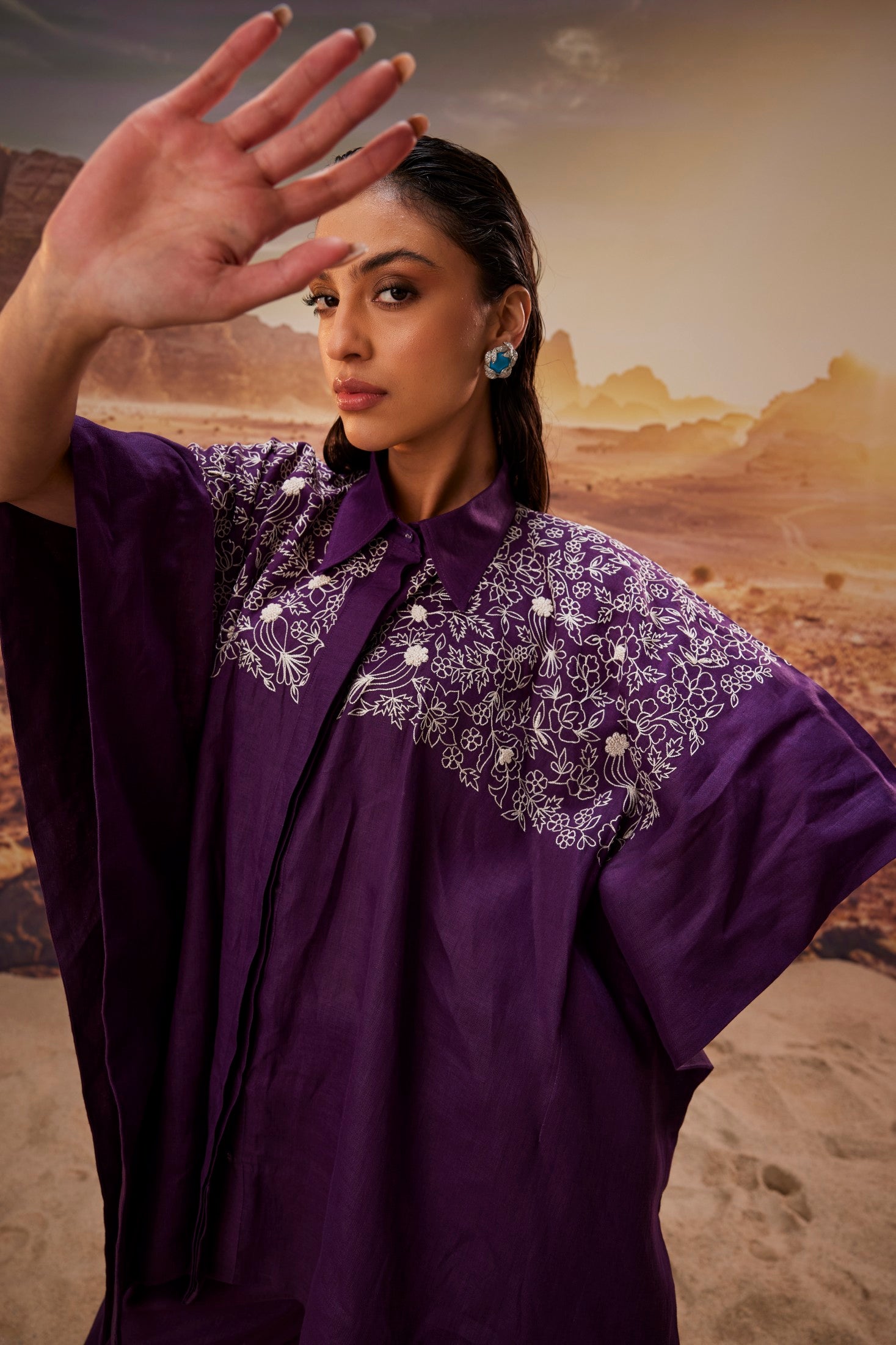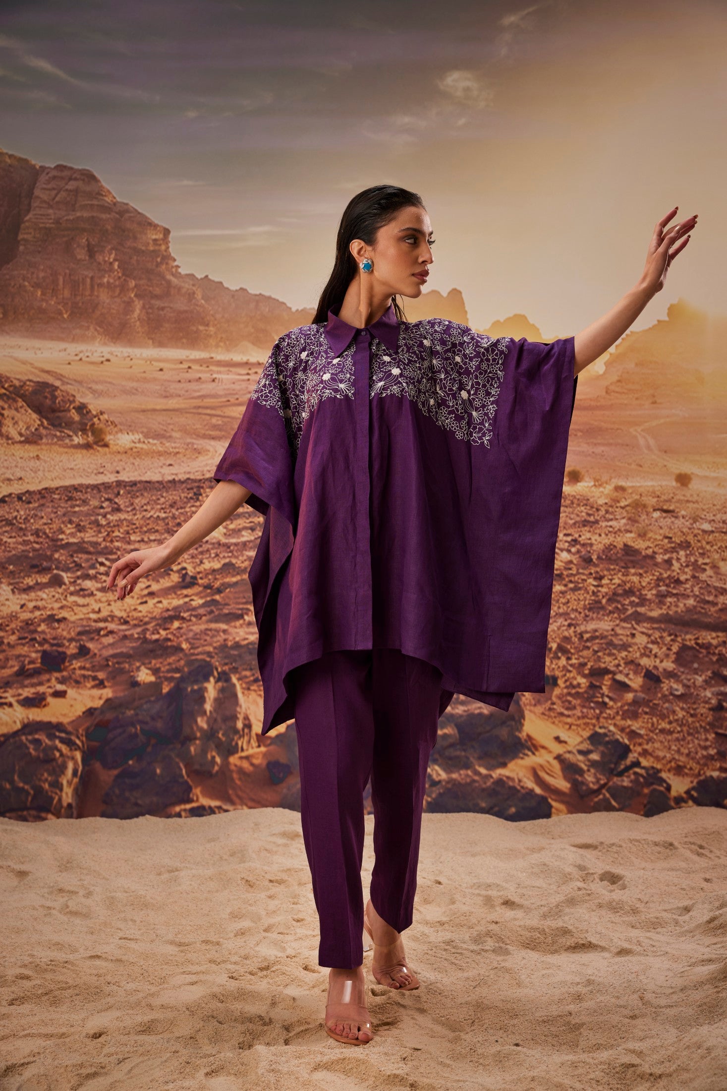 Breezy and elegant, this pure linen set features a relaxed purple kaftan-style shirt adorned with delicate off-white embroidery, paired with matching pants for a complete look. Designed for effortless style and all-day comfort, it’s perfect for casual gatherings, artistic outings, or understated festive wear.