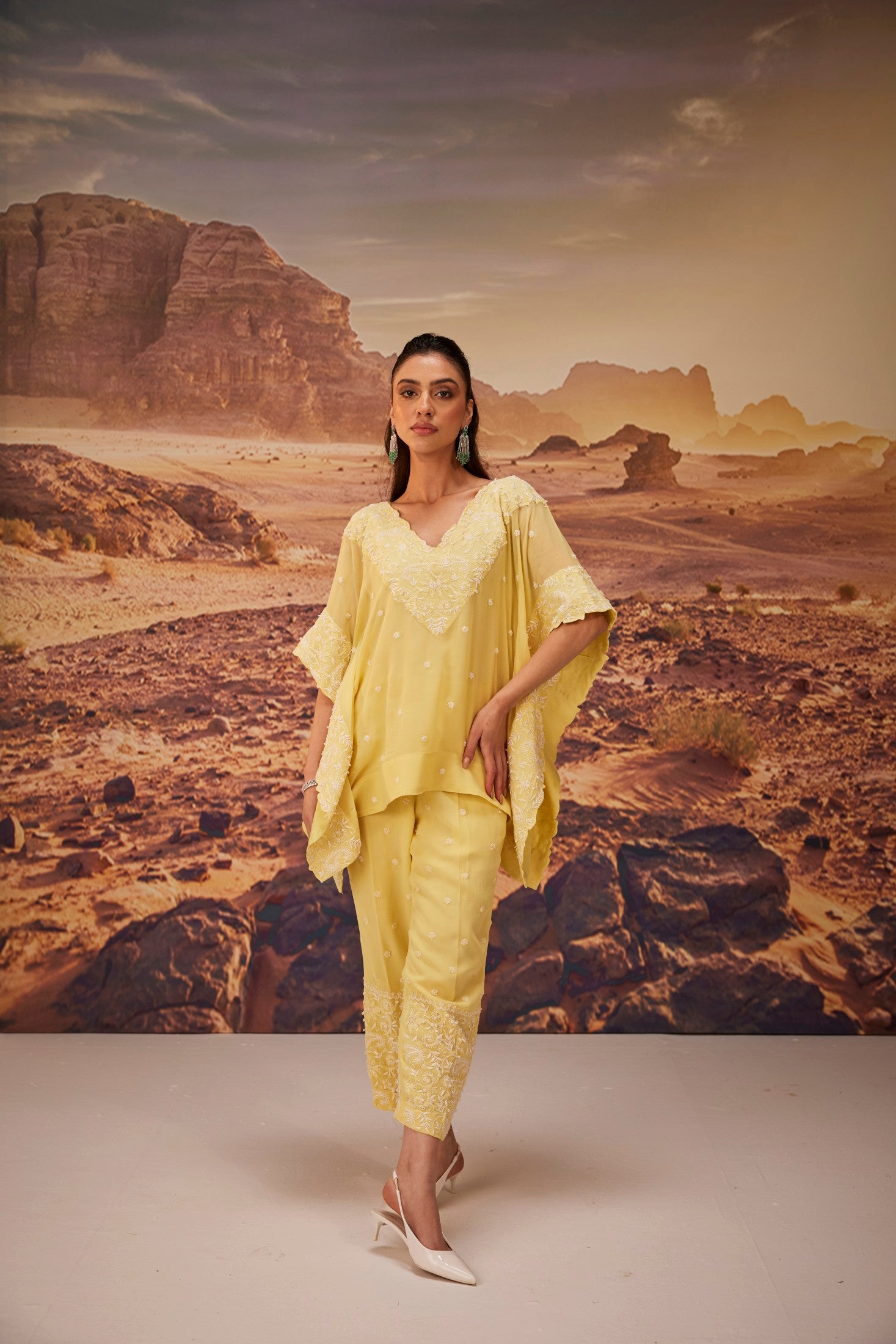 Yellow Chikankari & Embellished Short Kaftan Kurta with Pants
