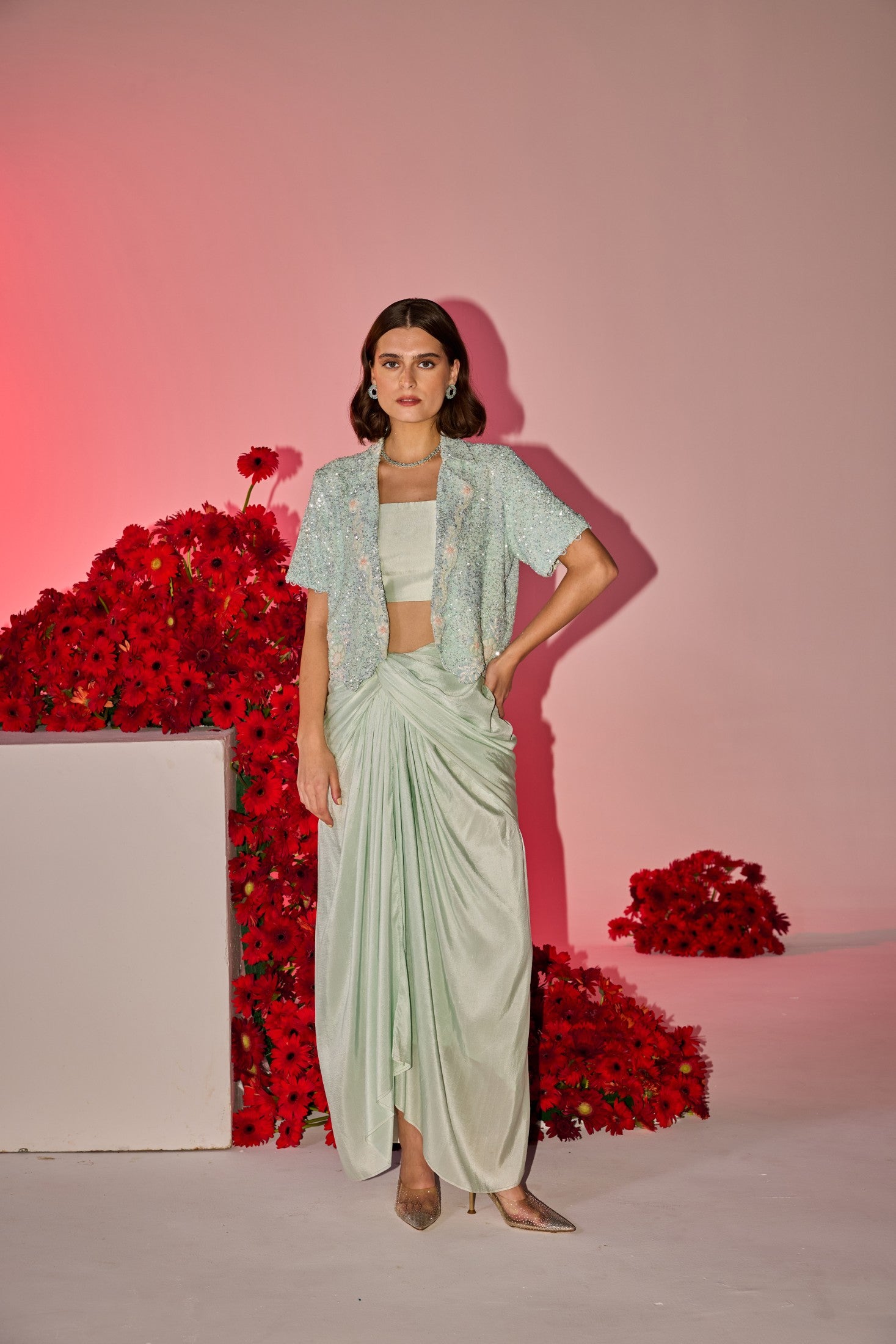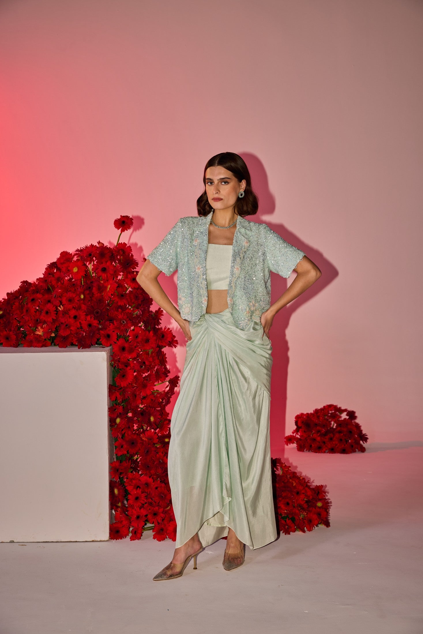 Mint Green Chikankari & Sequin Embroidered Short Jacket with Inner and Silk Pick-Up Skirt