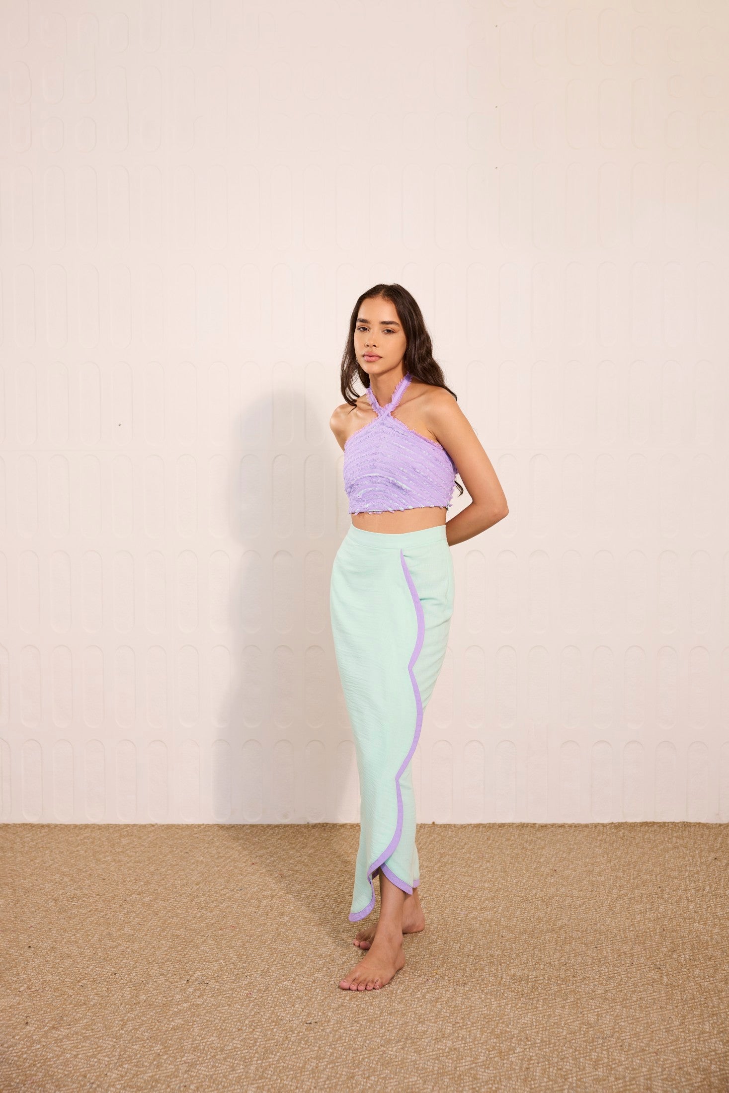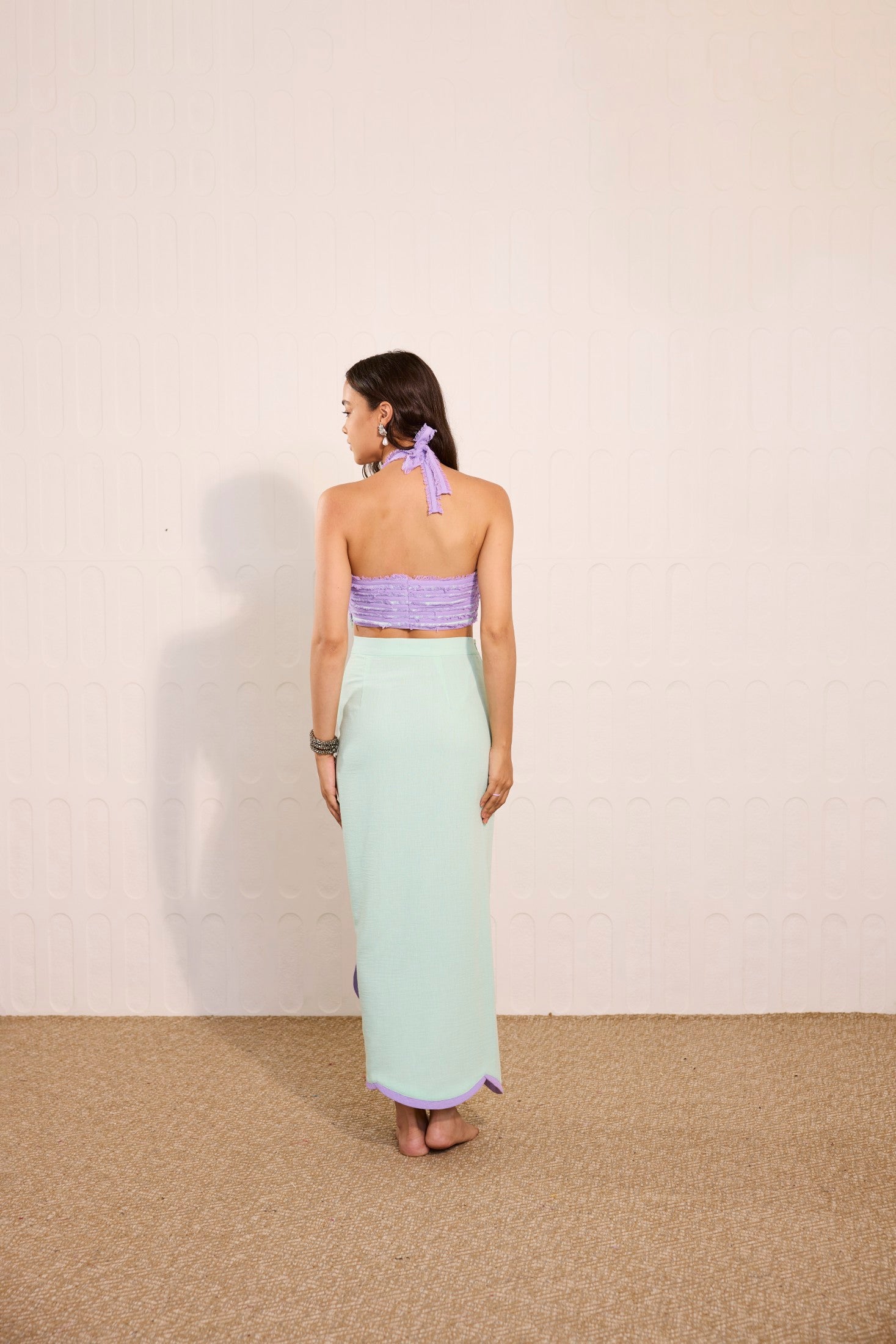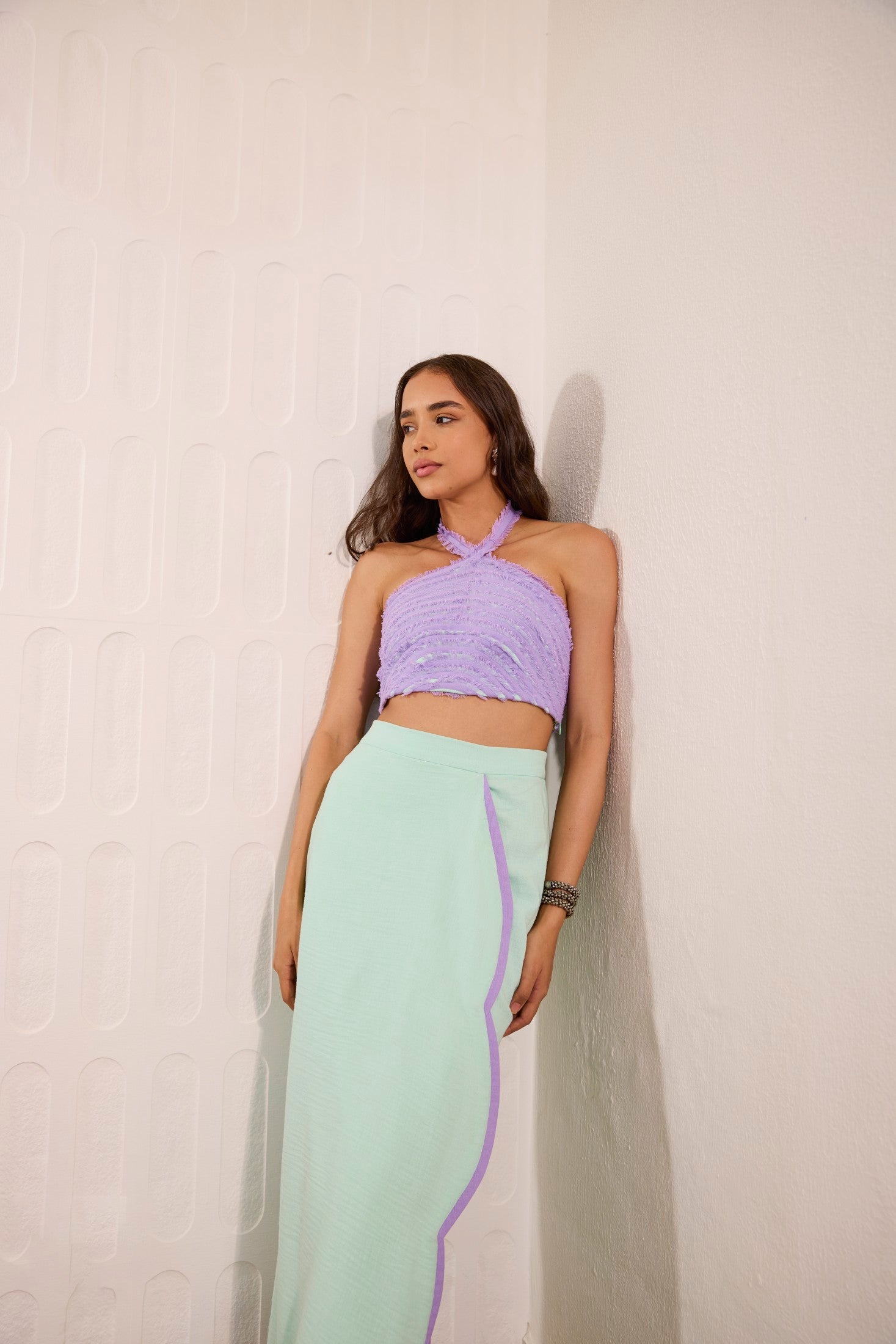 Whimsical and modern, this mint green overlay skirt features delicate lilac accents, perfectly paired with a cross-neck crop top adorned with playful lilac fringes. A vibrant fusion of pastel tones and striking textures, this look is ideal for daytime soirées, beachside parties, destination celebrations, or statement summer events.