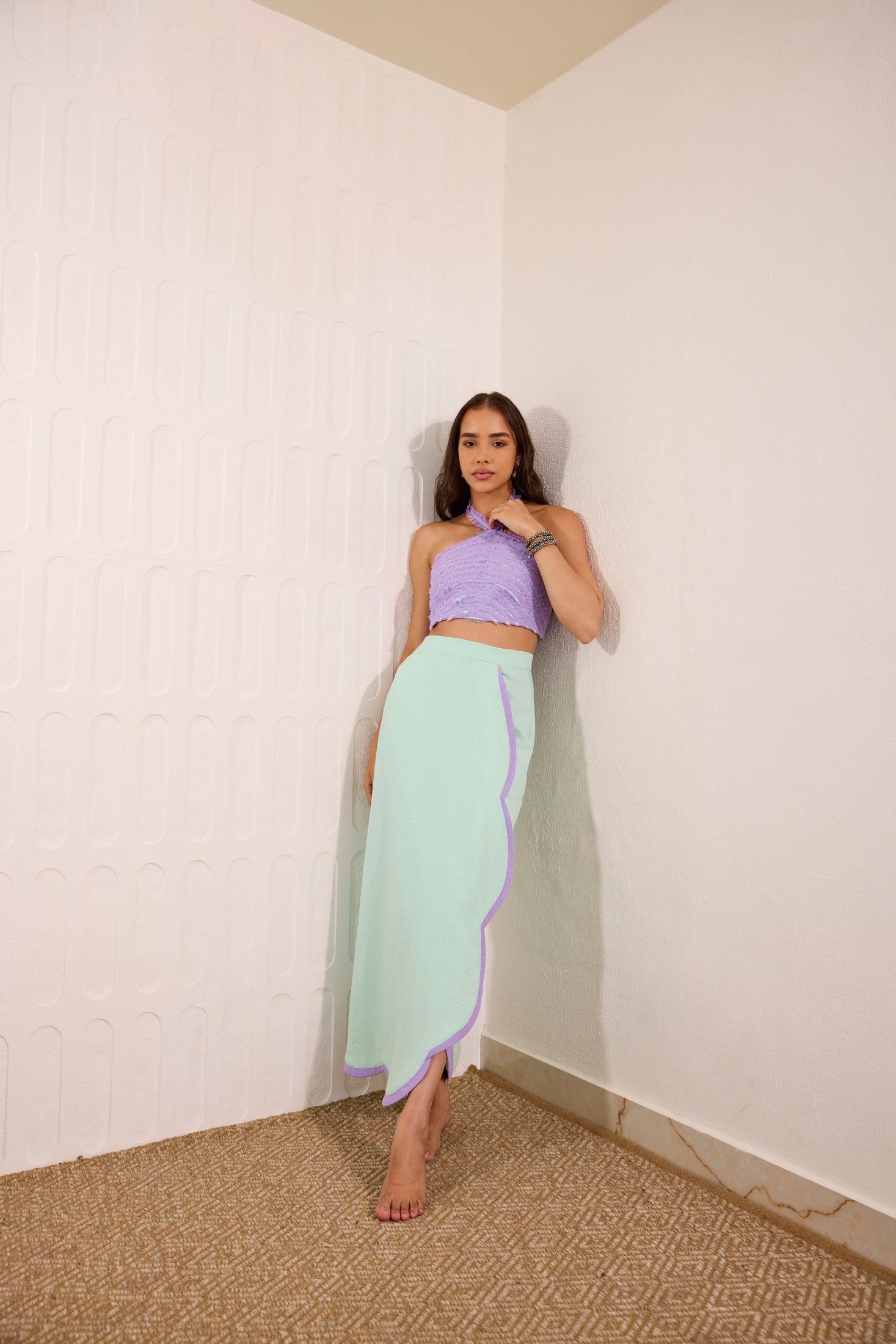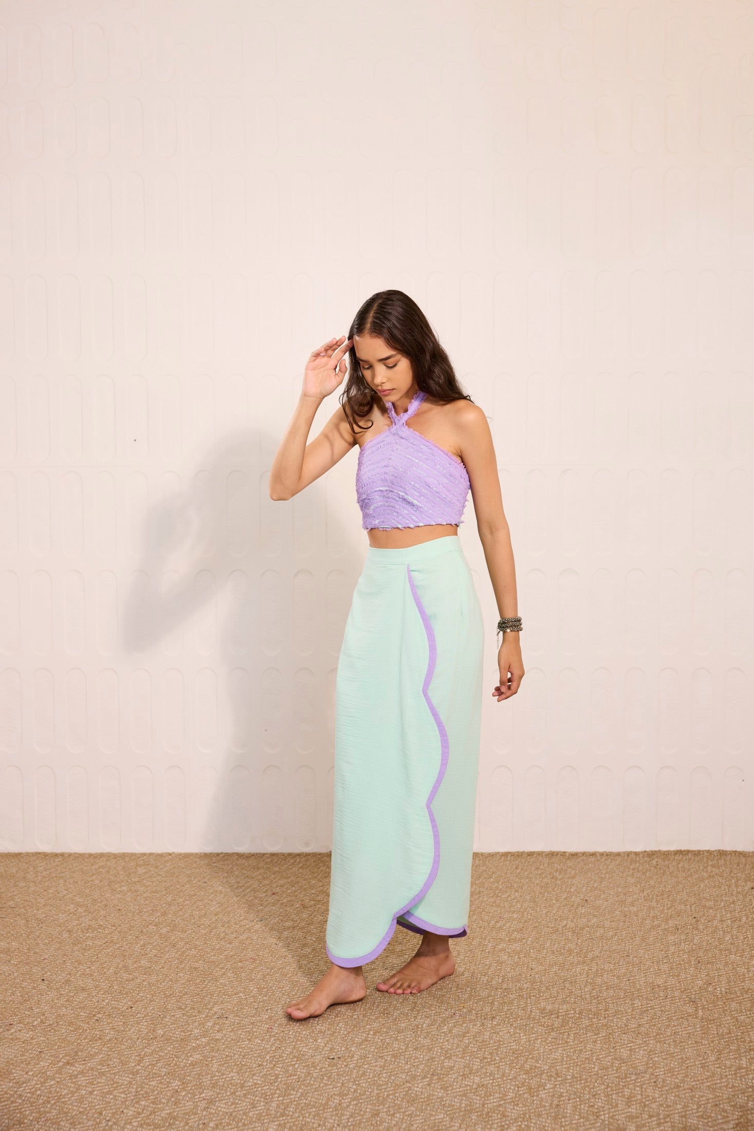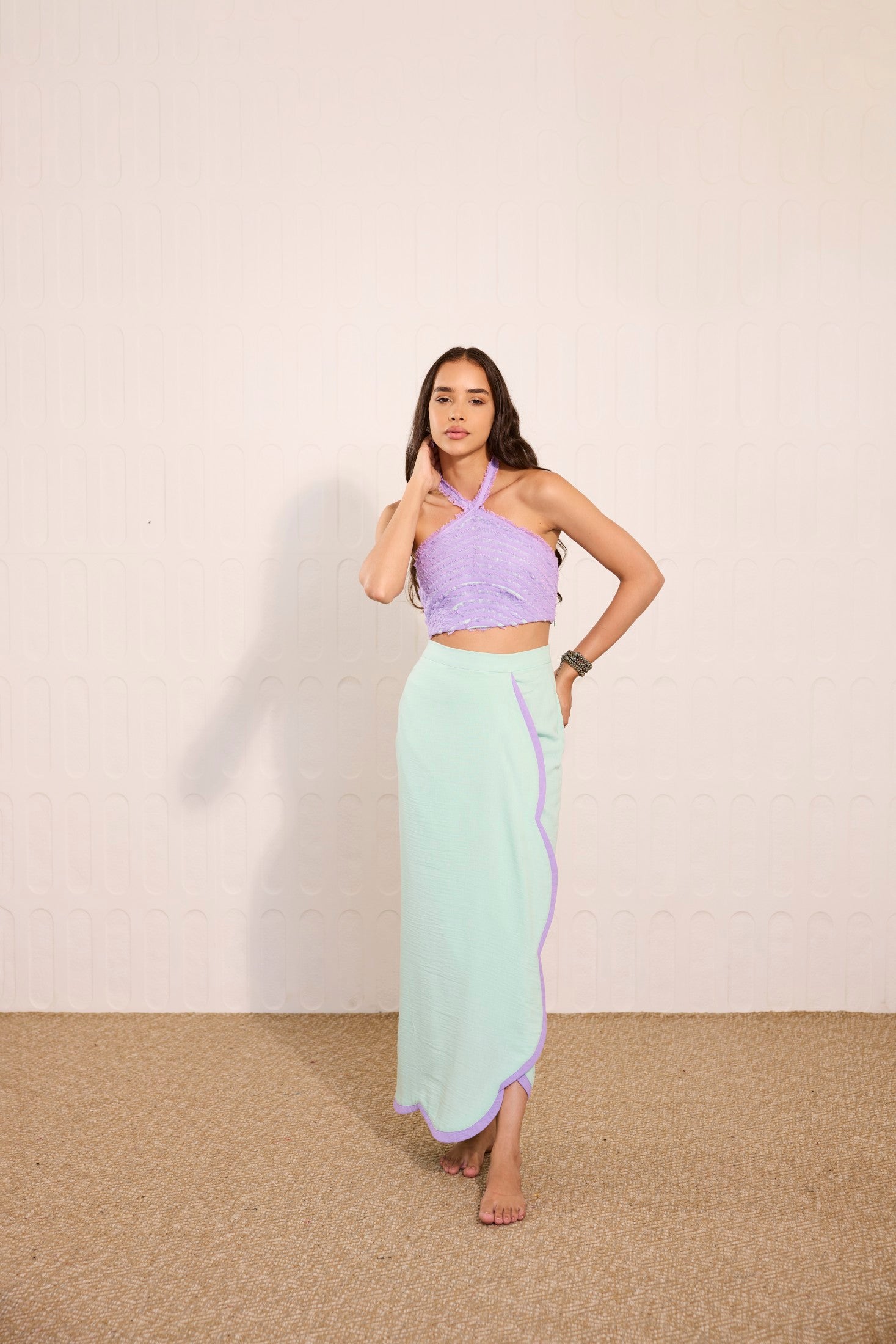 Whimsical and modern, this mint green overlay skirt features delicate lilac accents, perfectly paired with a cross-neck crop top adorned with playful lilac fringes. A vibrant fusion of pastel tones and striking textures, this look is ideal for daytime soirées, beachside parties, destination celebrations, or statement summer events.