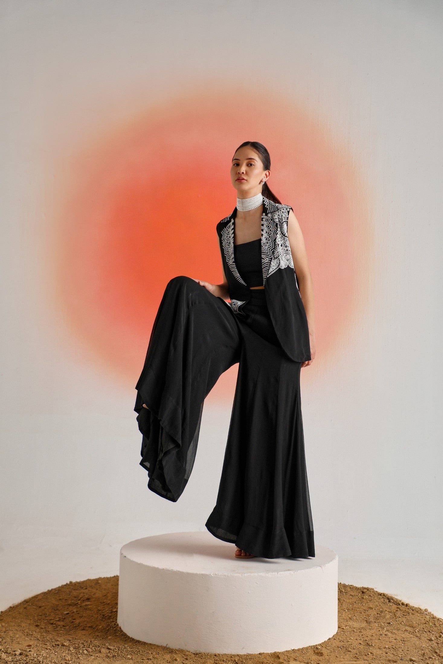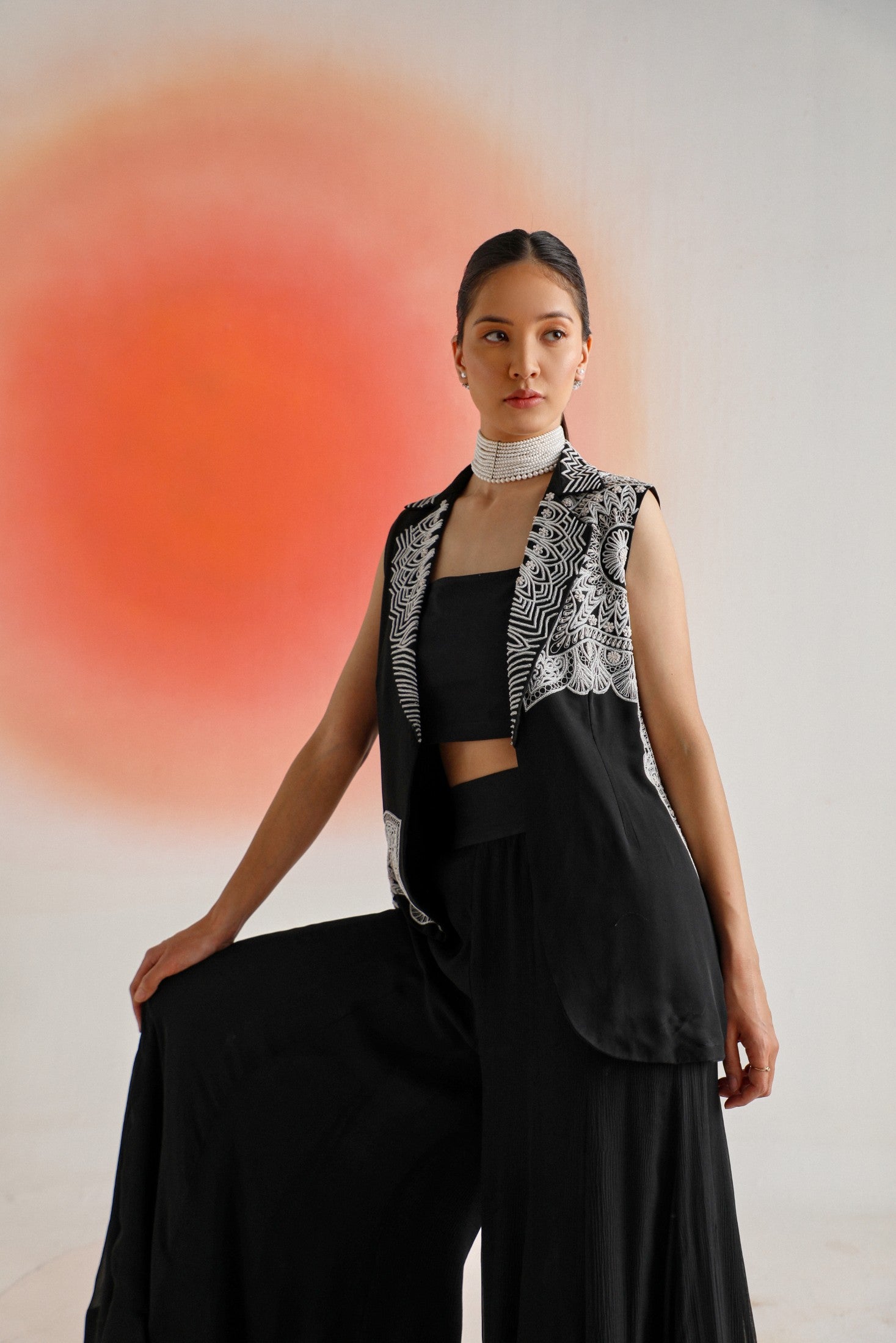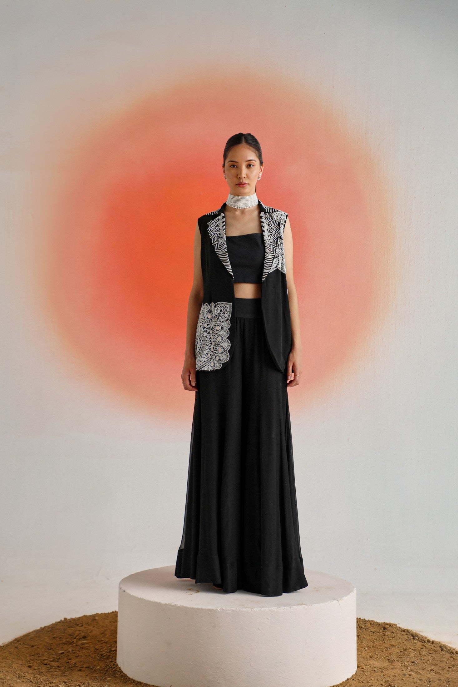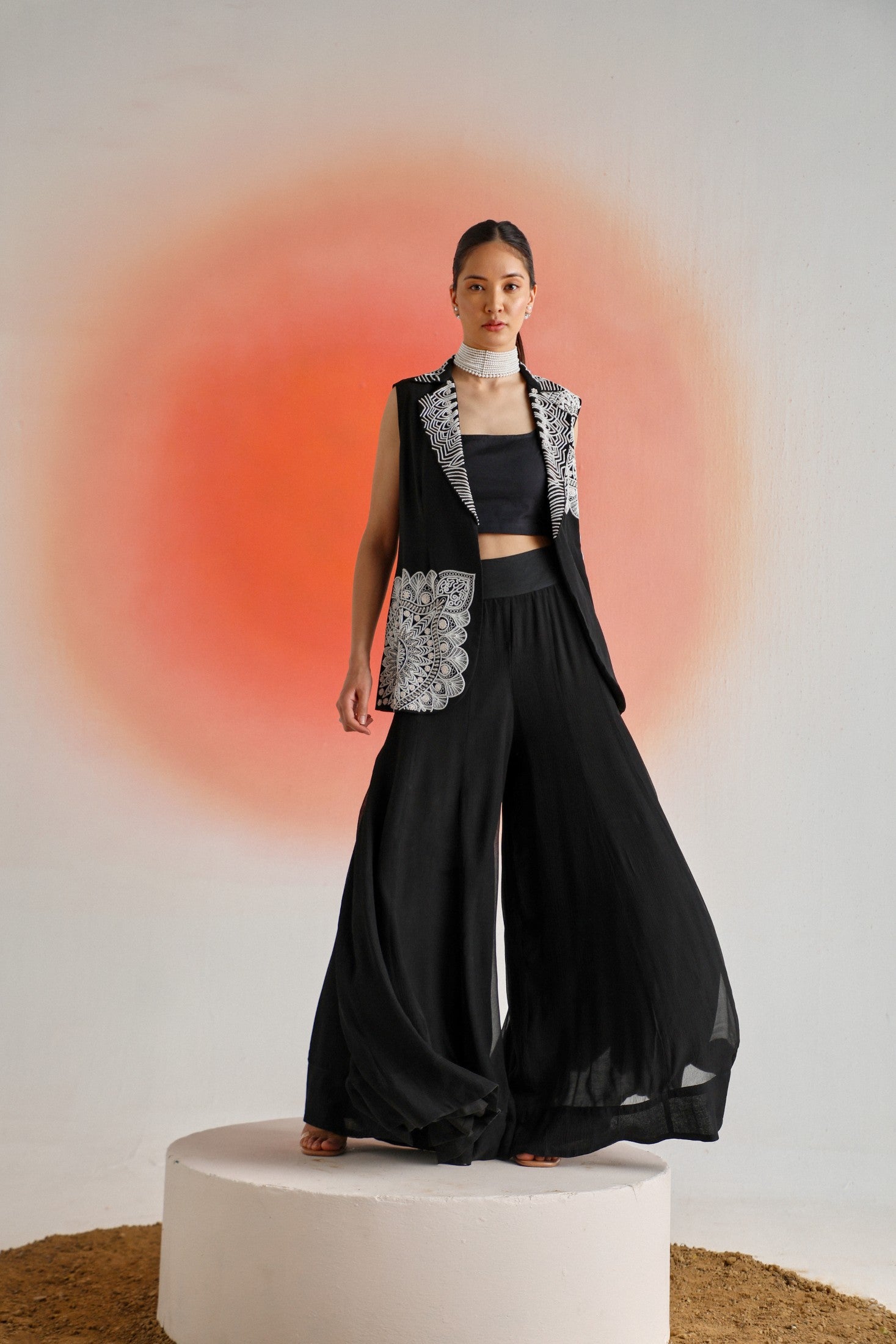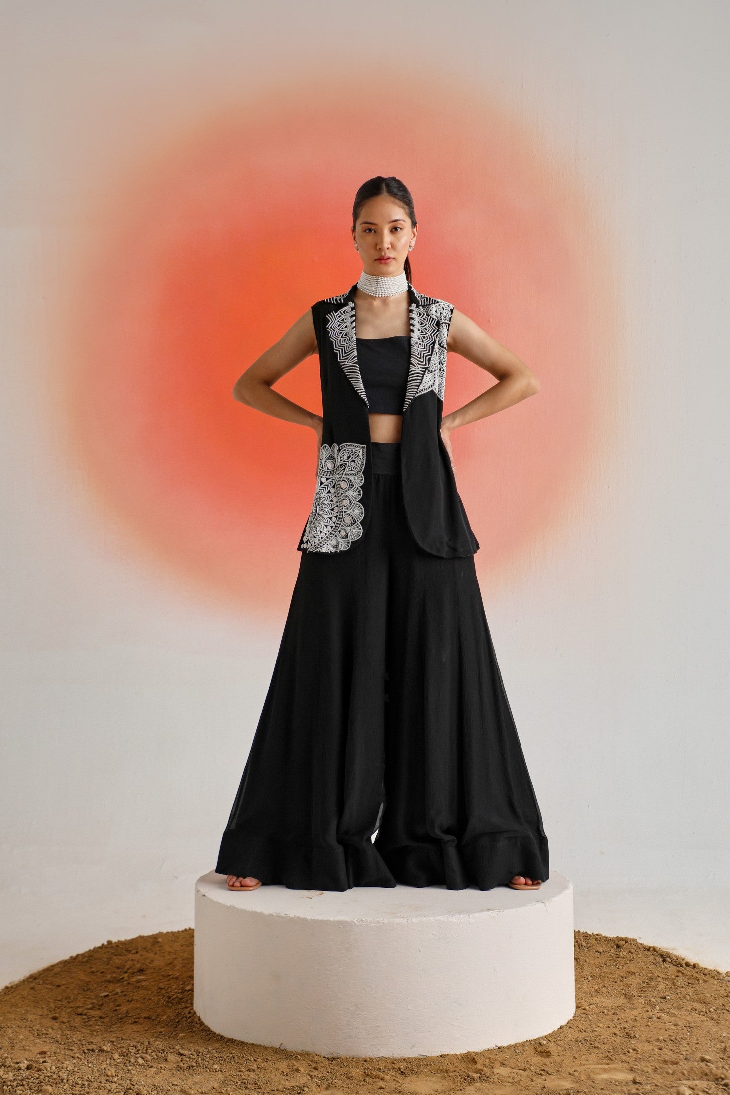 Chic and timeless, this black sleeveless jacket is adorned with intricate off-white placement embroidery, offering a striking contrast and refined detail. Paired with a plain inner and flowy chiffon sharara pants, the ensemble is thoughtfully designed for special occasions — blending elegance, comfort, and contemporary appeal.
