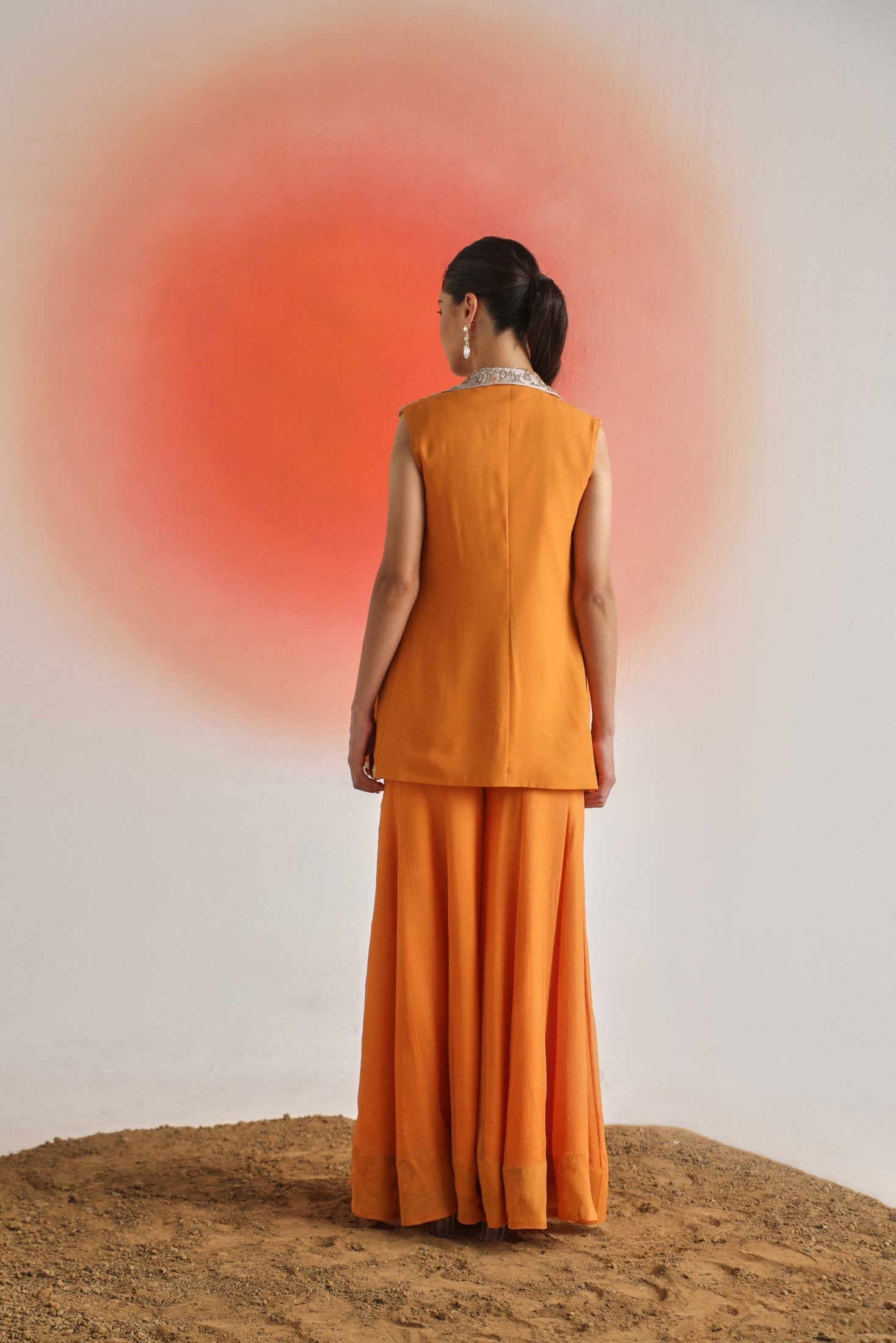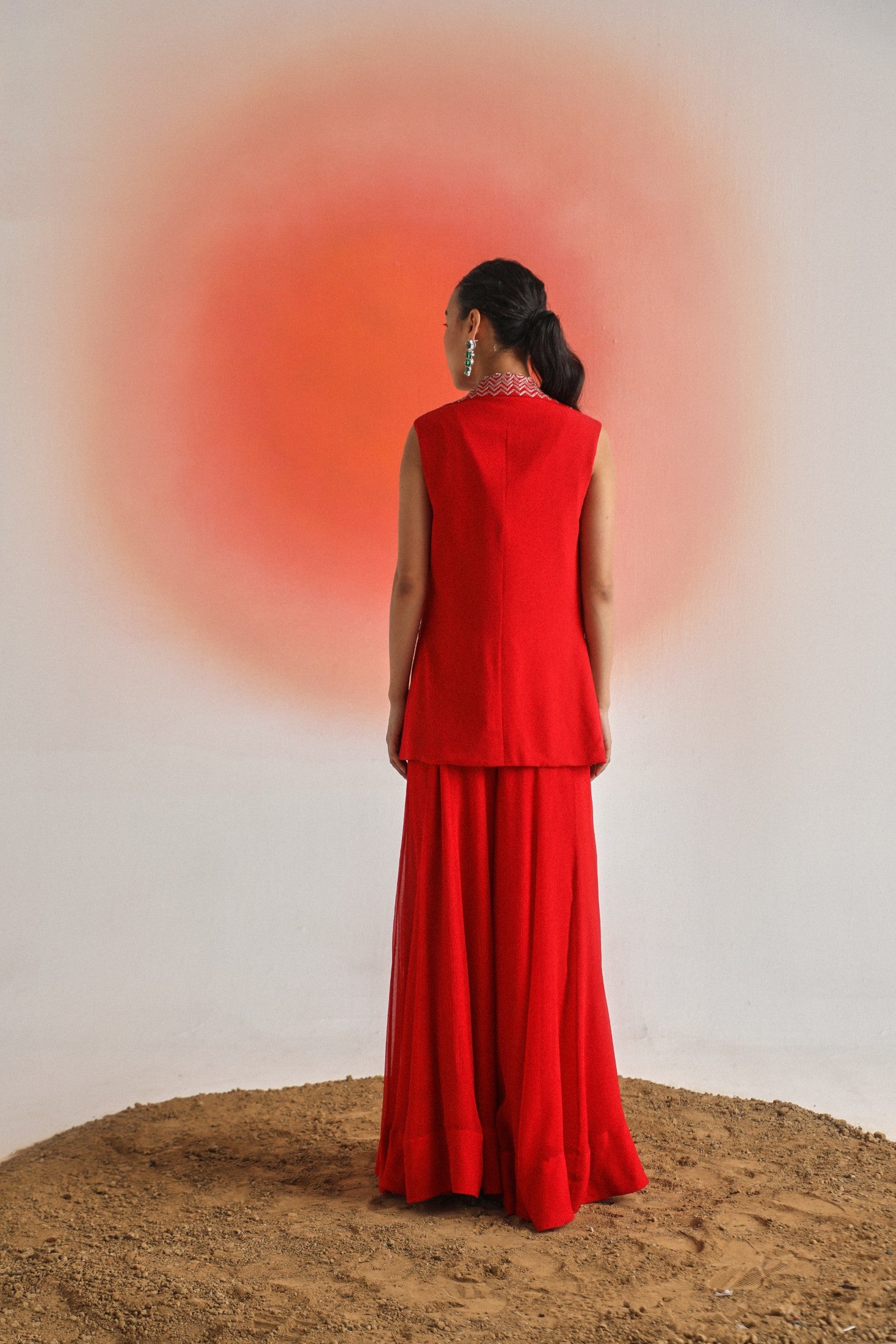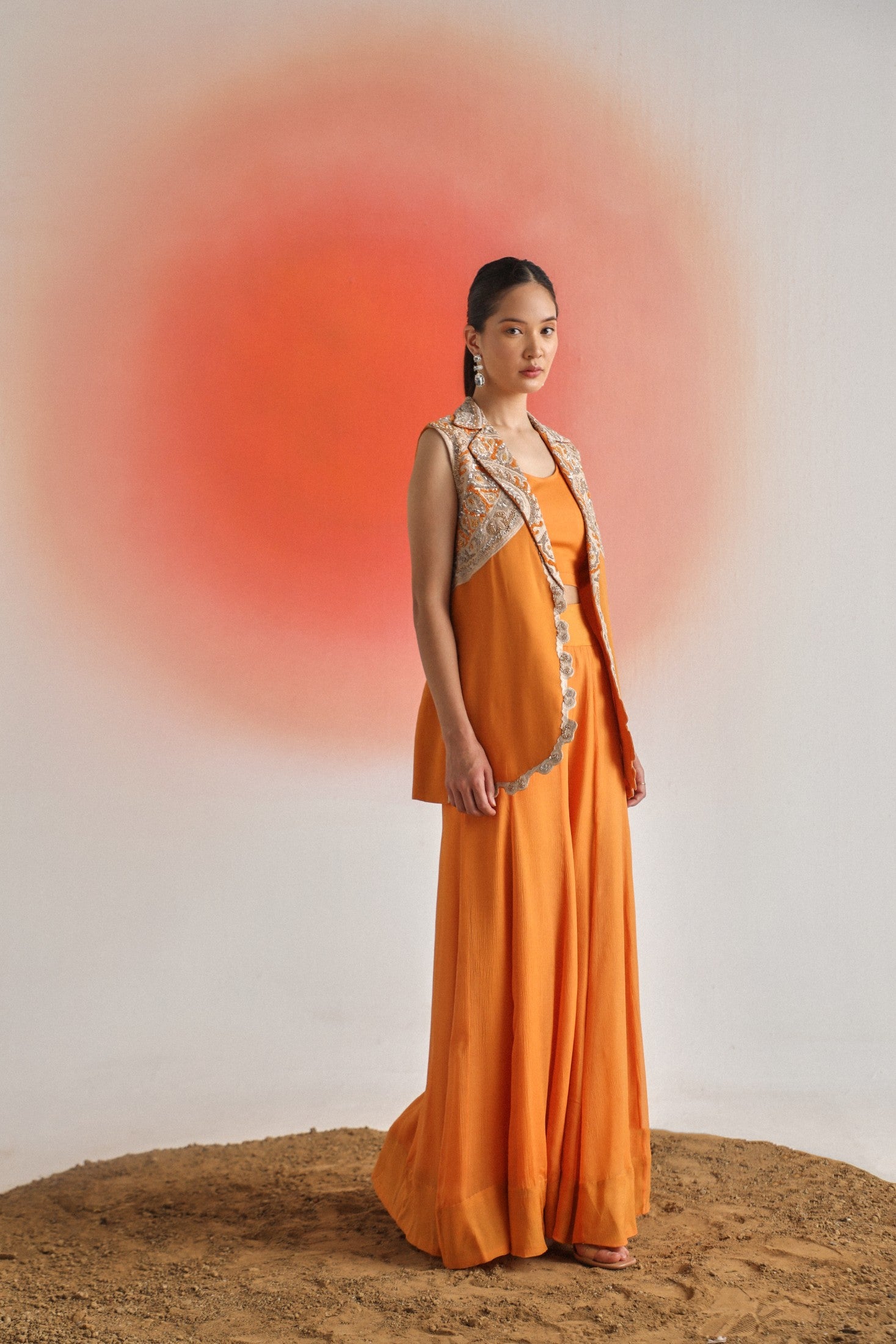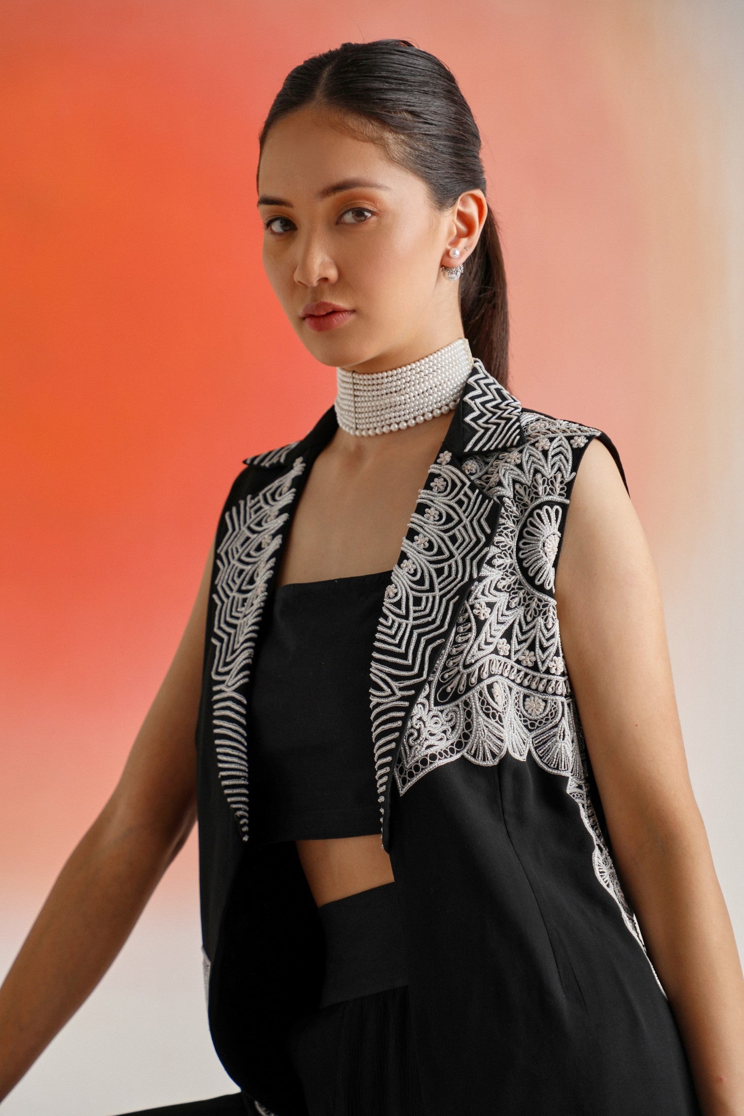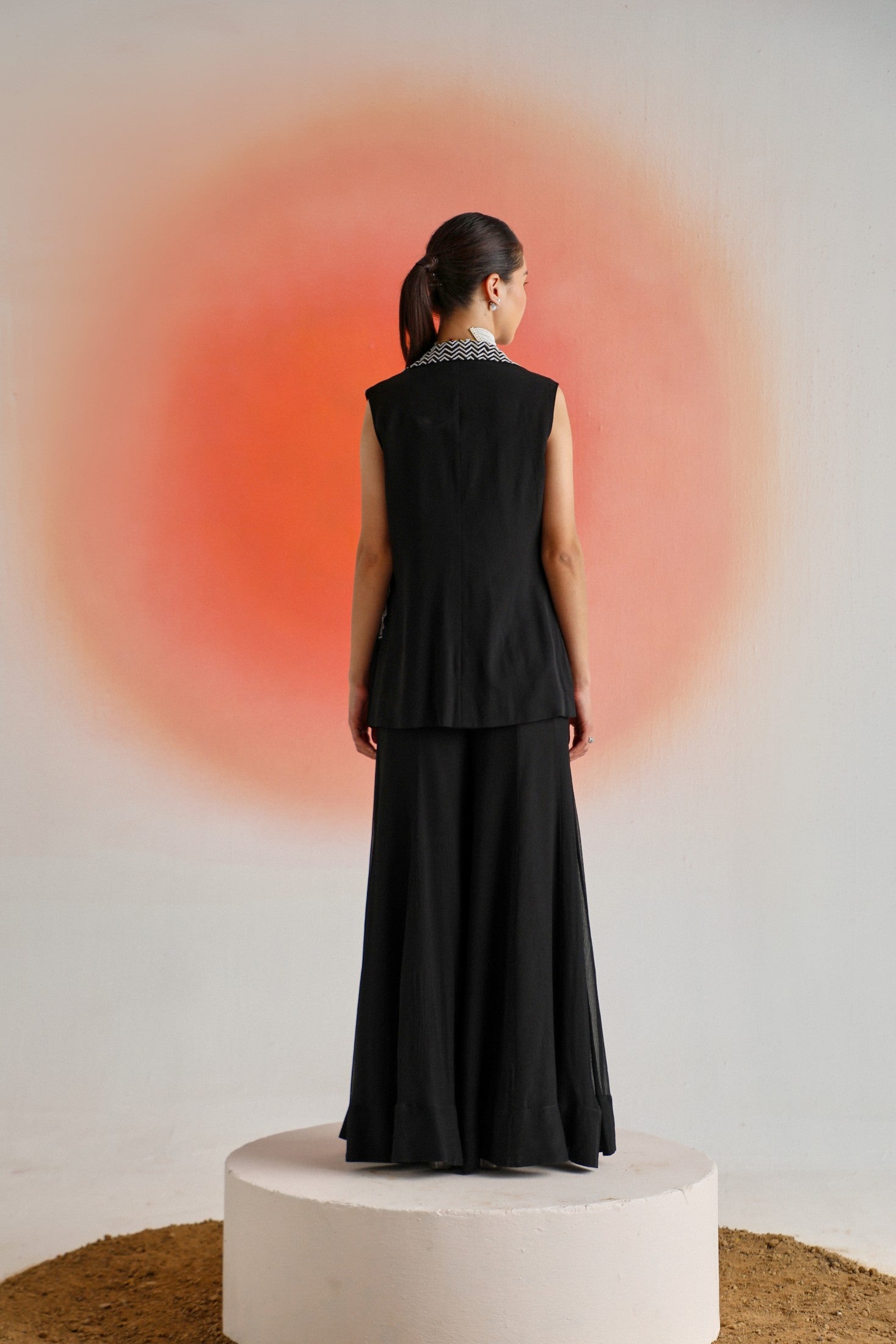 Chic and timeless, this black sleeveless jacket is adorned with intricate off-white placement embroidery, offering a striking contrast and refined detail. Paired with a plain inner and flowy chiffon sharara pants, the ensemble is thoughtfully designed for special occasions — blending elegance, comfort, and contemporary appeal.