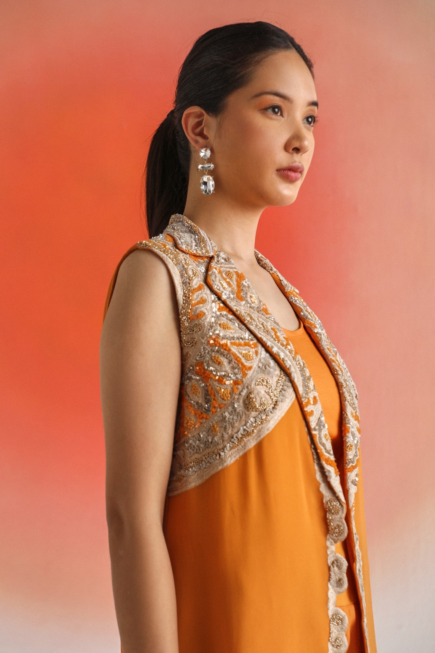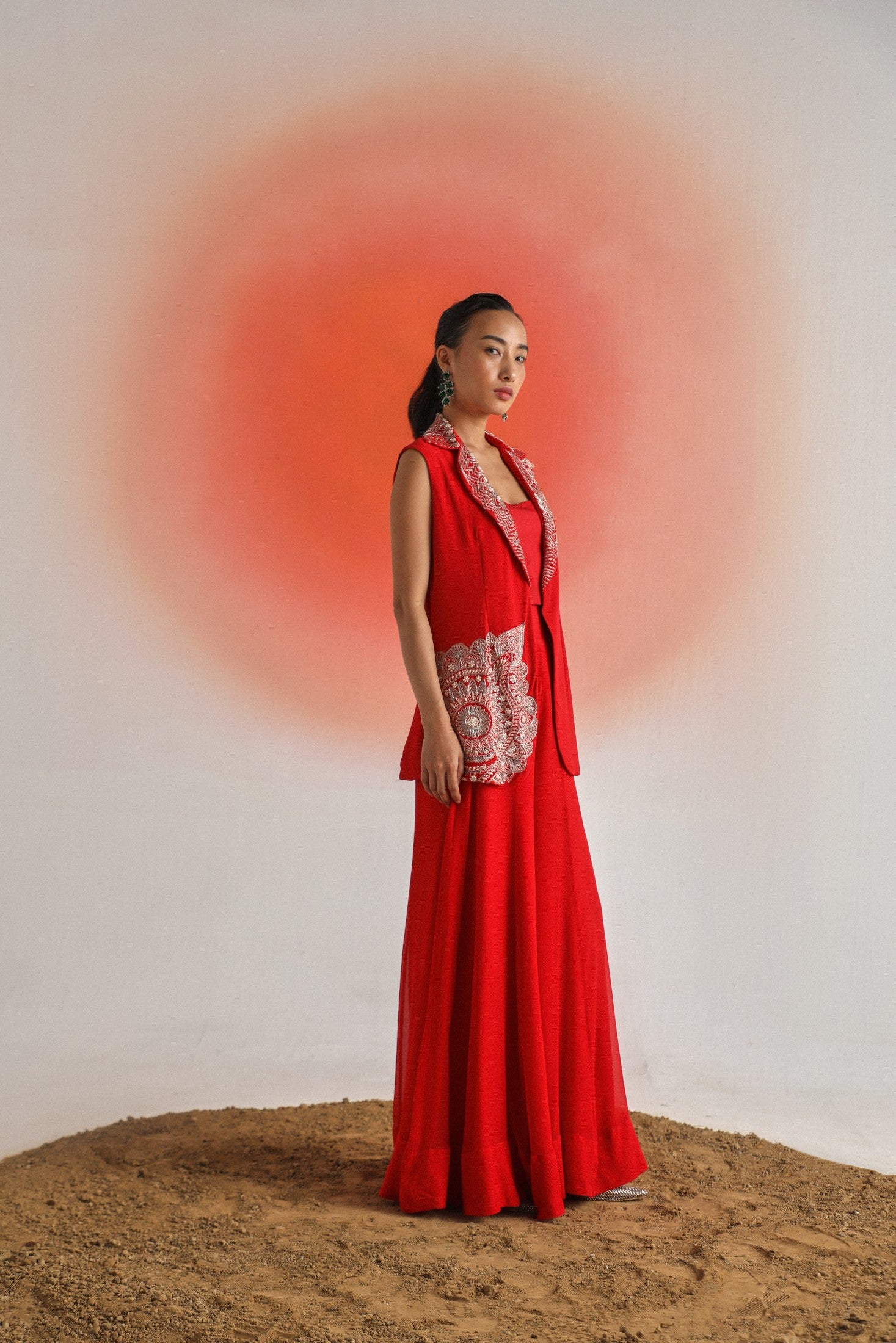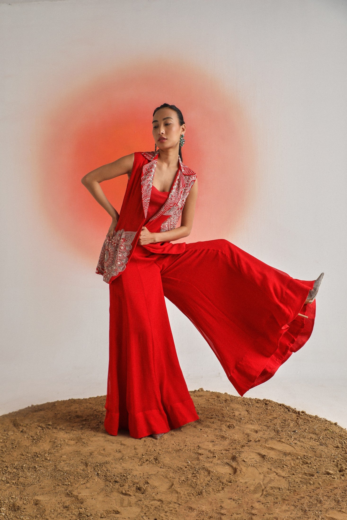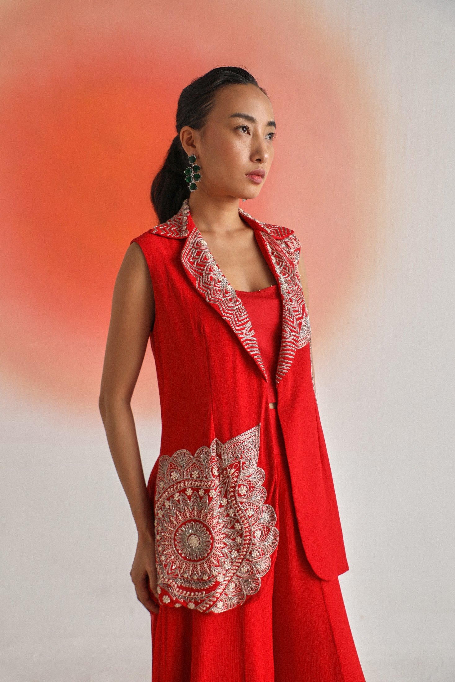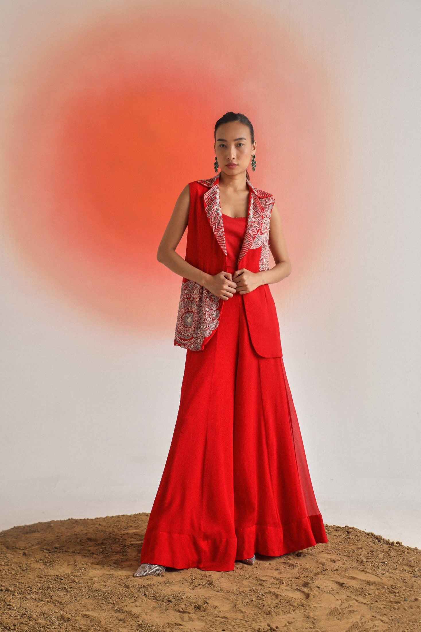 Chic and timeless, this black sleeveless jacket is adorned with intricate off-white placement embroidery, offering a striking contrast and refined detail. Paired with a plain inner and flowy chiffon sharara pants, the ensemble is thoughtfully designed for special occasions — blending elegance, comfort, and contemporary appeal.
