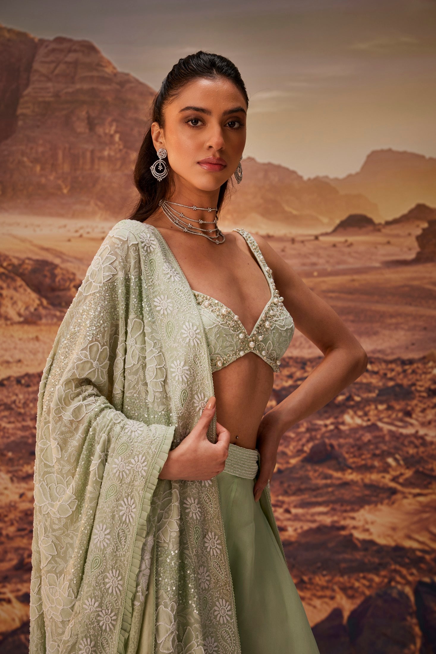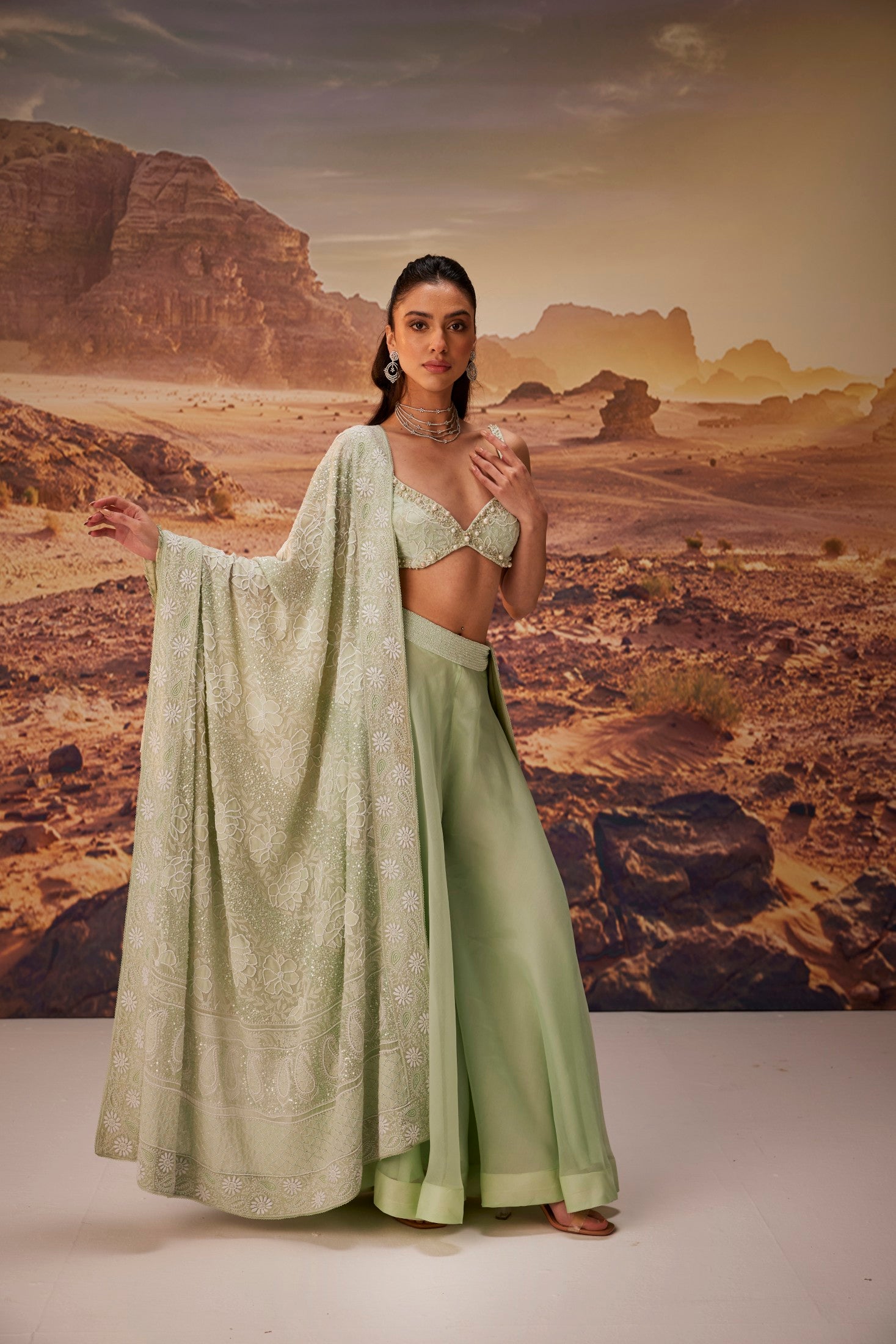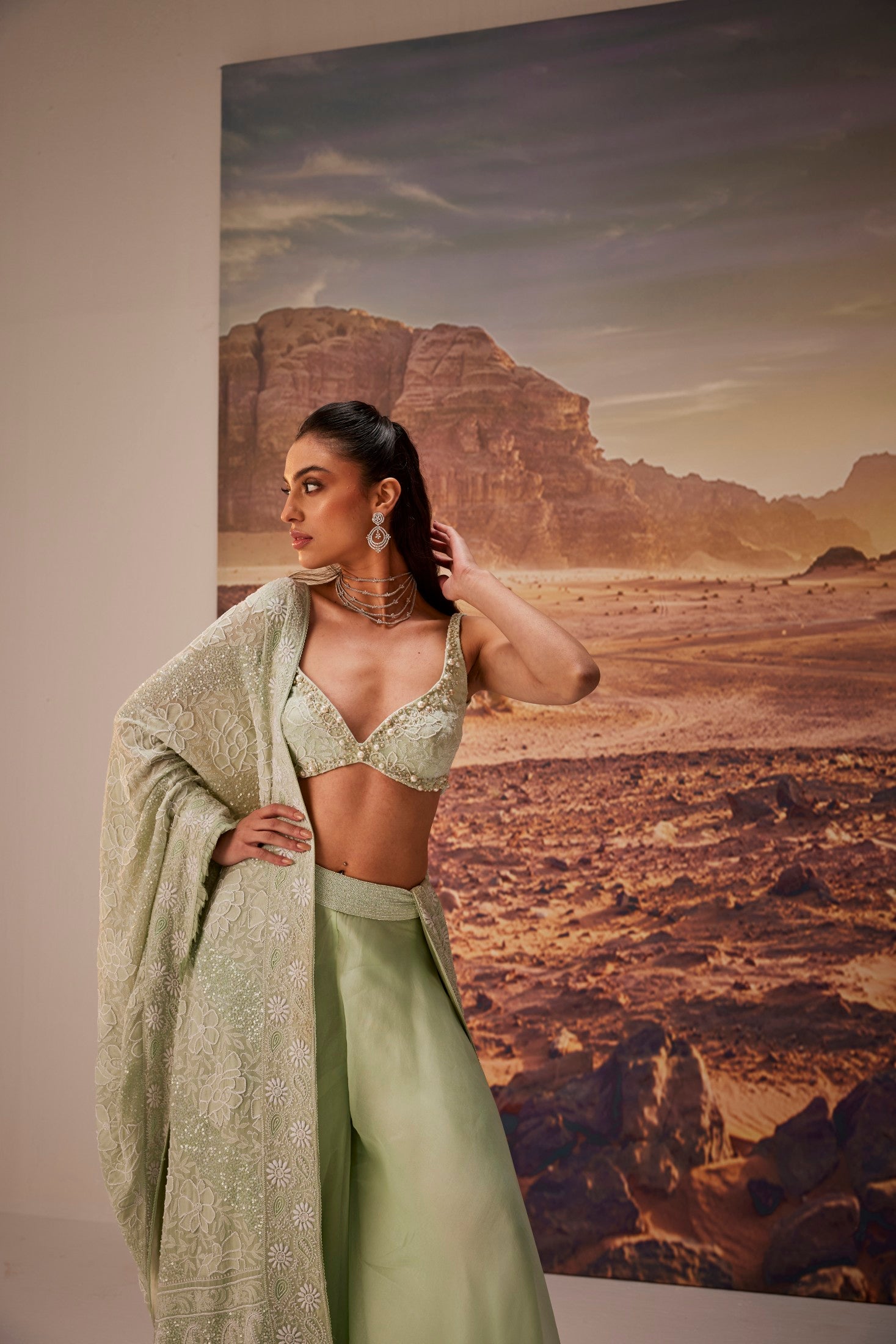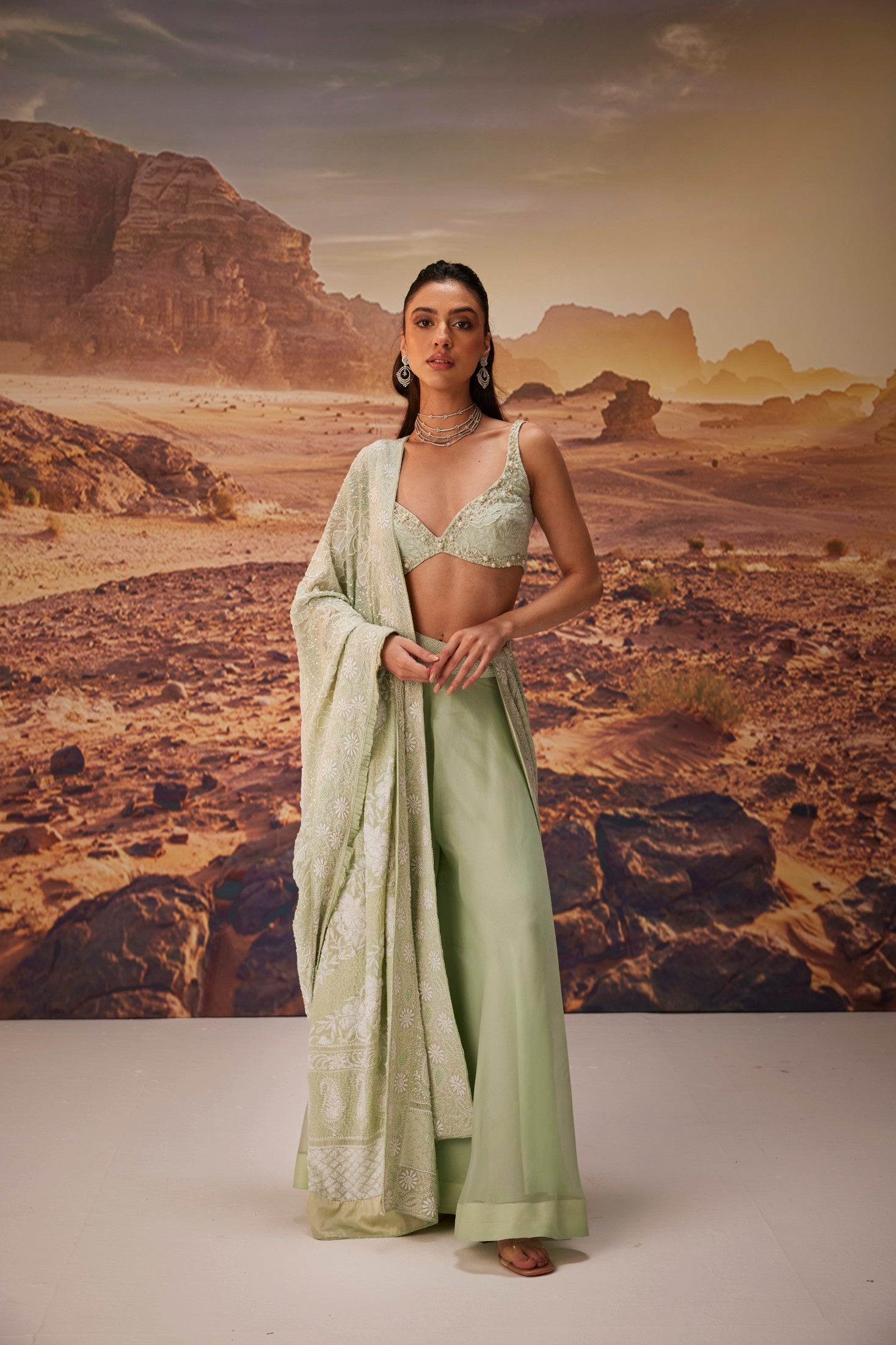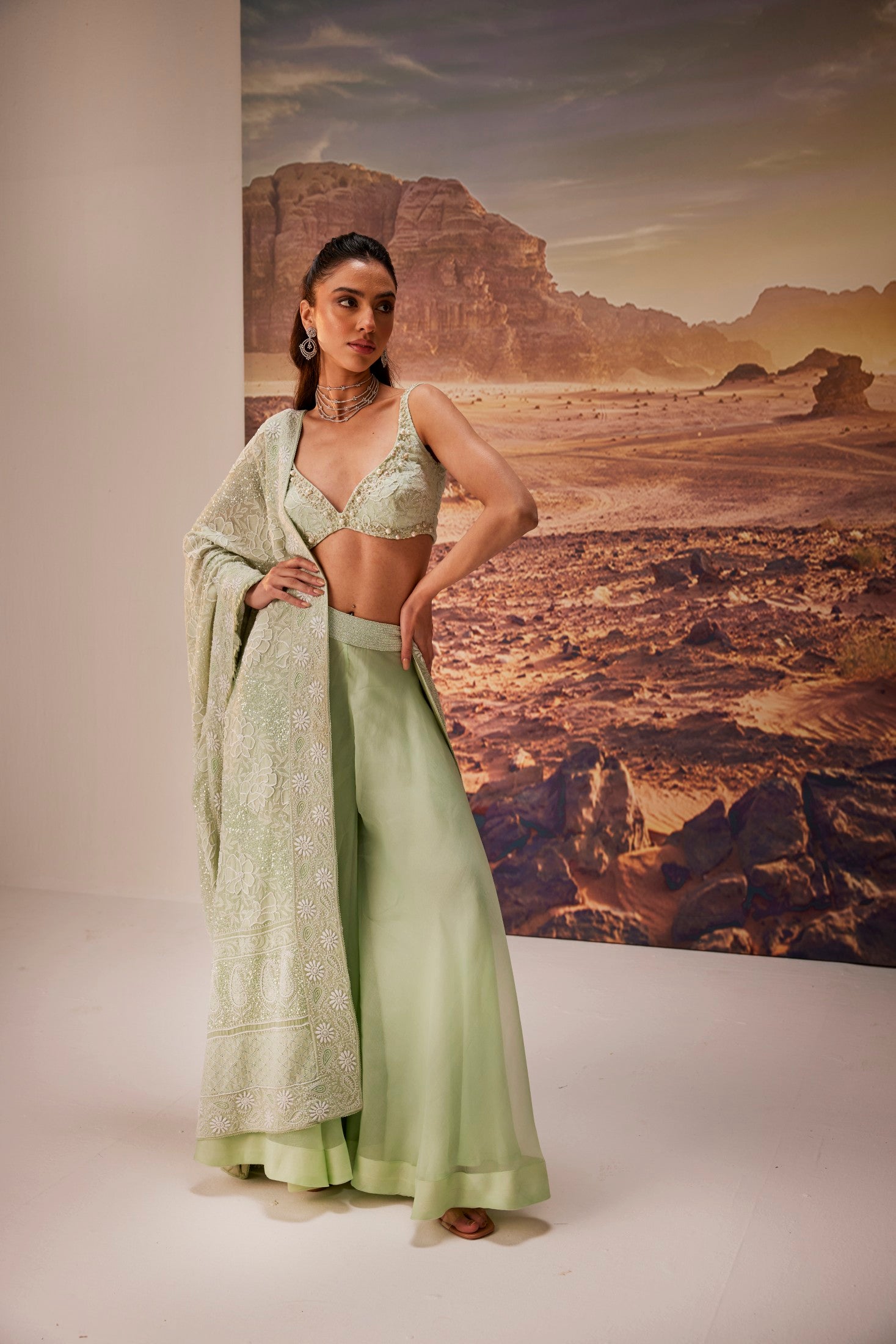 Sea Green Chikankari & Embellished Jaal Dupatta with Bustier & Organza Sharara