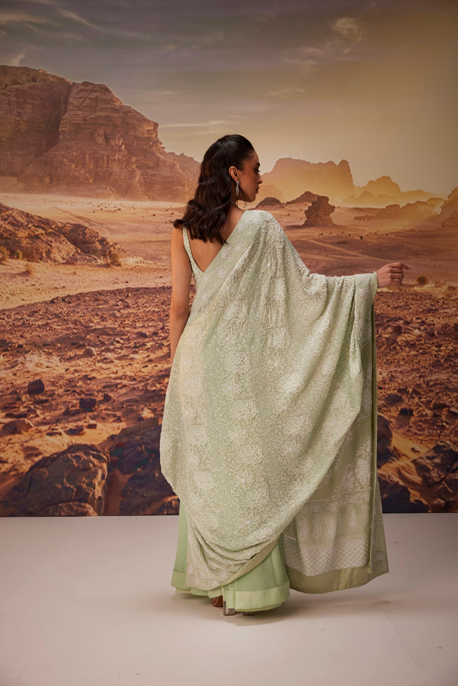 Gracefully crafted, this sea green ensemble features an intricately hand-embroidered chikankari georgette dupatta with all-over embellished jaal work. Paired with a chic bustier and flowing organza sharara, the set blends traditional craftsmanship with modern charm — perfect for festive occasions, weddings, or elegant evening celebrations.