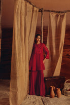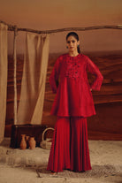 Bathed in the passionate hue of red, this ensemble exudes effortless elegance and refined craftsmanship. Delicate organza embroidery graces the neckline and sleeves of the kurta, creating a subtle shimmer that catches the eye with every movement. Paired with flowing sharara pants, the outfit balances structured grace with ethereal fluidity. Perfect for festive celebrations, weddings, or evening soirées, this ensemble celebrates timeless artistry, where each thread and fold becomes a story of sophistication and poise.