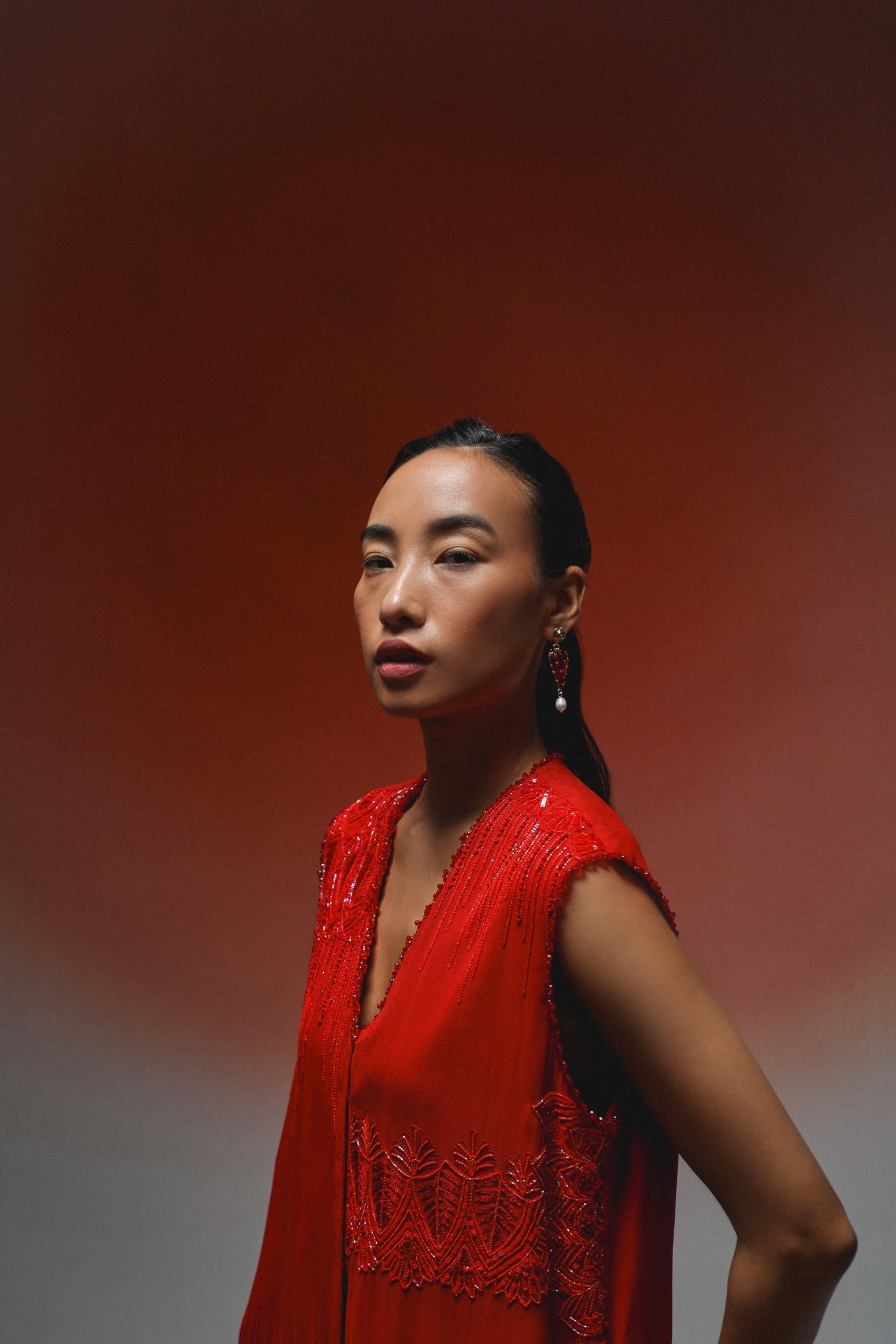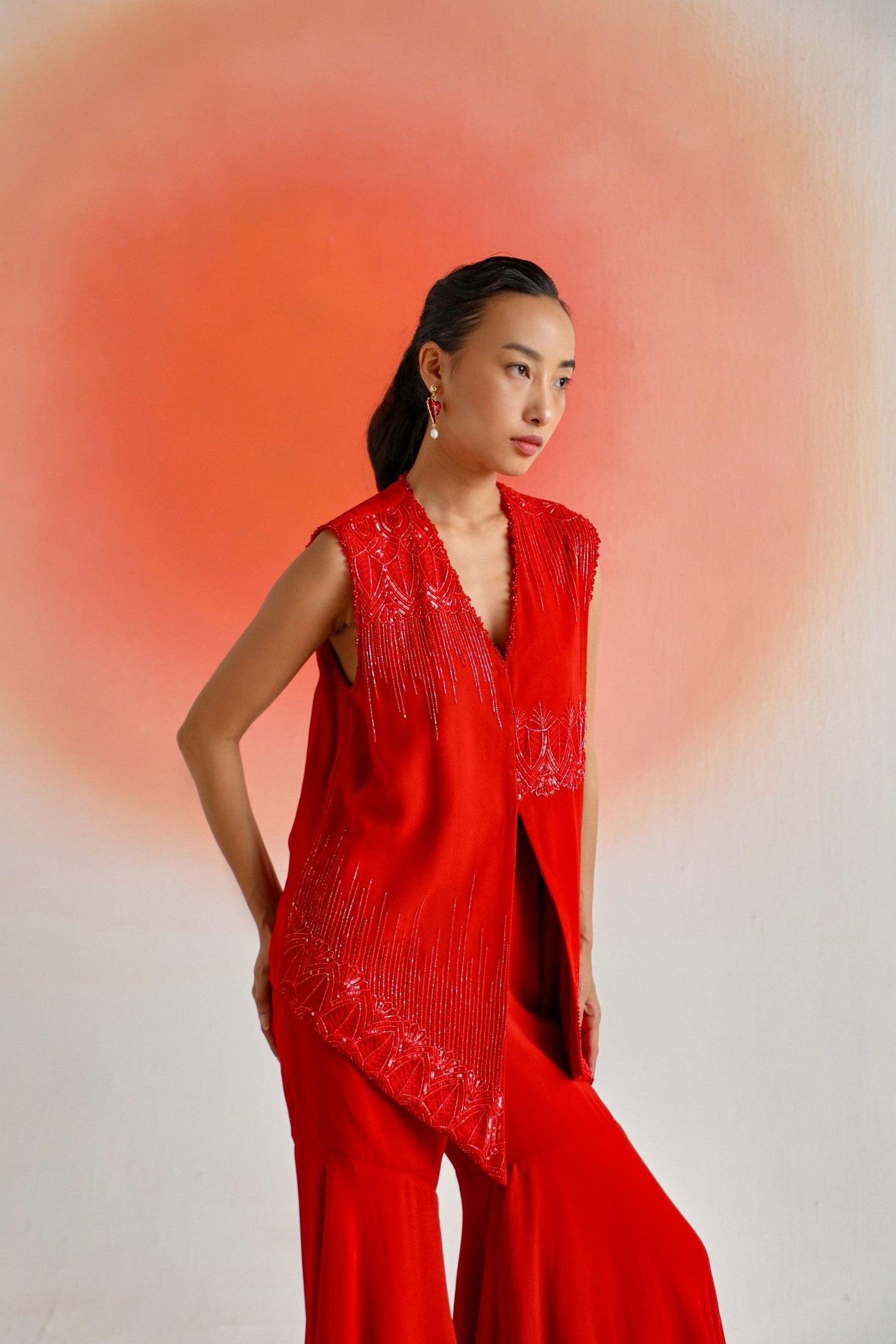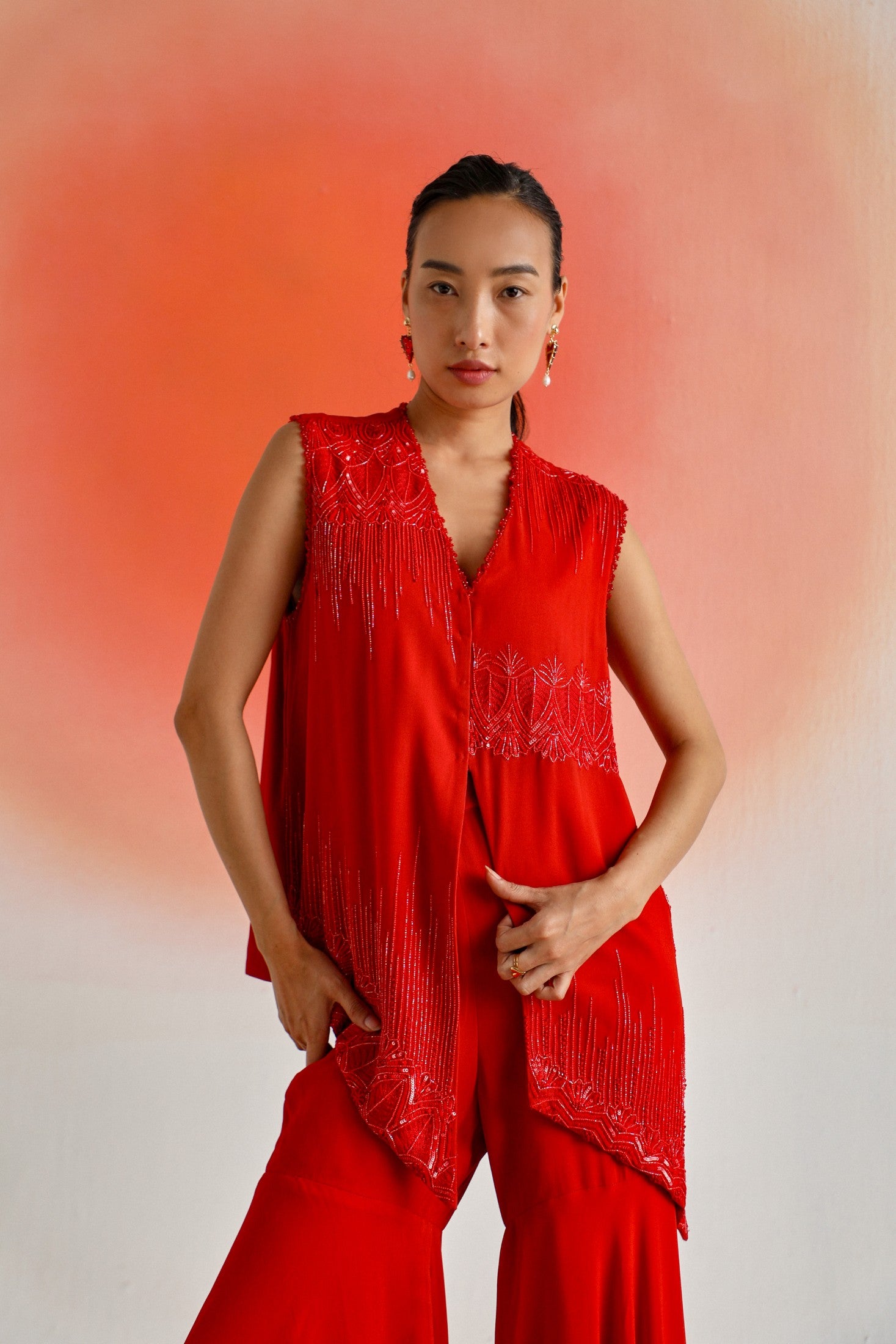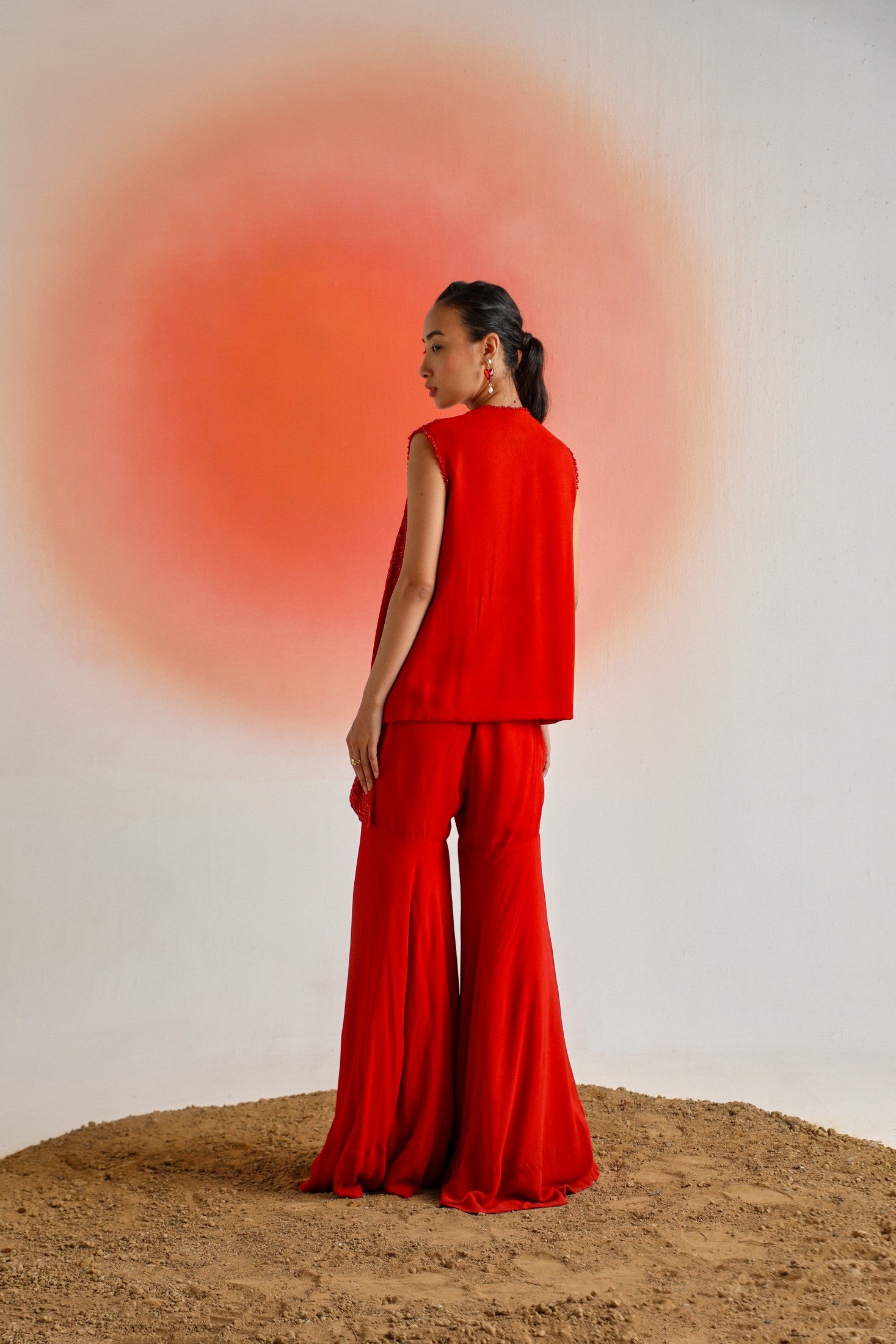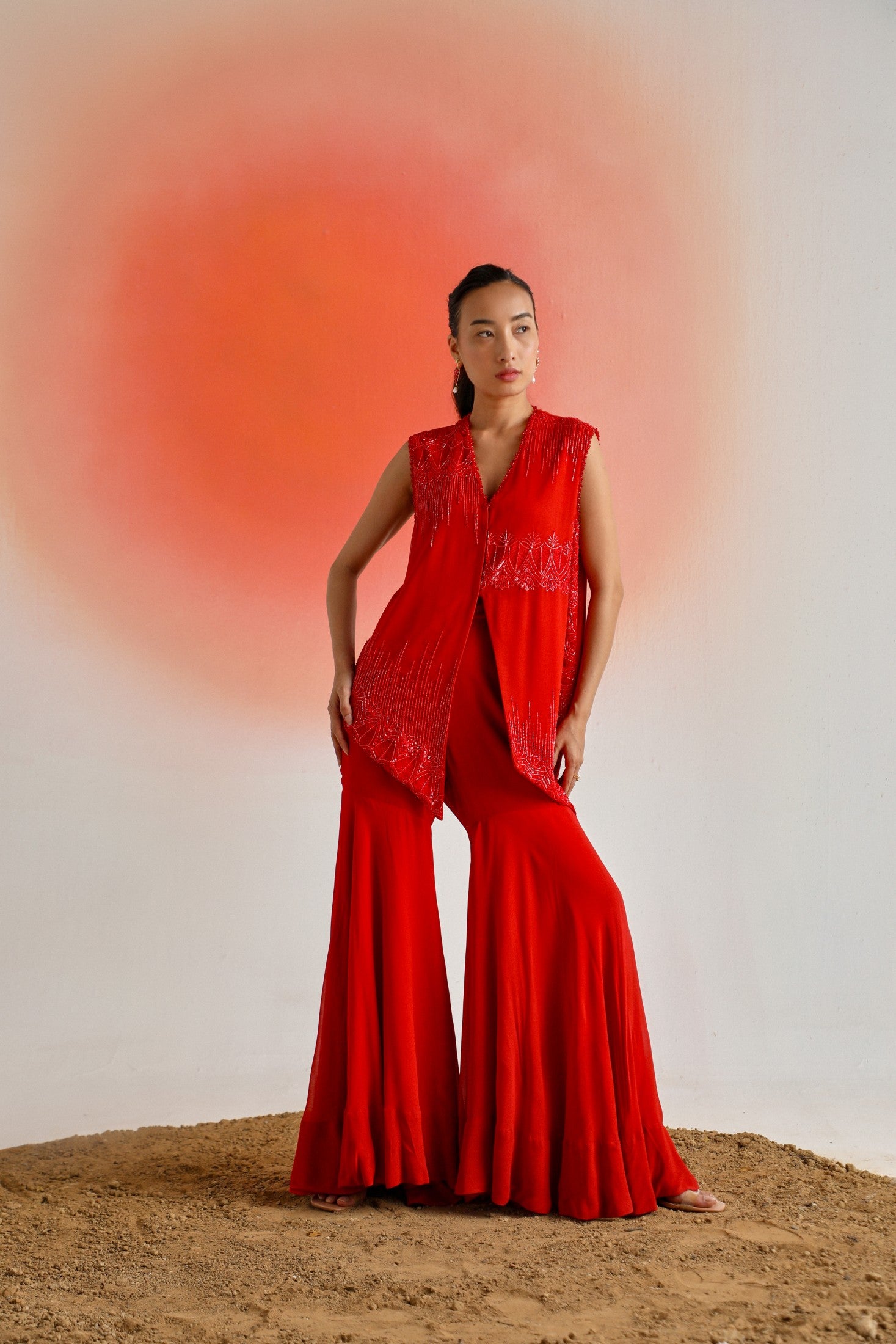 Red georgette sleeveless jacket featuring intricate tonal embroidery, paired with a matching gharara and inner for a graceful and elegant look.