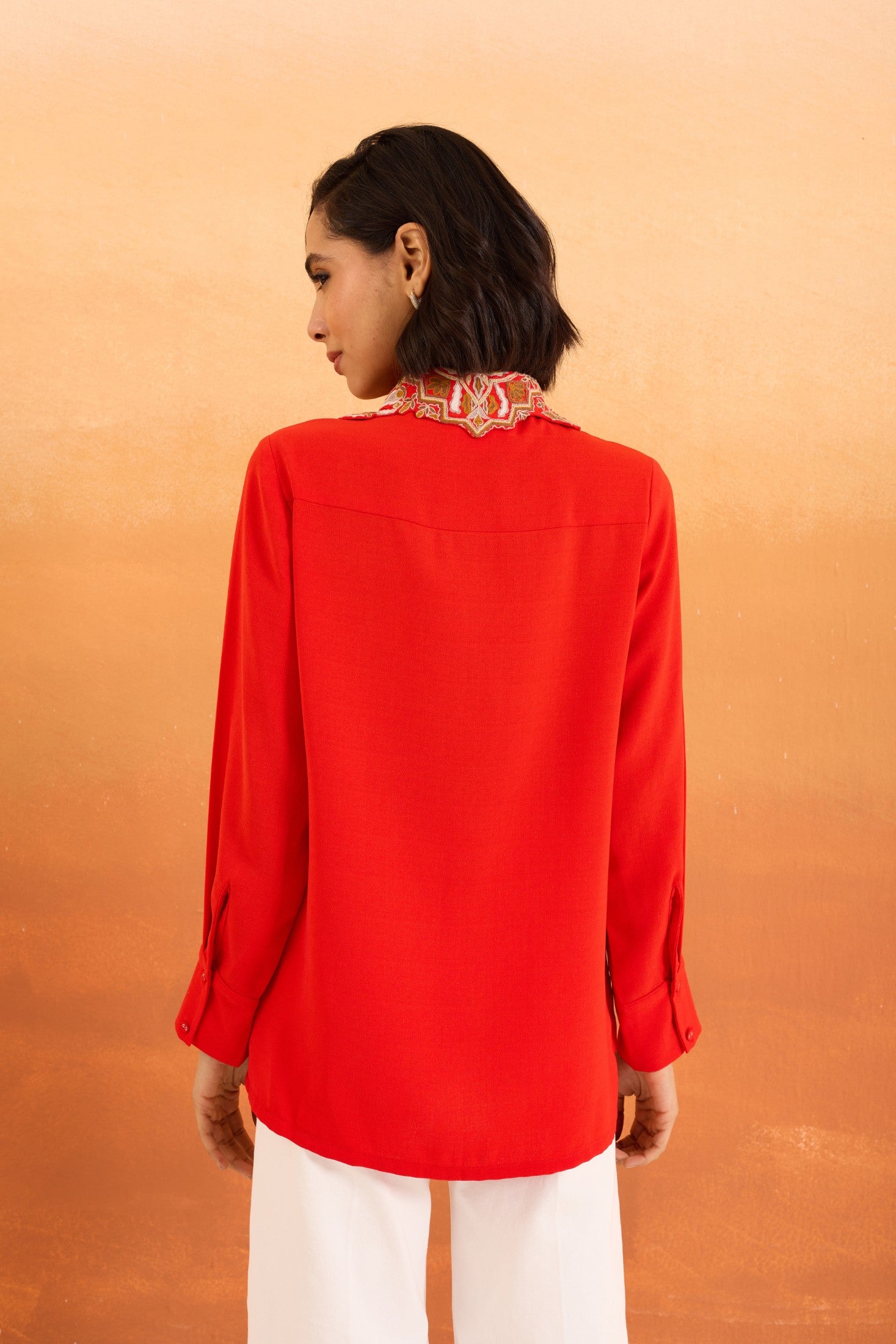 Add a pop of color to your wardrobe with this tomato red shirt featuring intricate multicolour embroidery on the collar and front placket. Crafted from soft, breathable fabric for all-day comfort, this shirt blends traditional detailing with a modern silhouette. Perfect for elevating everyday or Night looks or adding a subtle statement to your ensemble.
