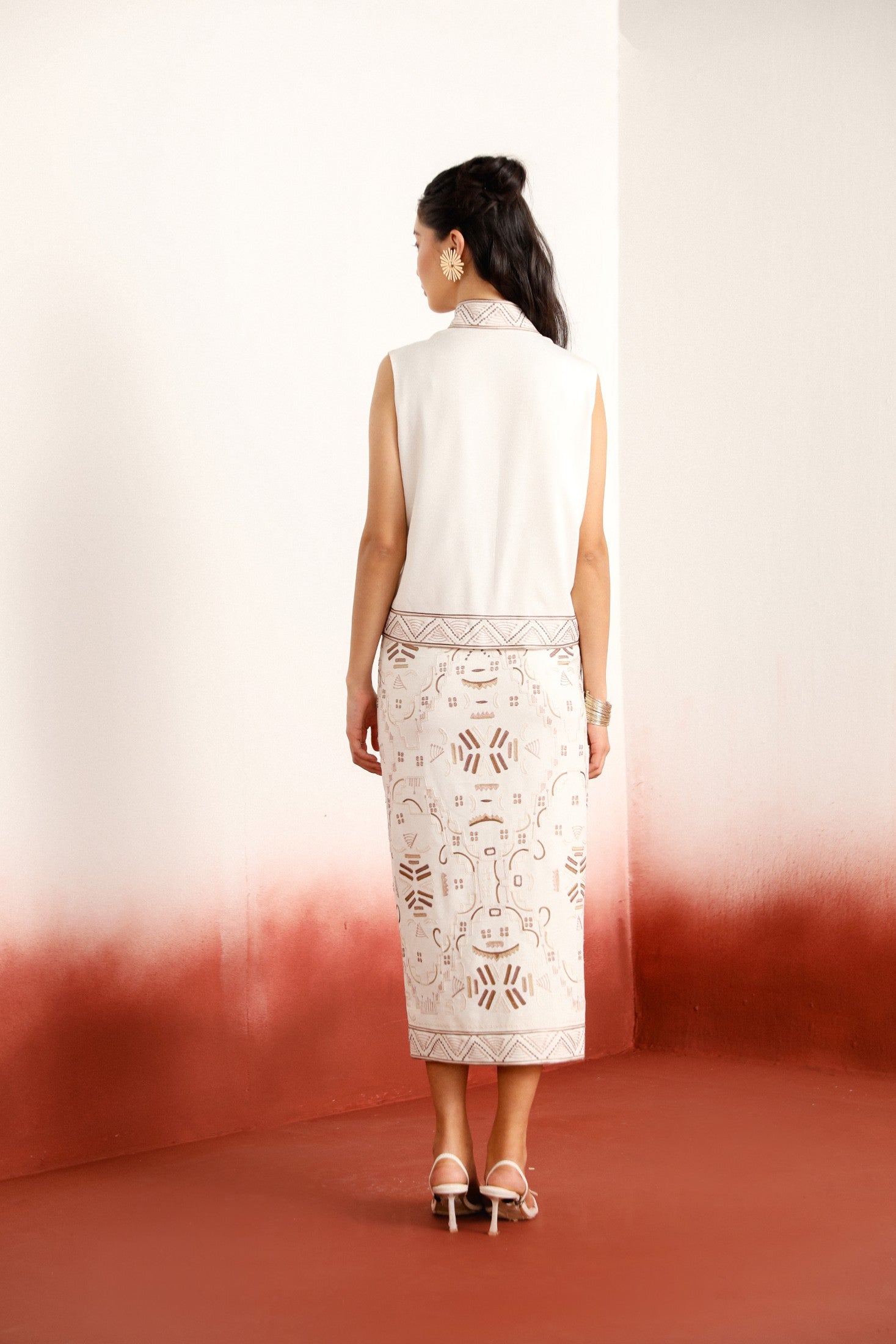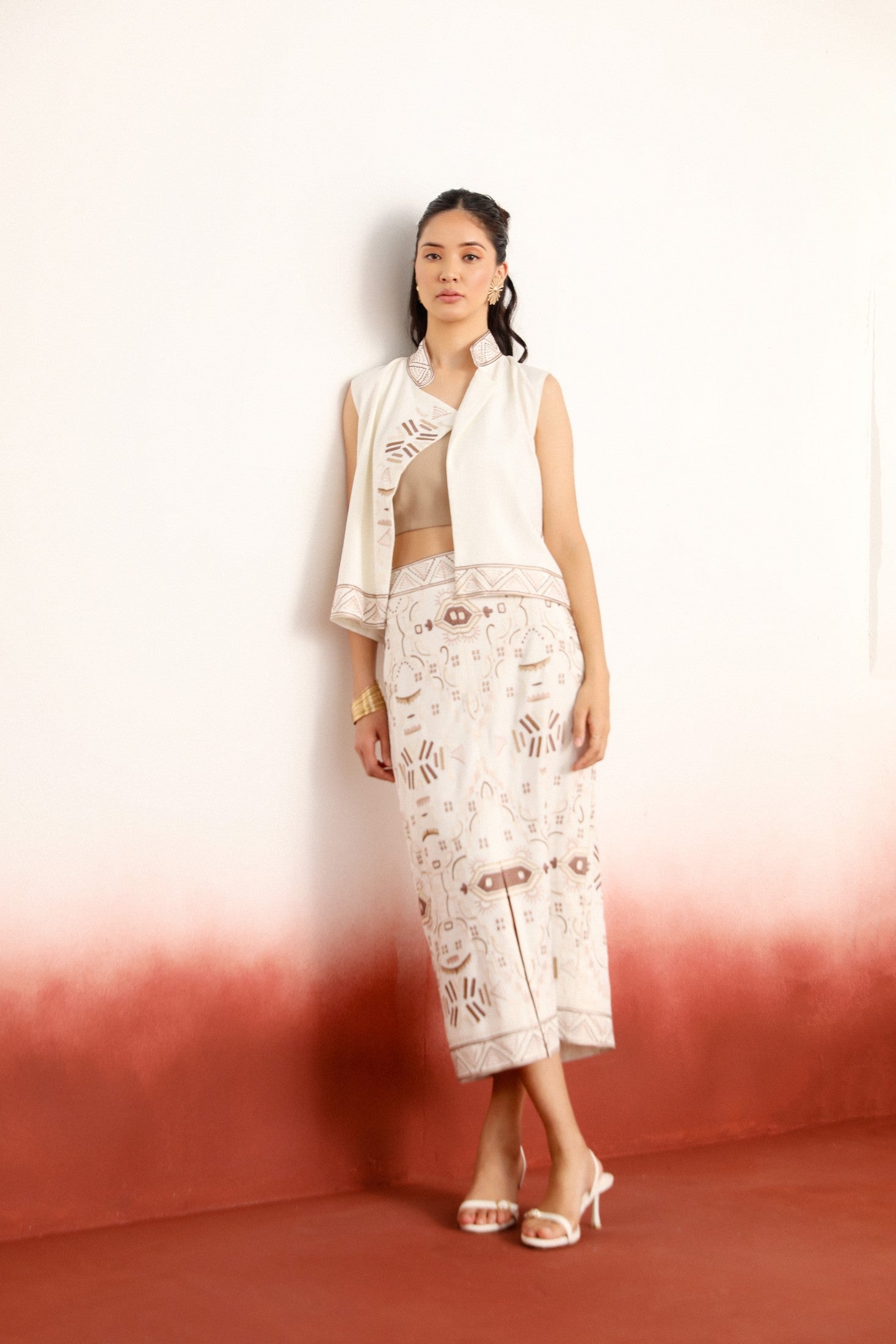 Chic and versatile, this sleeveless short jacket top features intricate embroidery and is designed to beautifully complement the ivory flared bottom. A perfect blend of structure, comfort, and style — ideal for contemporary festive looks or refined day-to-evening transitions.