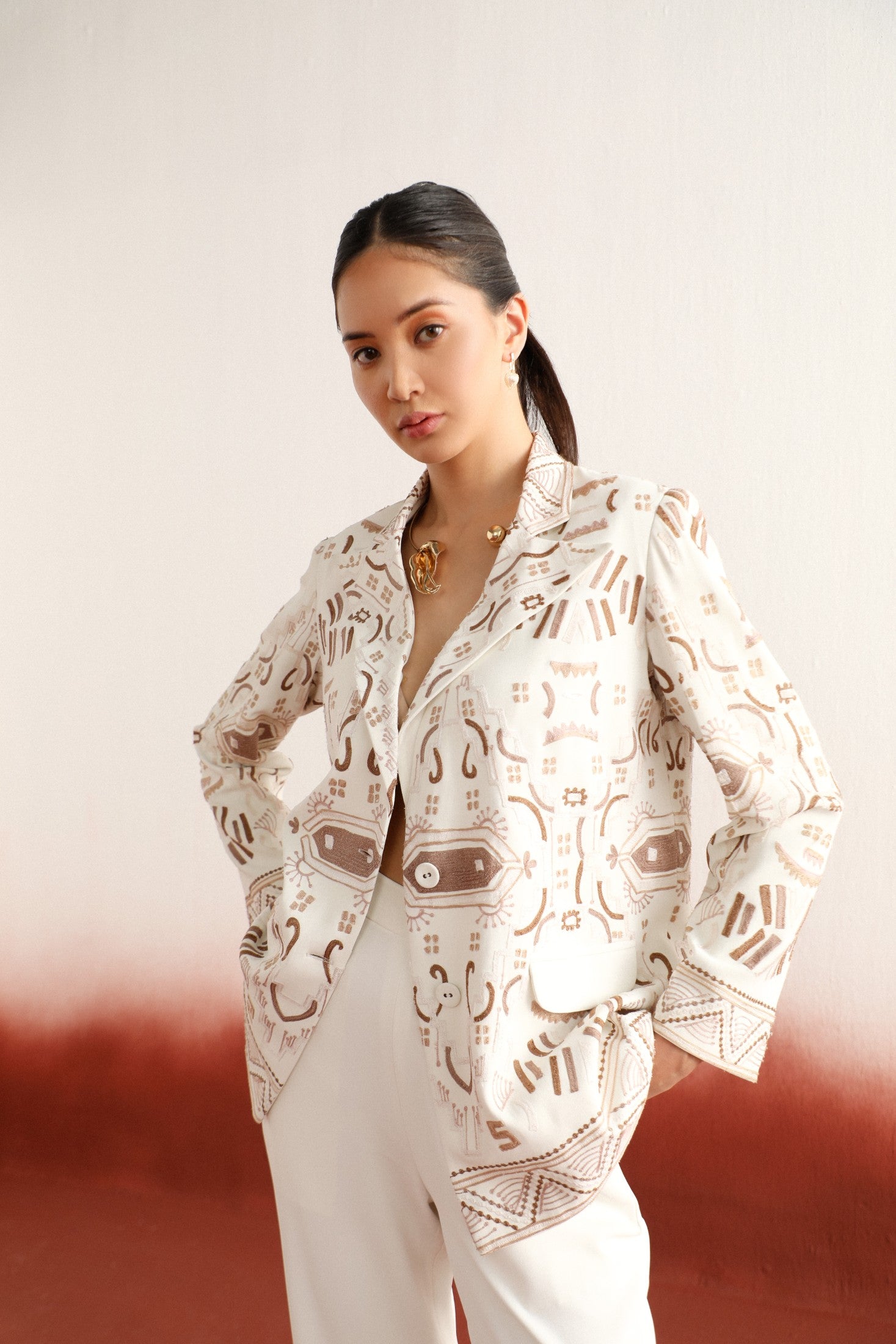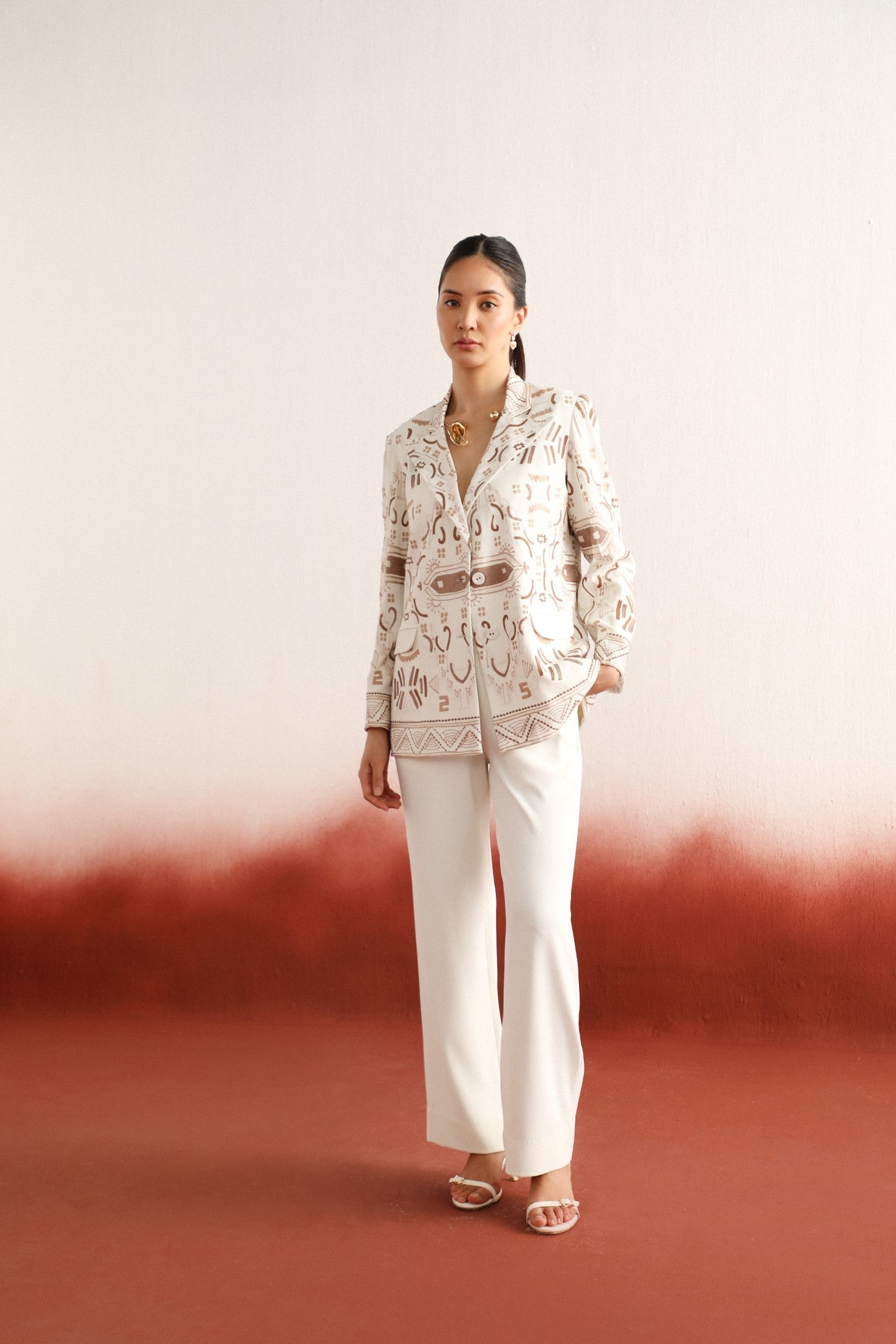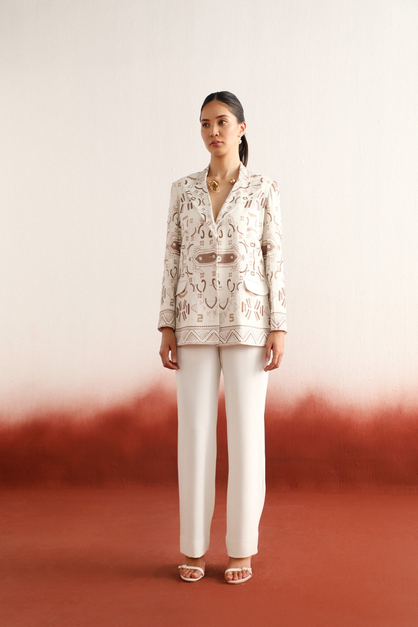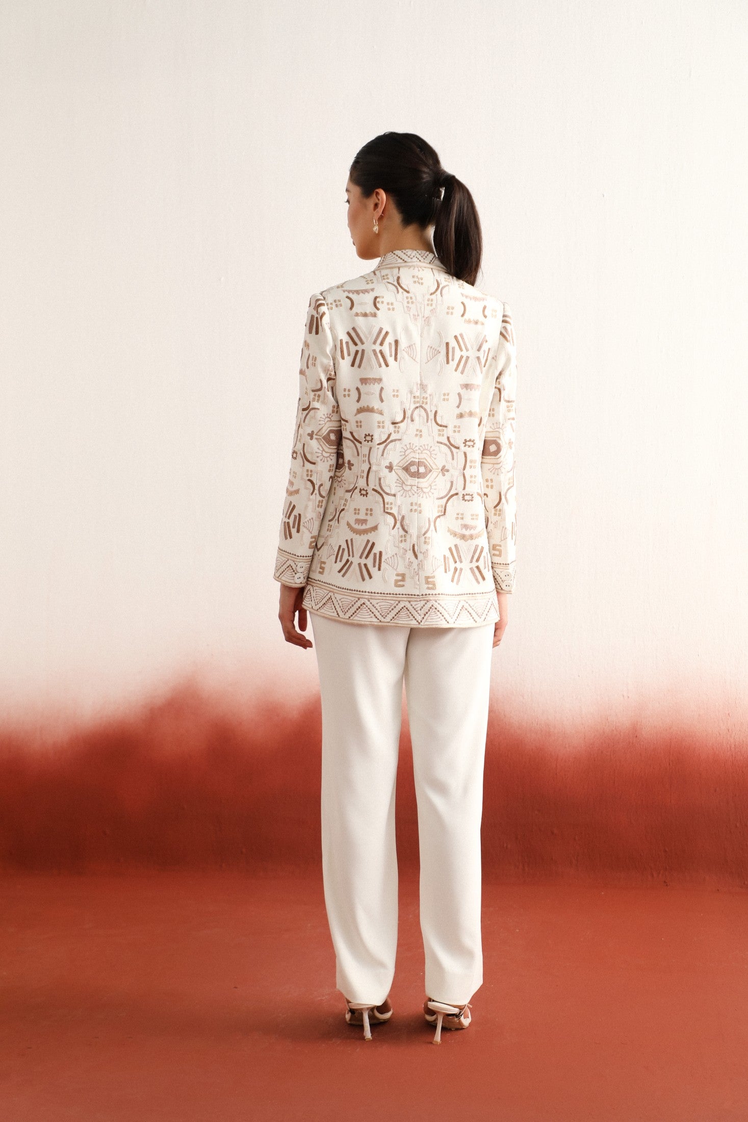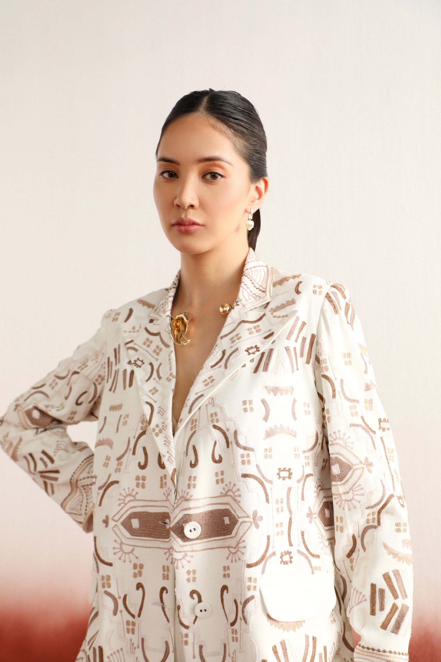 A perfect fusion of tradition and contemporary style, this off-white coat features intricate tribal pattern embroidery that commands attention. Paired with classic plain pants for balance and comfort, this ensemble is designed to make a statement while keeping you effortlessly at ease — ideal for festive gatherings or elegant daywear.