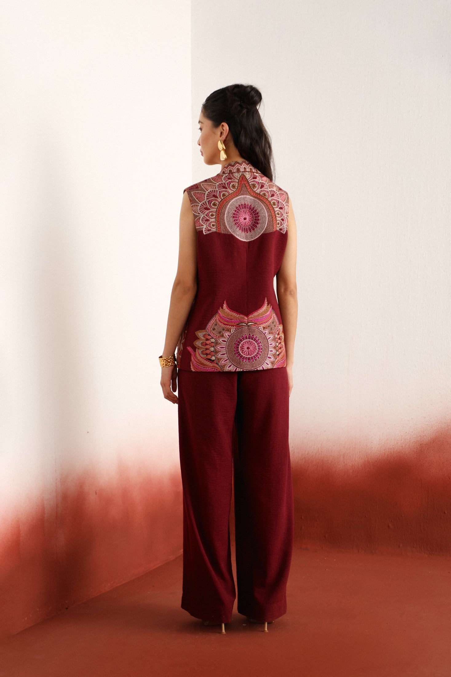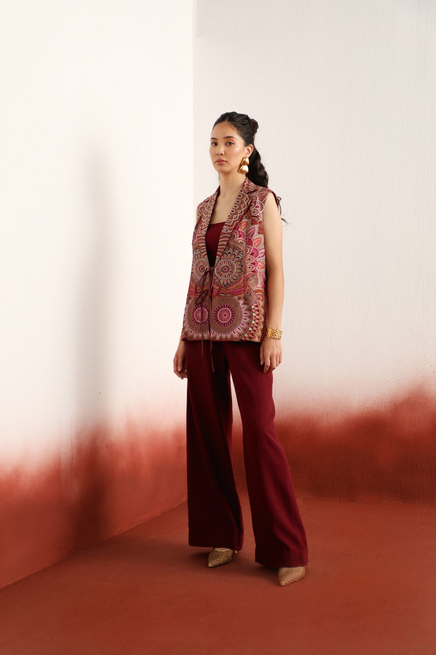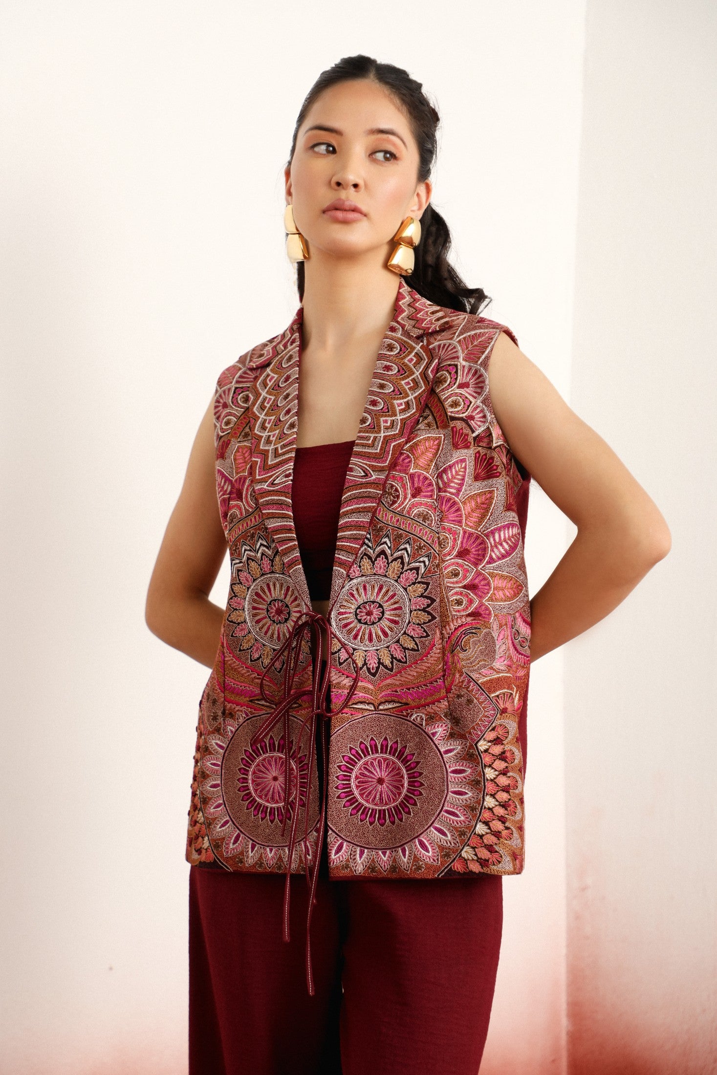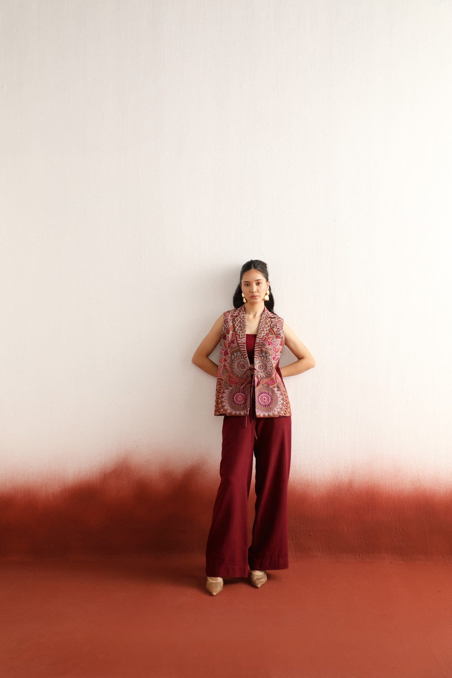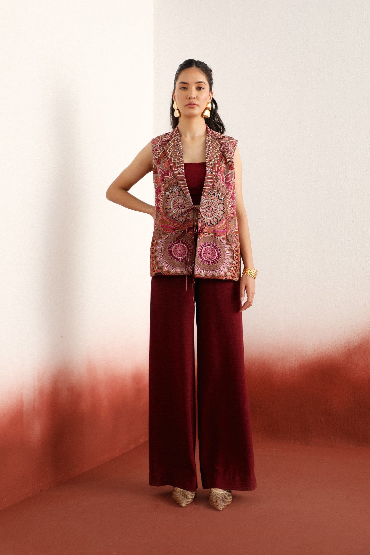 An artful blend of heritage and haute couture — this sleeveless jacket features rich, multicolour hand embroidery, beautifully contrasted with minimal maroon pants.