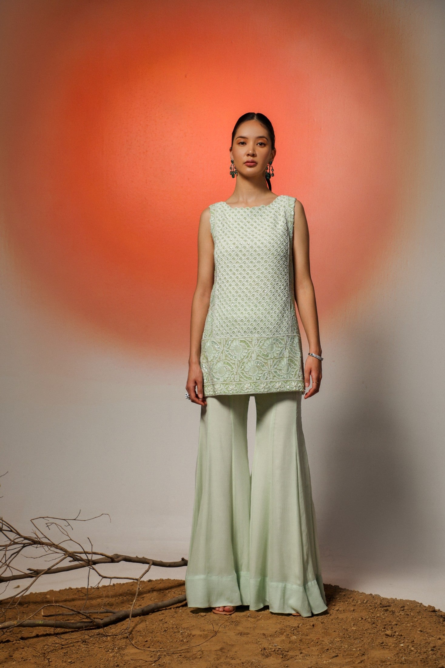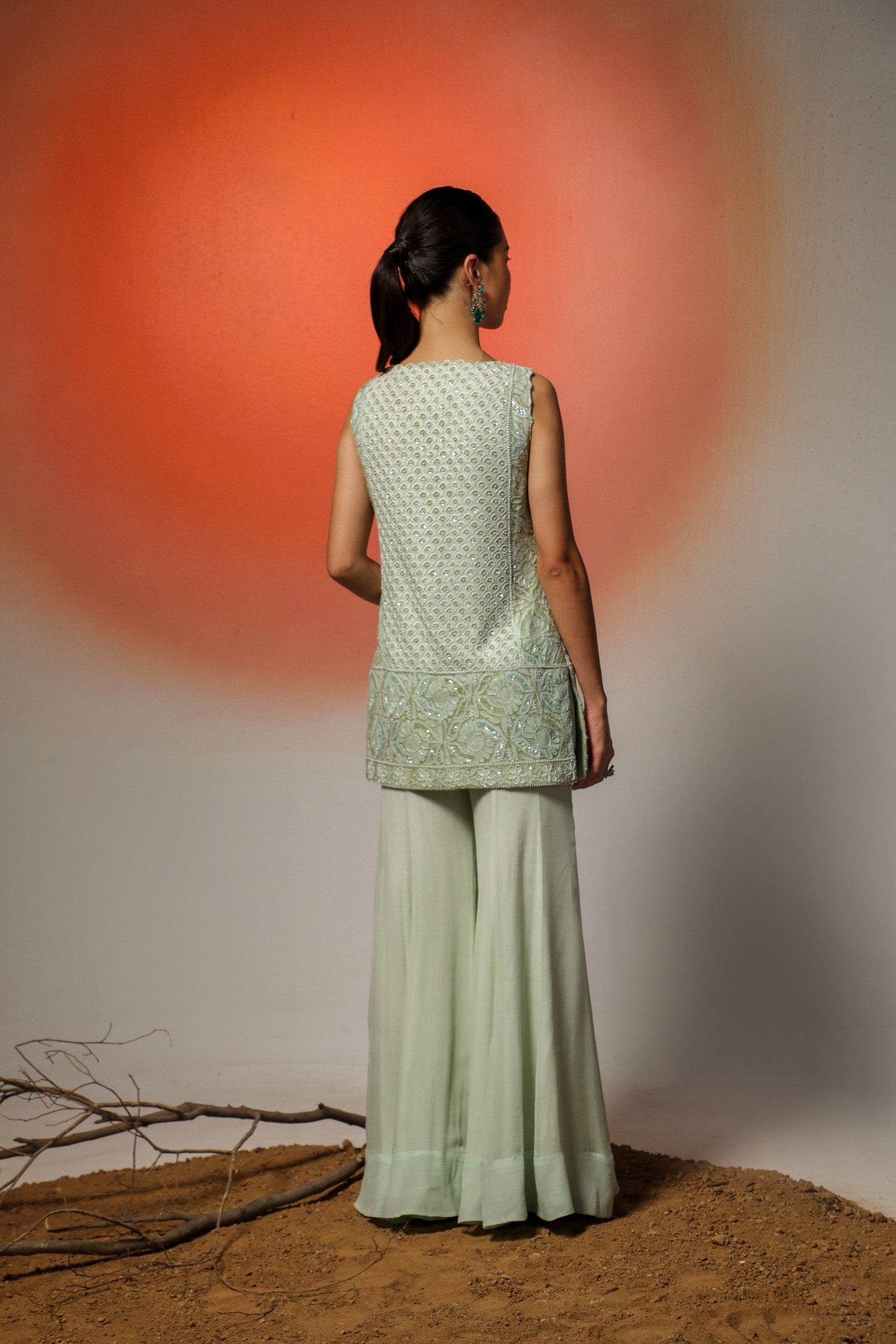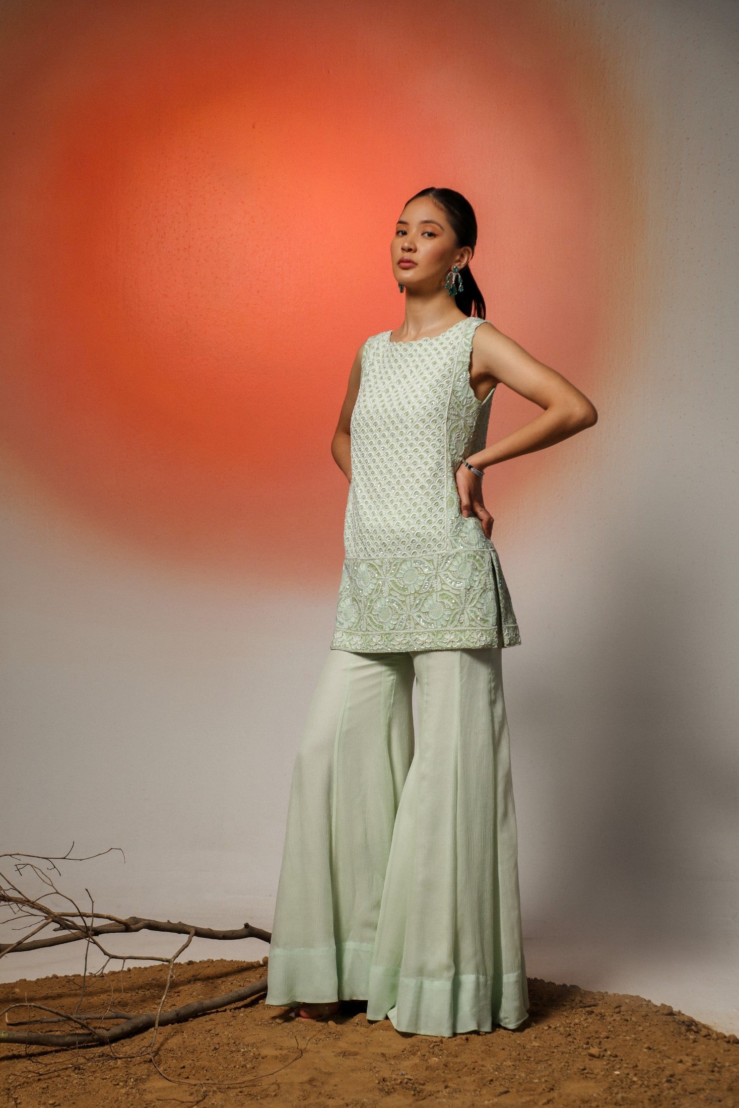 Mint Sea Green Chikankari & Embellished Sleeveless Kurta with Chiffon Sharara