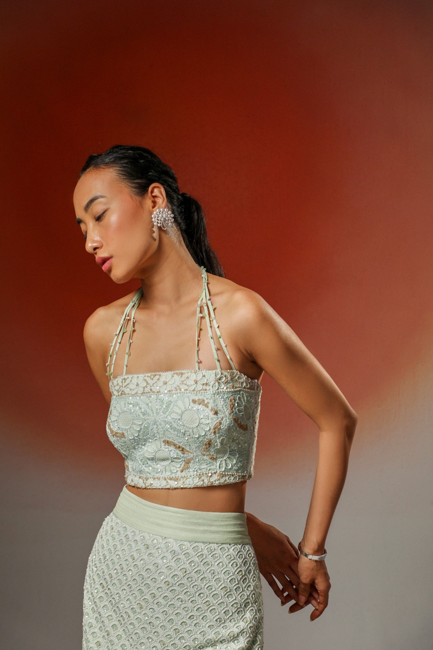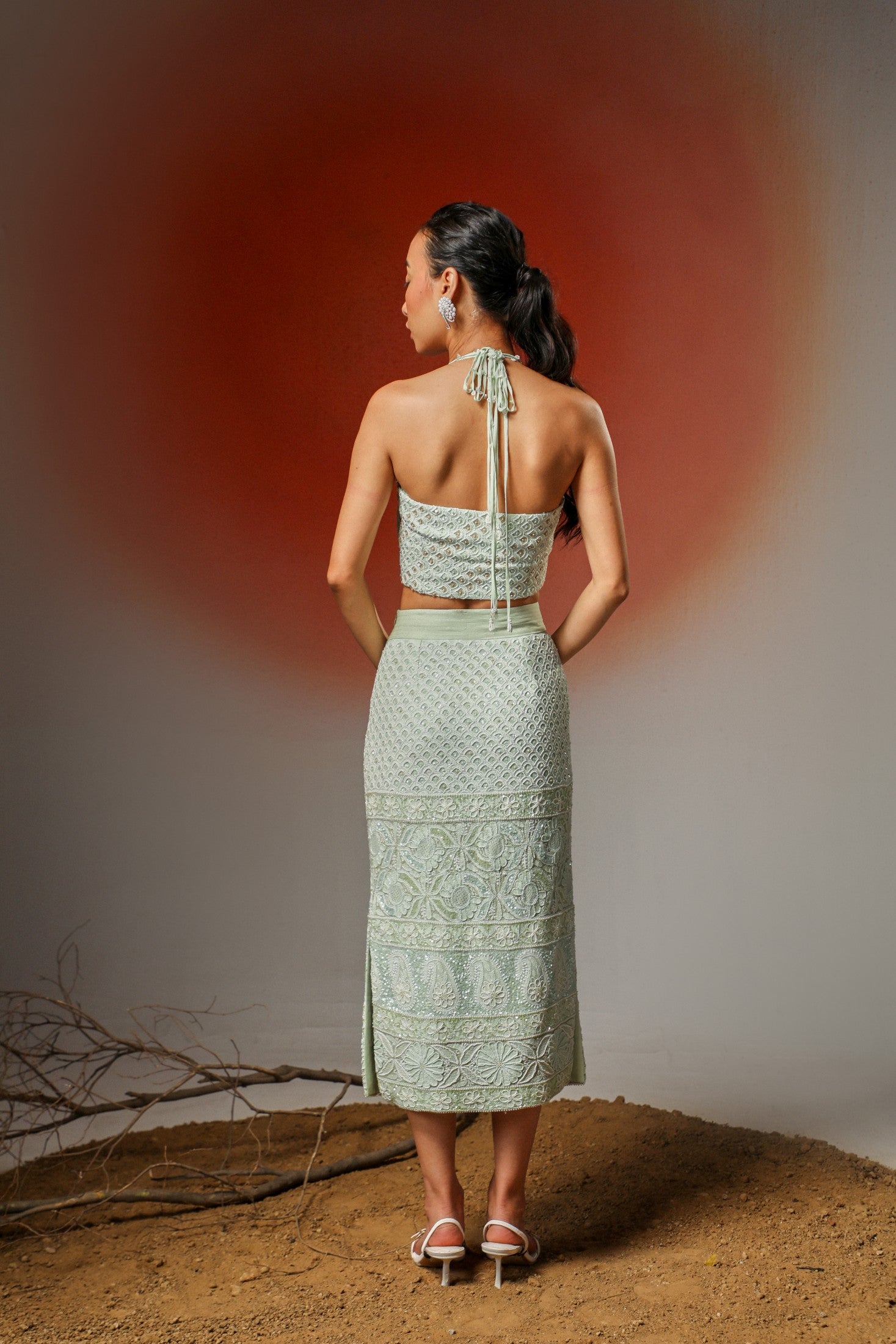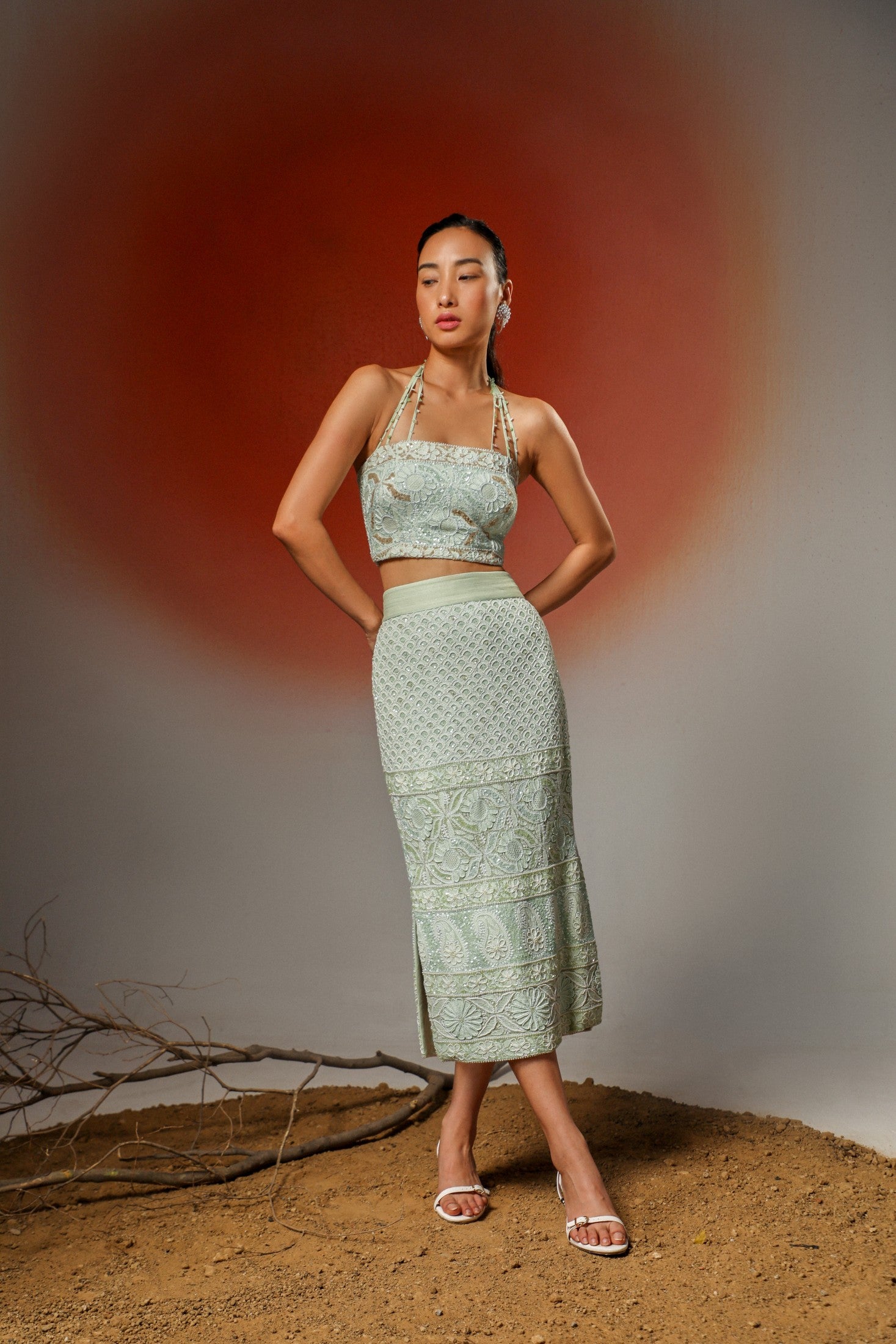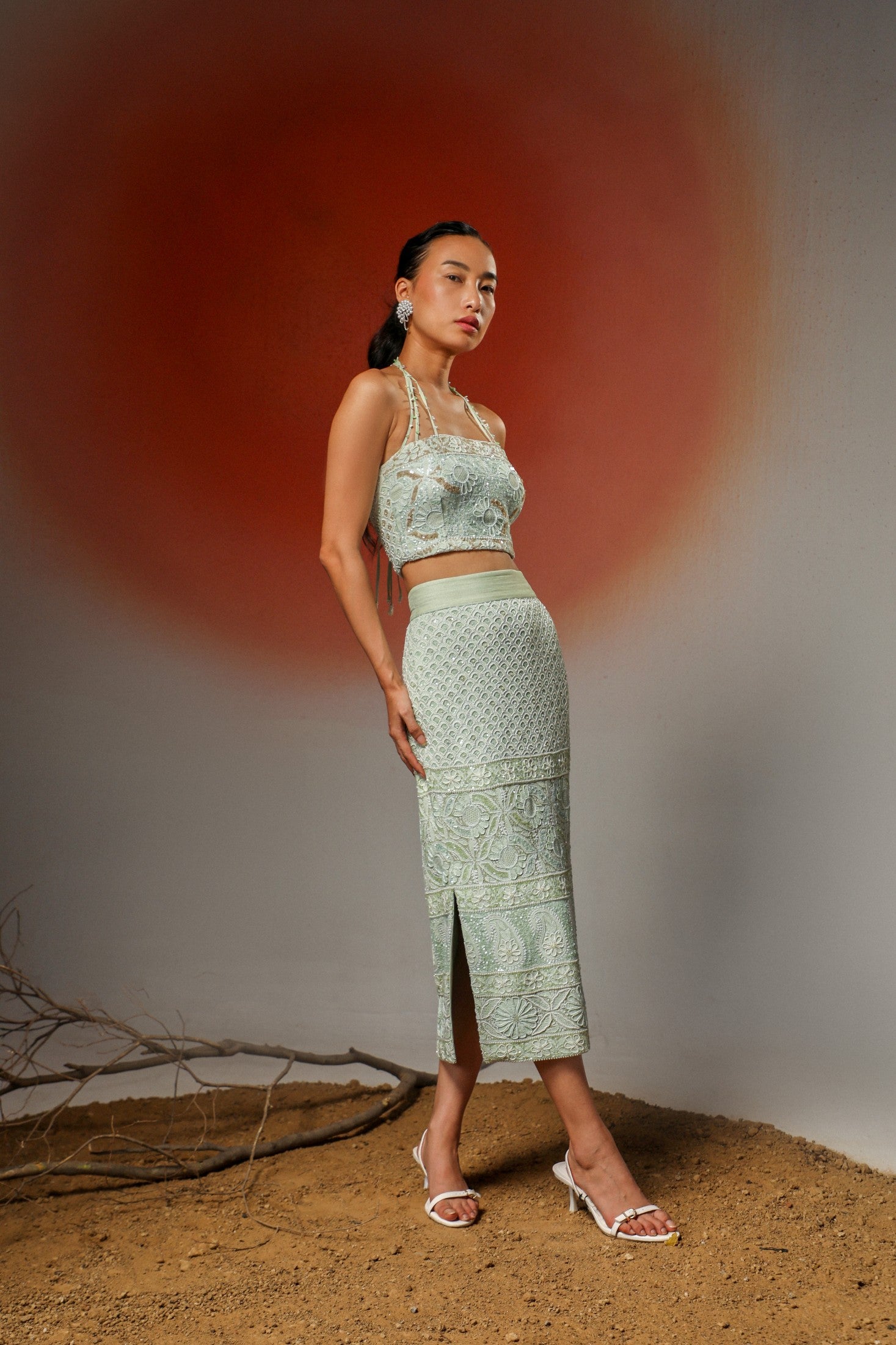 Ethereal and elegant, this mint sea green ensemble features exquisite Udhan chikankari paired with rich embellishments on both the top and pencil skirt. Designed to dazzle at special occasions, it beautifully merges traditional artistry with a contemporary silhouette — offering both statement style and effortless comfort.