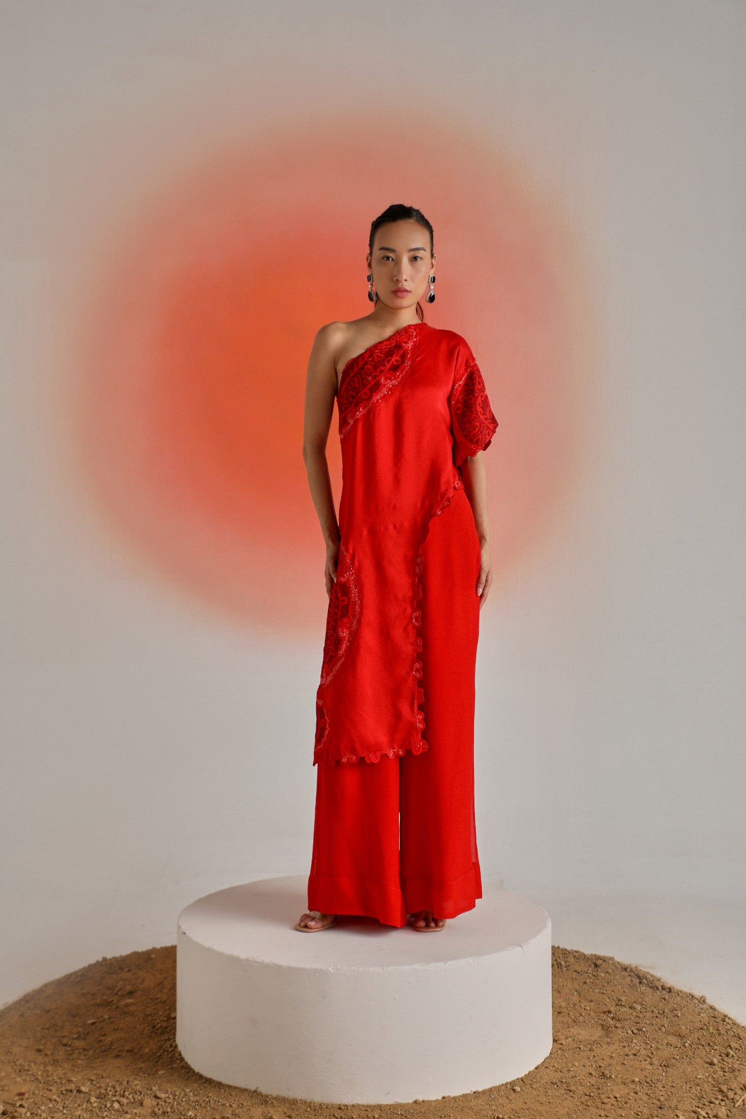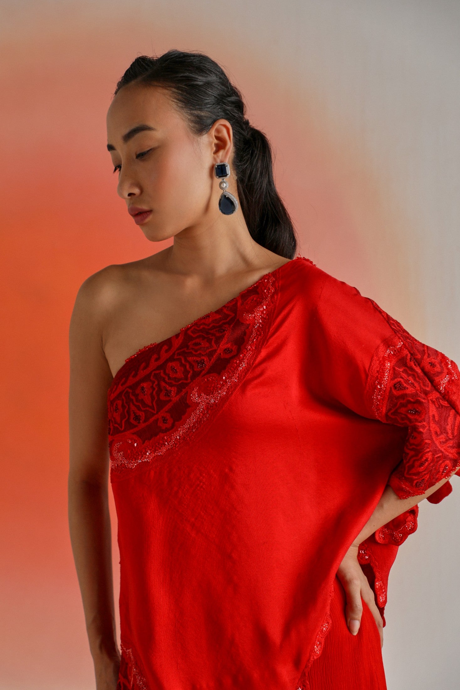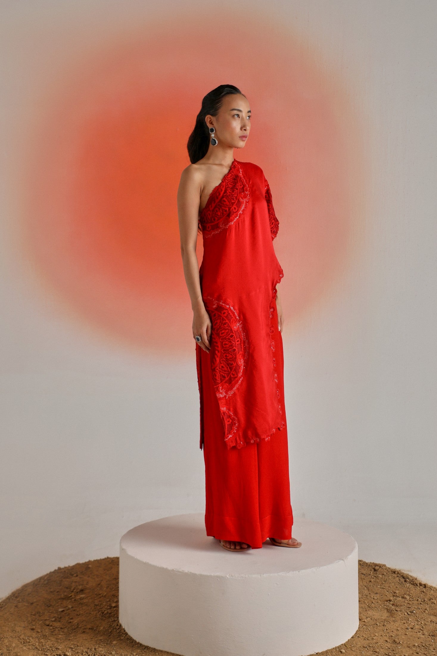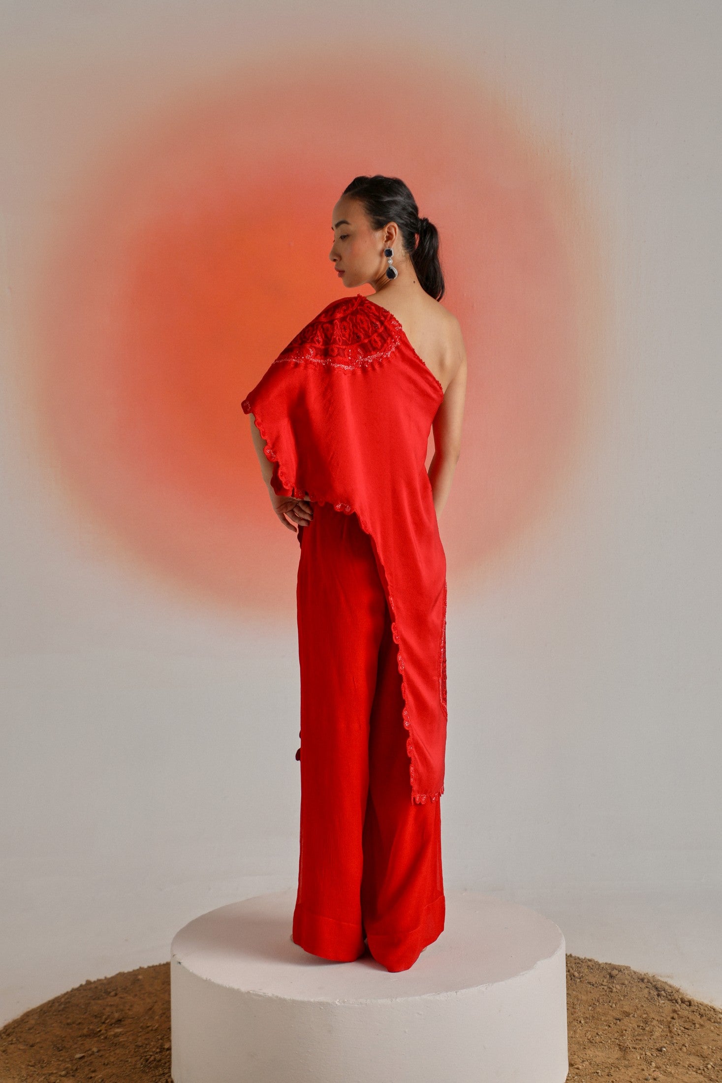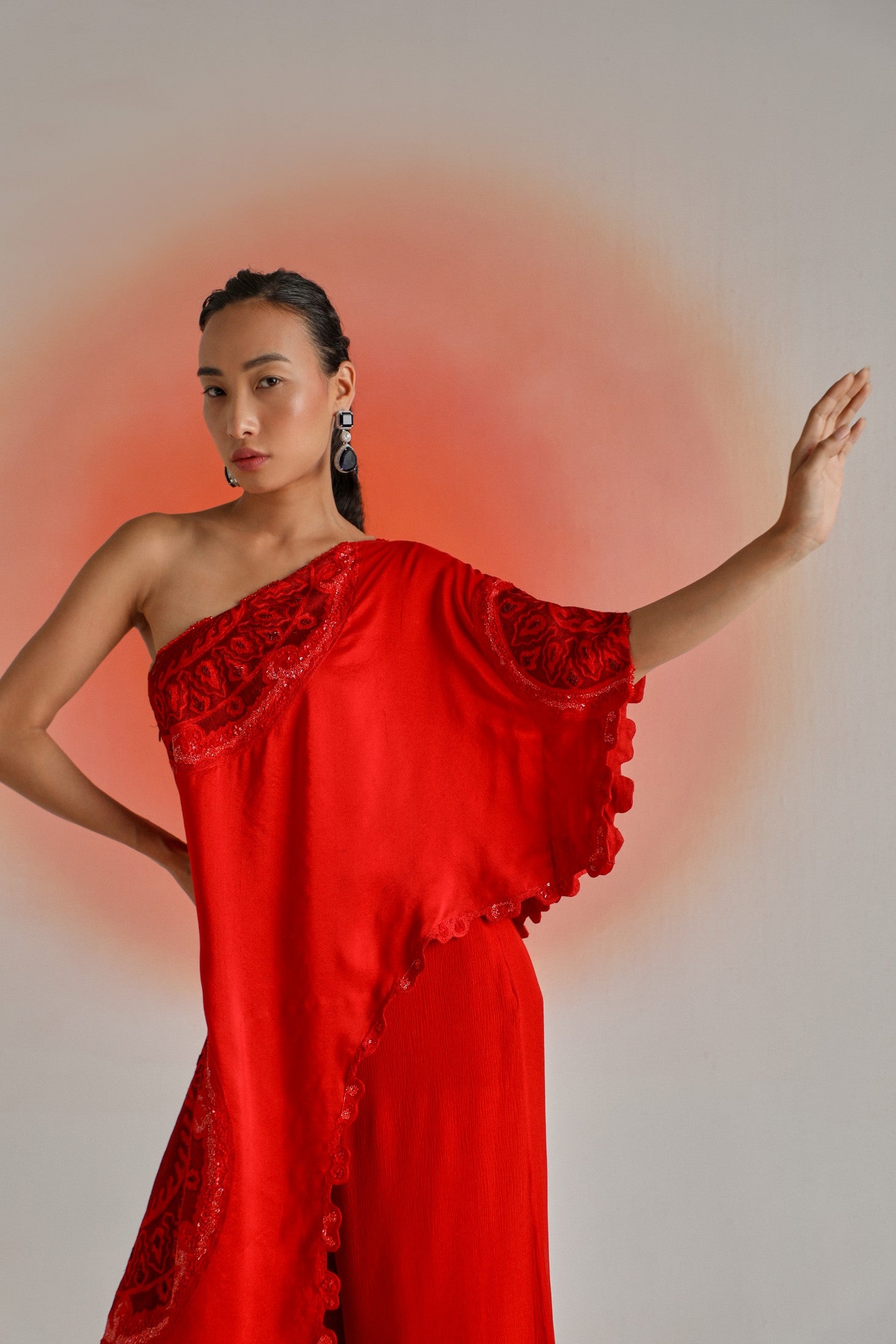 Red One-Side Off-Shoulder Cape Paired with Chiffon Pants