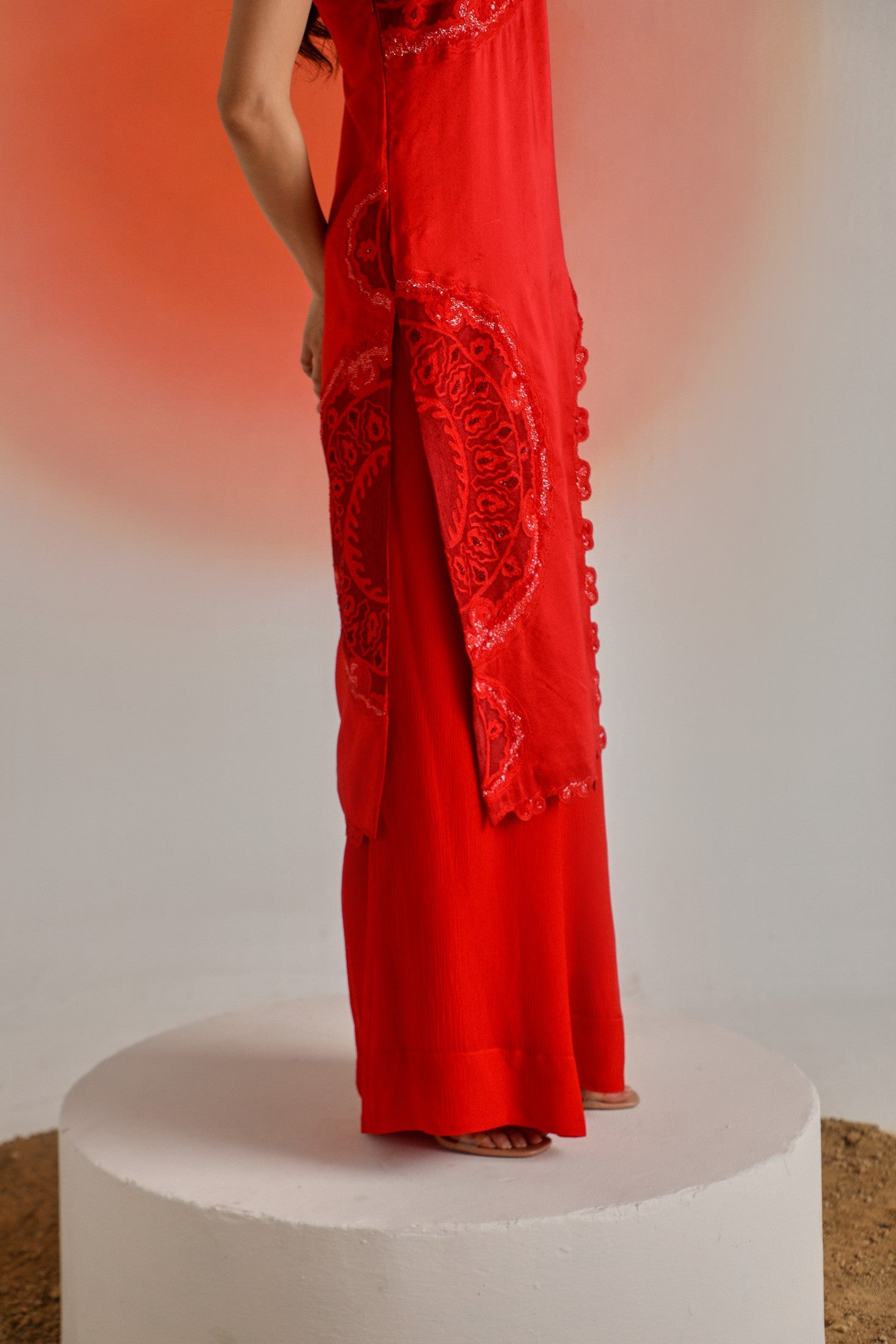 Striking and sophisticated, this red ensemble features a one-side off-shoulder cape adorned with intricate placement embroidery and delicate embellishments. Paired with flowing chiffon pants, it’s designed to make a statement at special occasions while offering effortless grace and comfort.