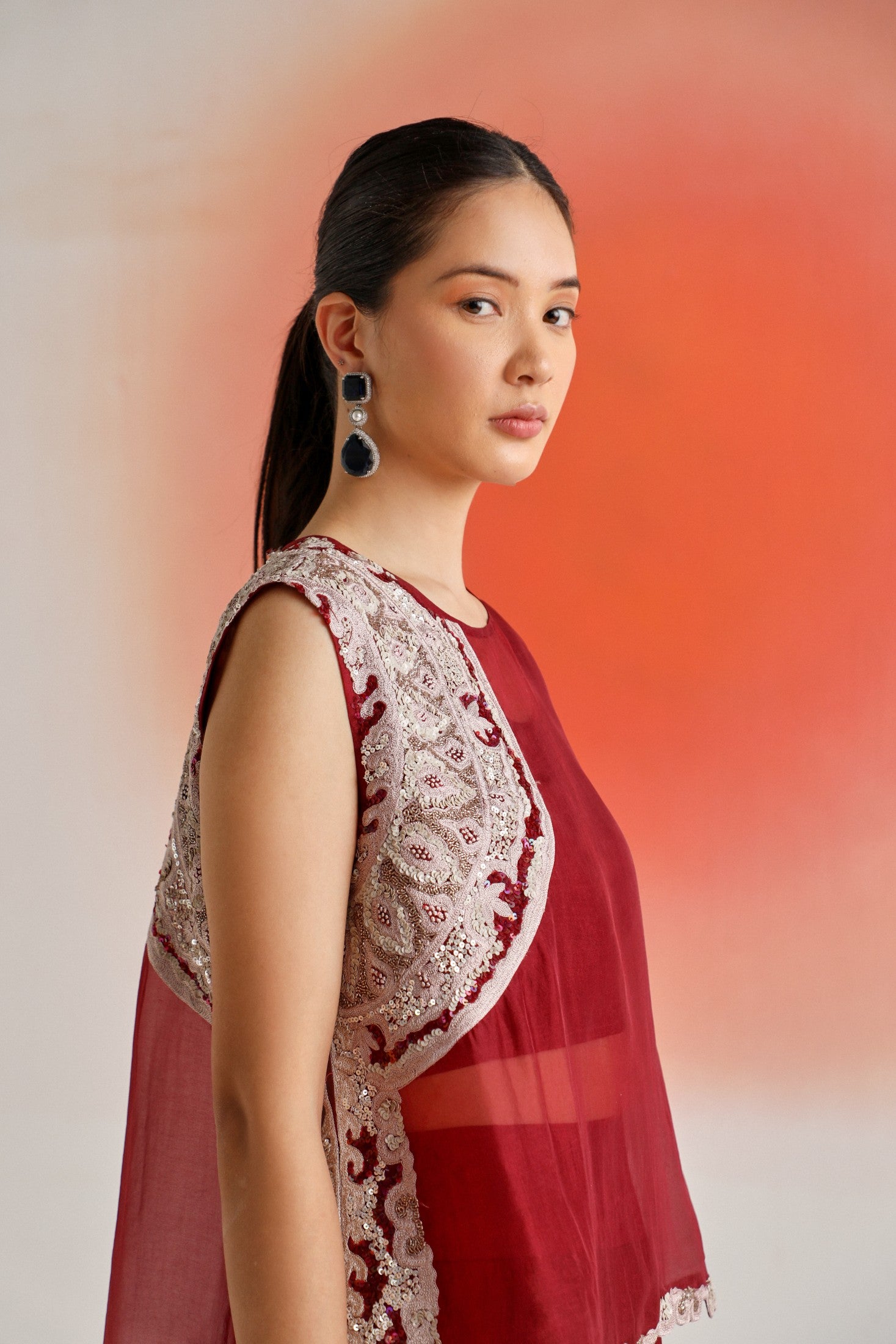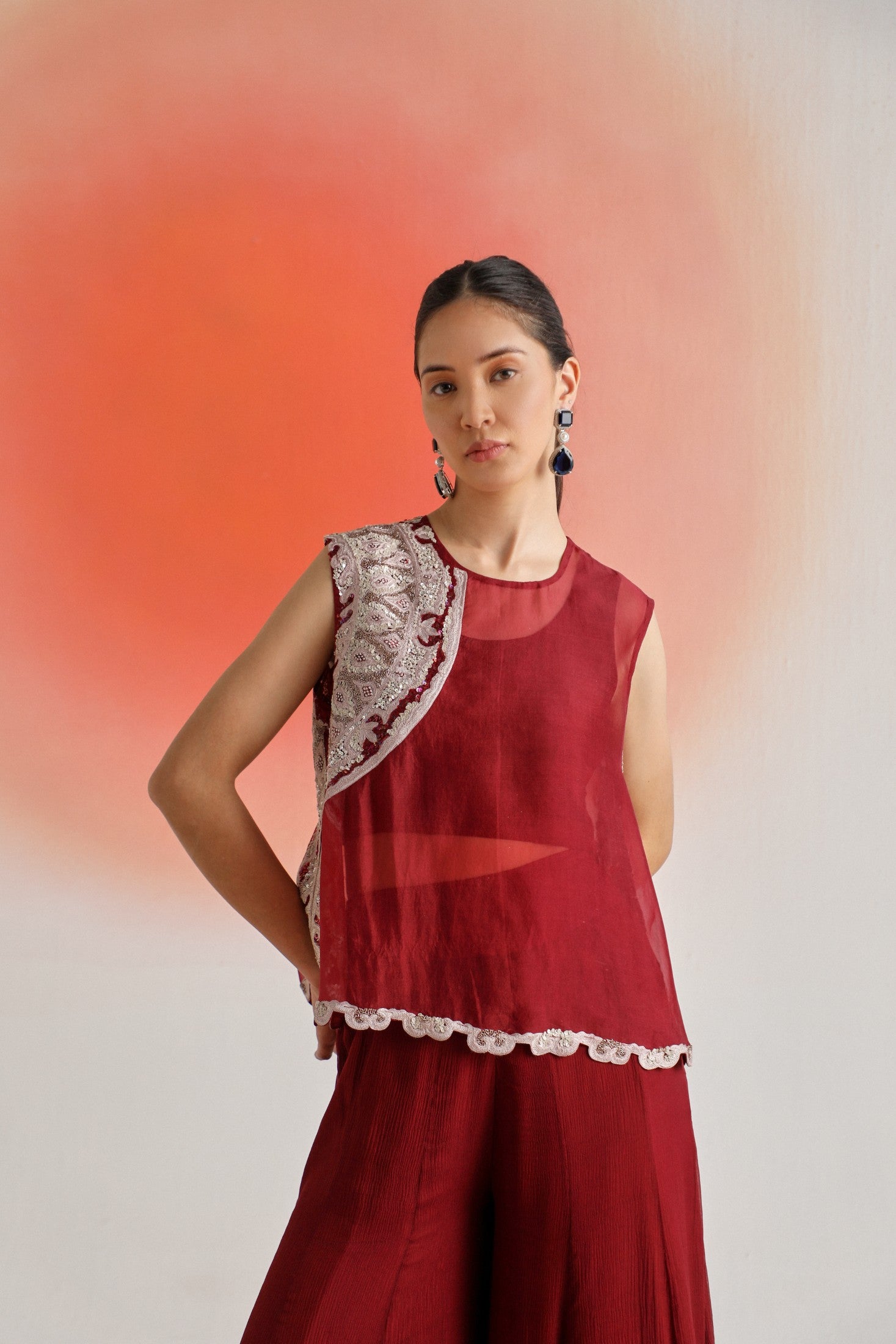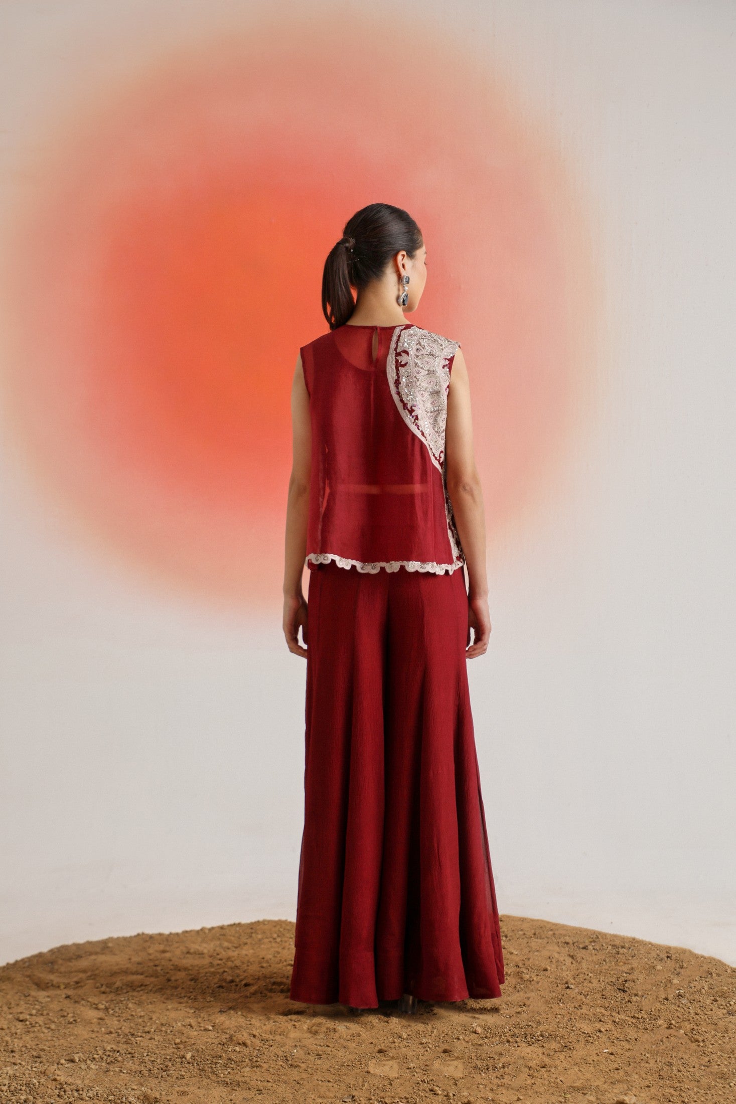 Earthy elegance meets intricate craftsmanship in this brown organza sleeveless top, featuring detailed placement embroidery that adds depth and texture. Paired with soft chiffon sharara pants, this ensemble is perfect for special occasions — offering a refined silhouette with a touch of effortless charm.