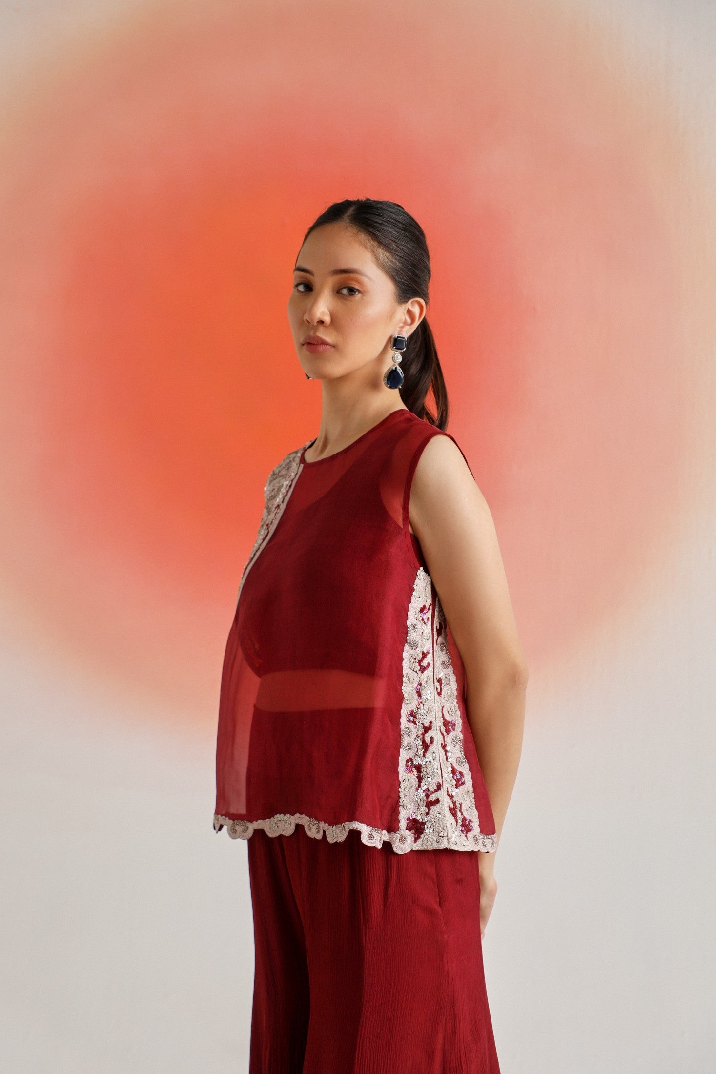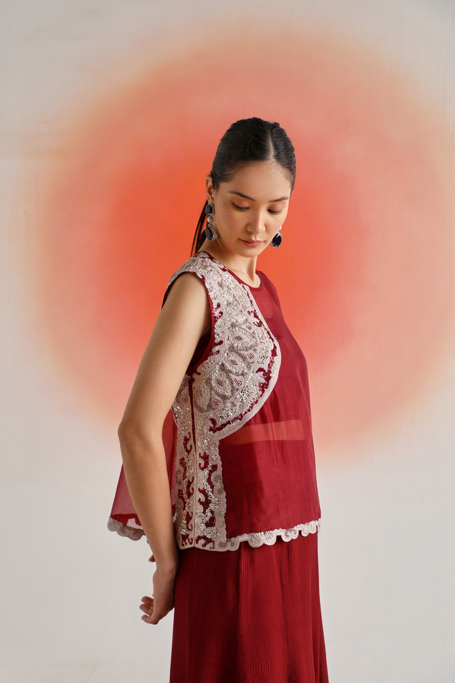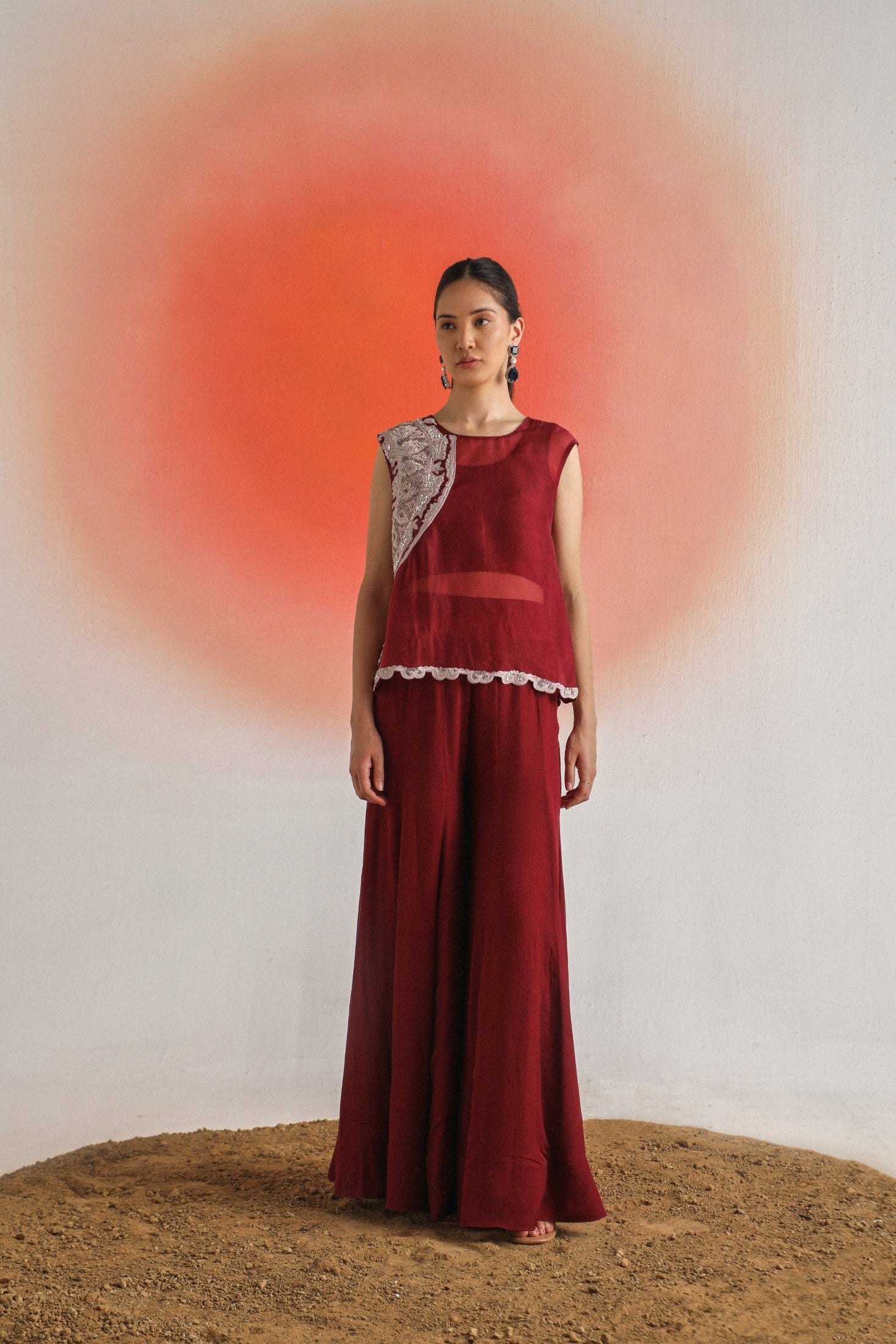 Earthy elegance meets intricate craftsmanship in this brown organza sleeveless top, featuring detailed placement embroidery that adds depth and texture. Paired with soft chiffon sharara pants, this ensemble is perfect for special occasions — offering a refined silhouette with a touch of effortless charm.