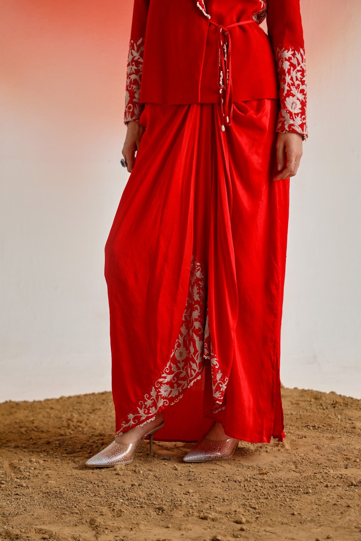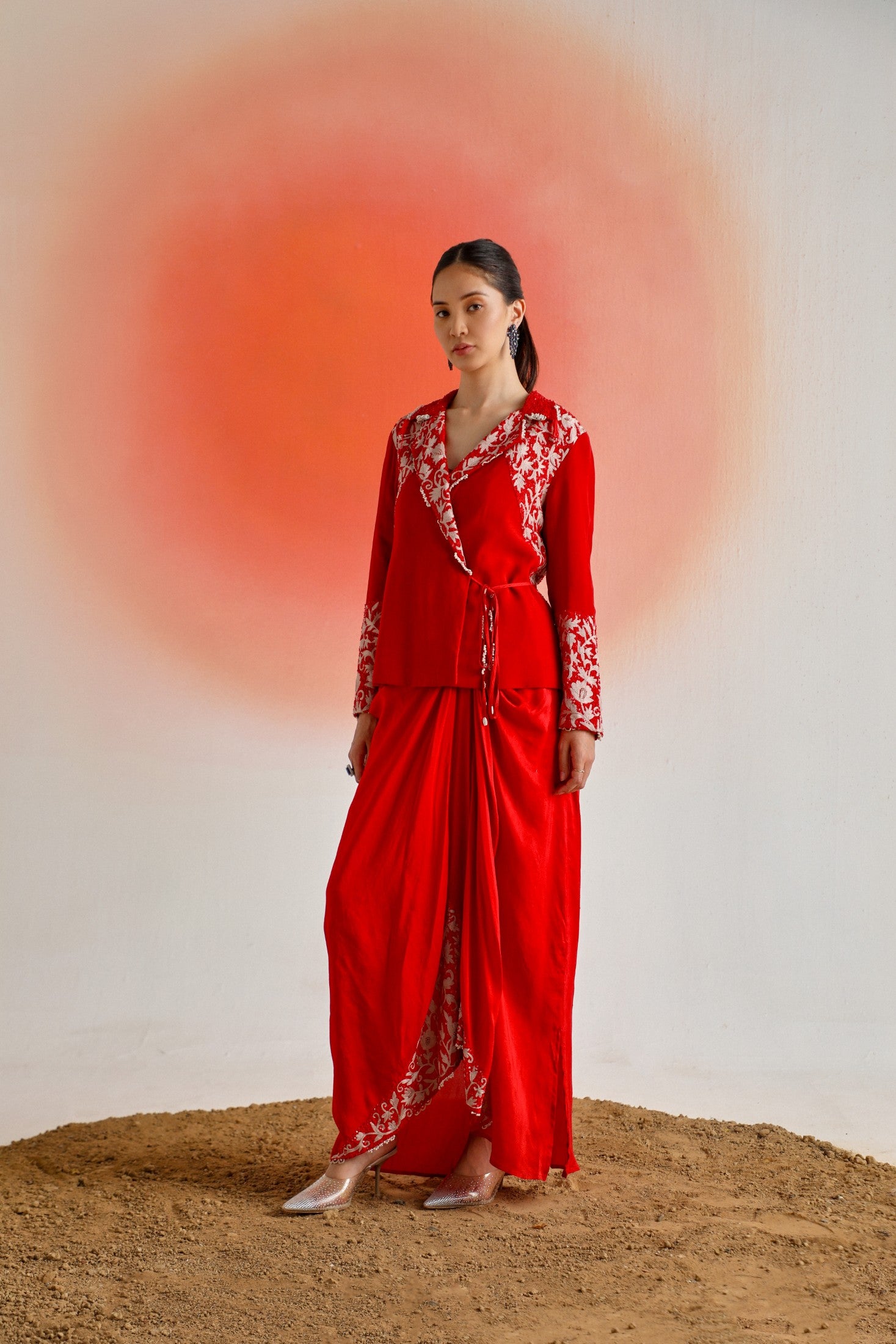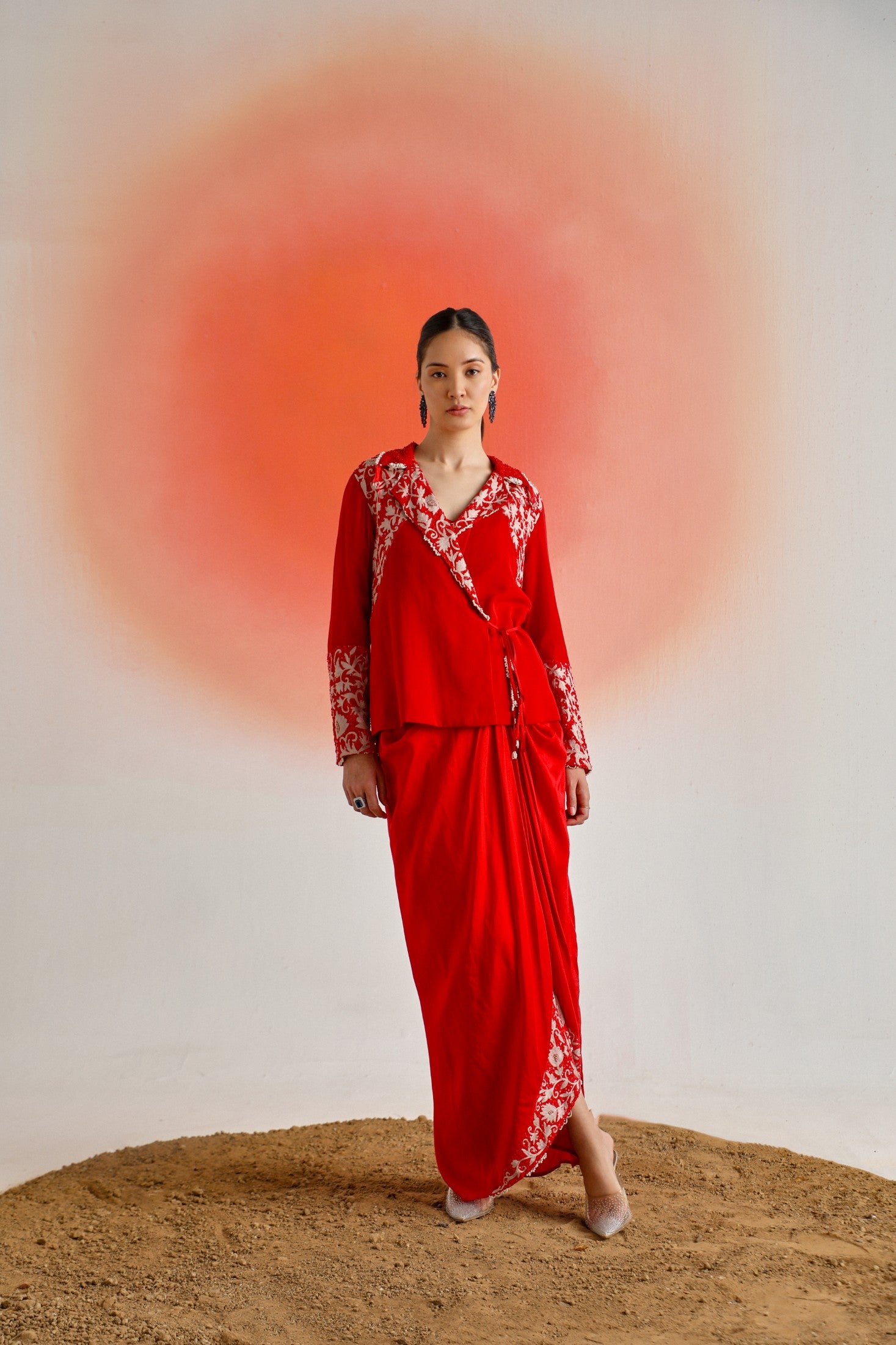 A striking blend of tradition and elegance, this black angrakha-style jacket features intricate embroidery, beautifully paired with a matching inner. The look is completed with a pick-up skirt detailed with embroidery on the front panel — crafted thoughtfully for special occasions while ensuring effortless comfort and grace.