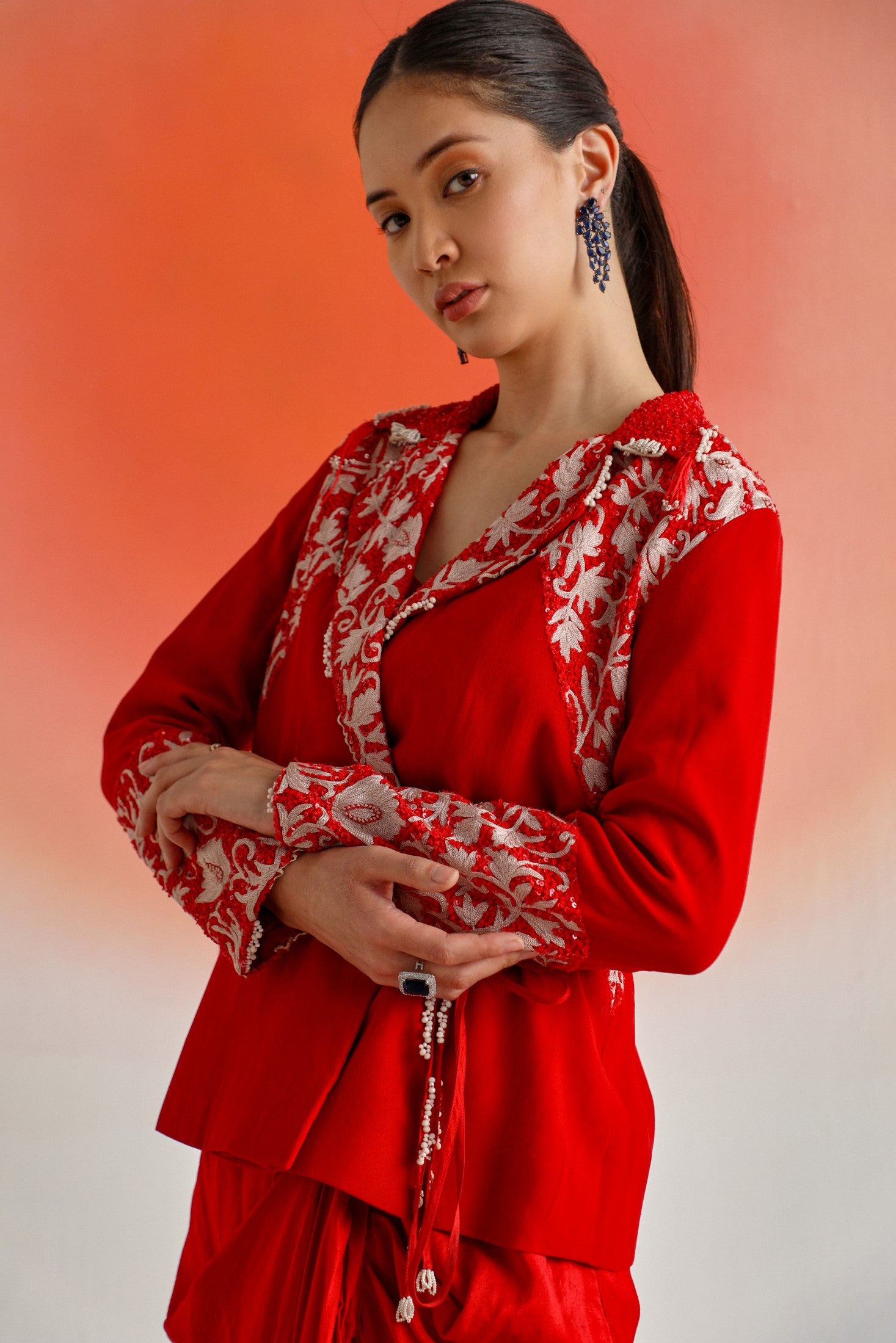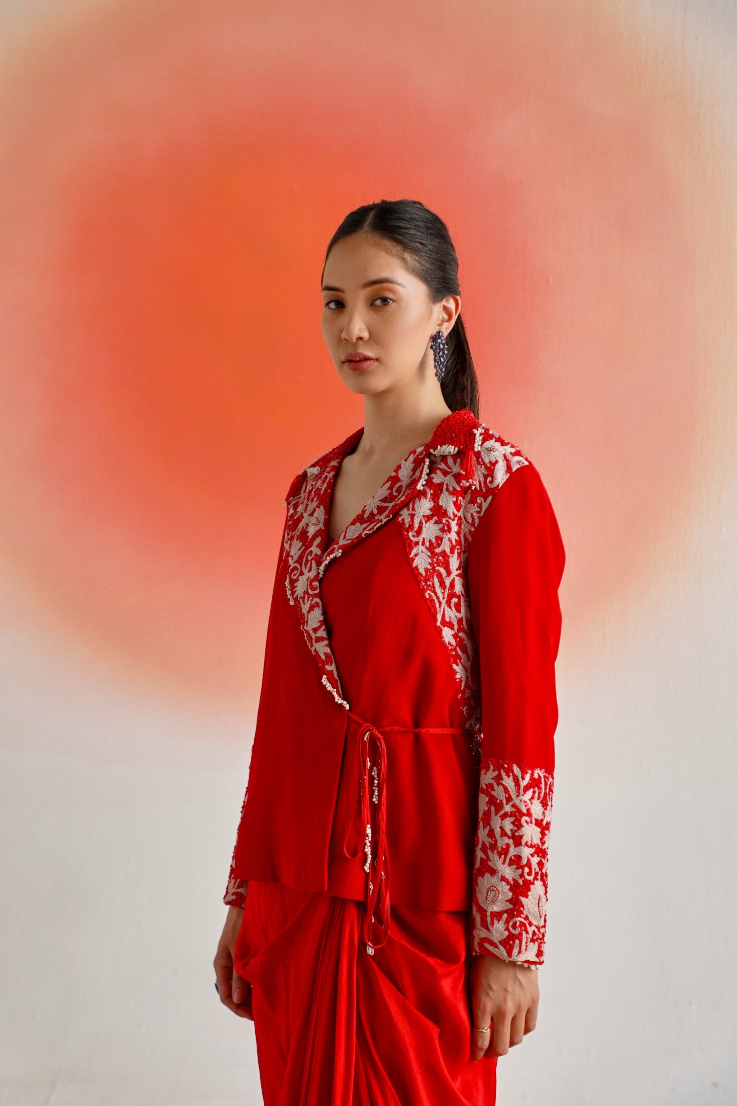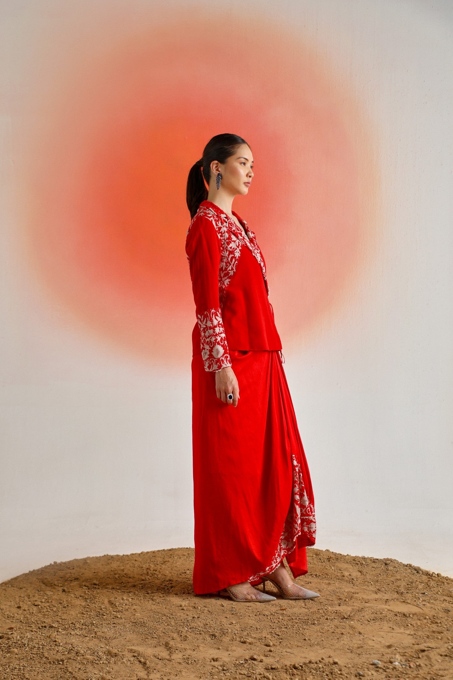 A striking blend of tradition and elegance, this black angrakha-style jacket features intricate embroidery, beautifully paired with a matching inner. The look is completed with a pick-up skirt detailed with embroidery on the front panel — crafted thoughtfully for special occasions while ensuring effortless comfort and grace.
