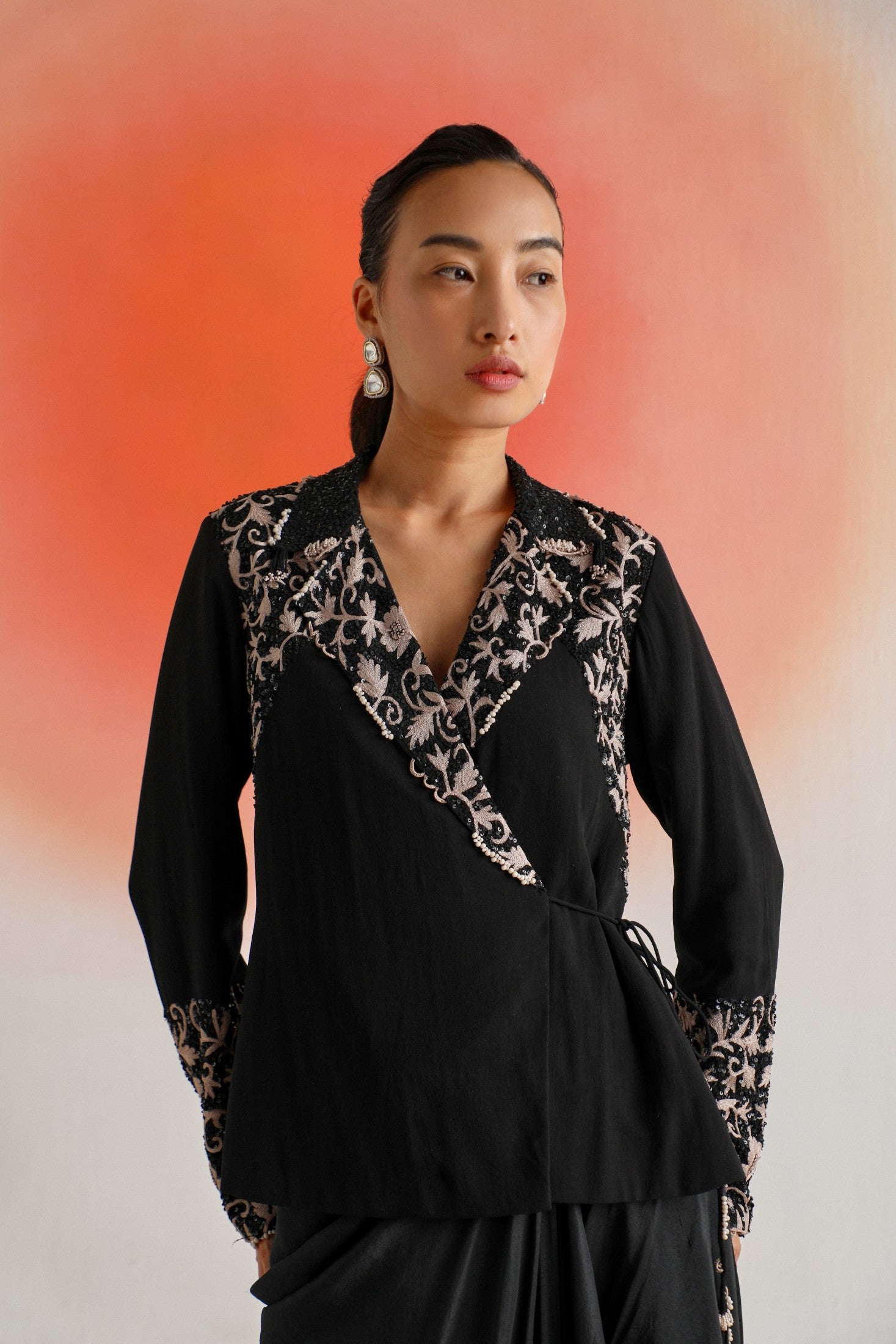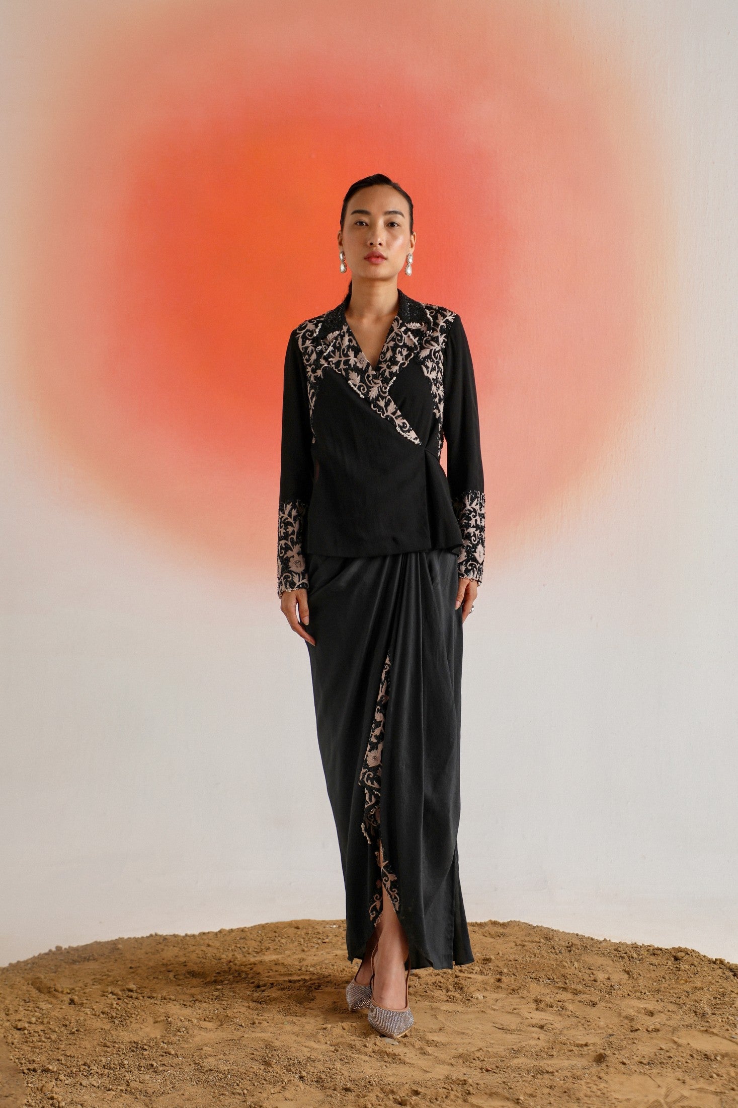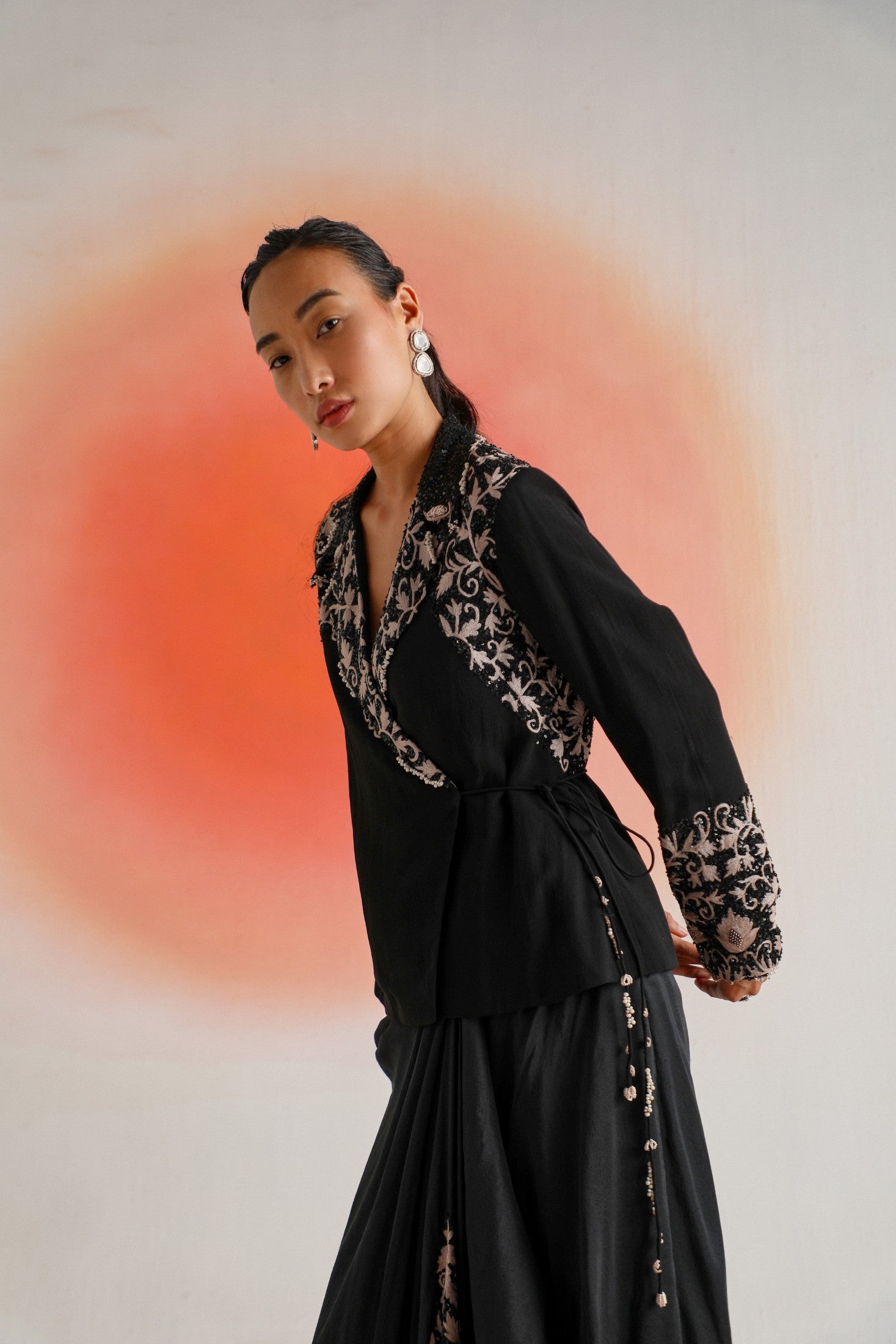Black Angrakha-Style Embroidered Jacket with Inner & Pick-Up Skirt