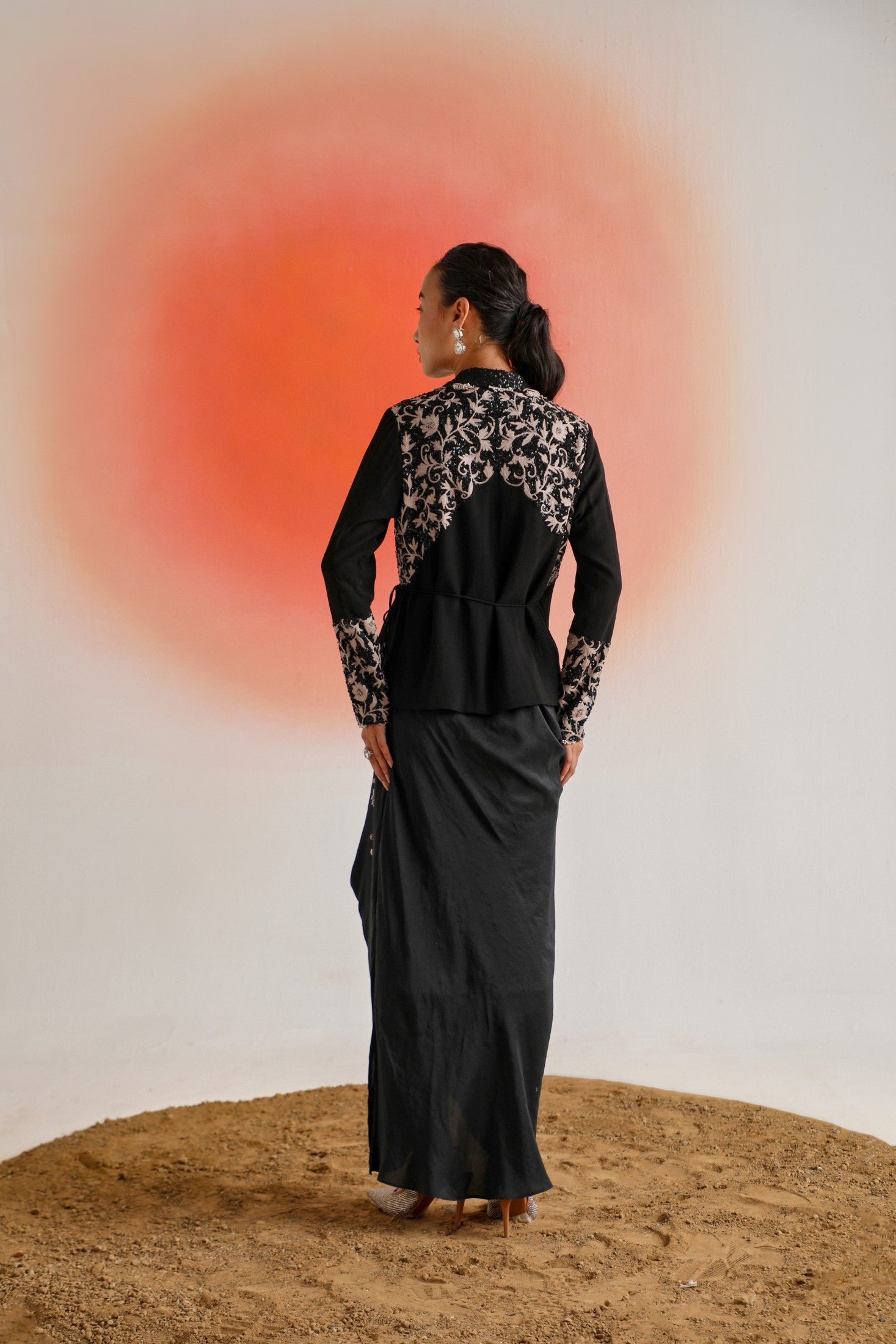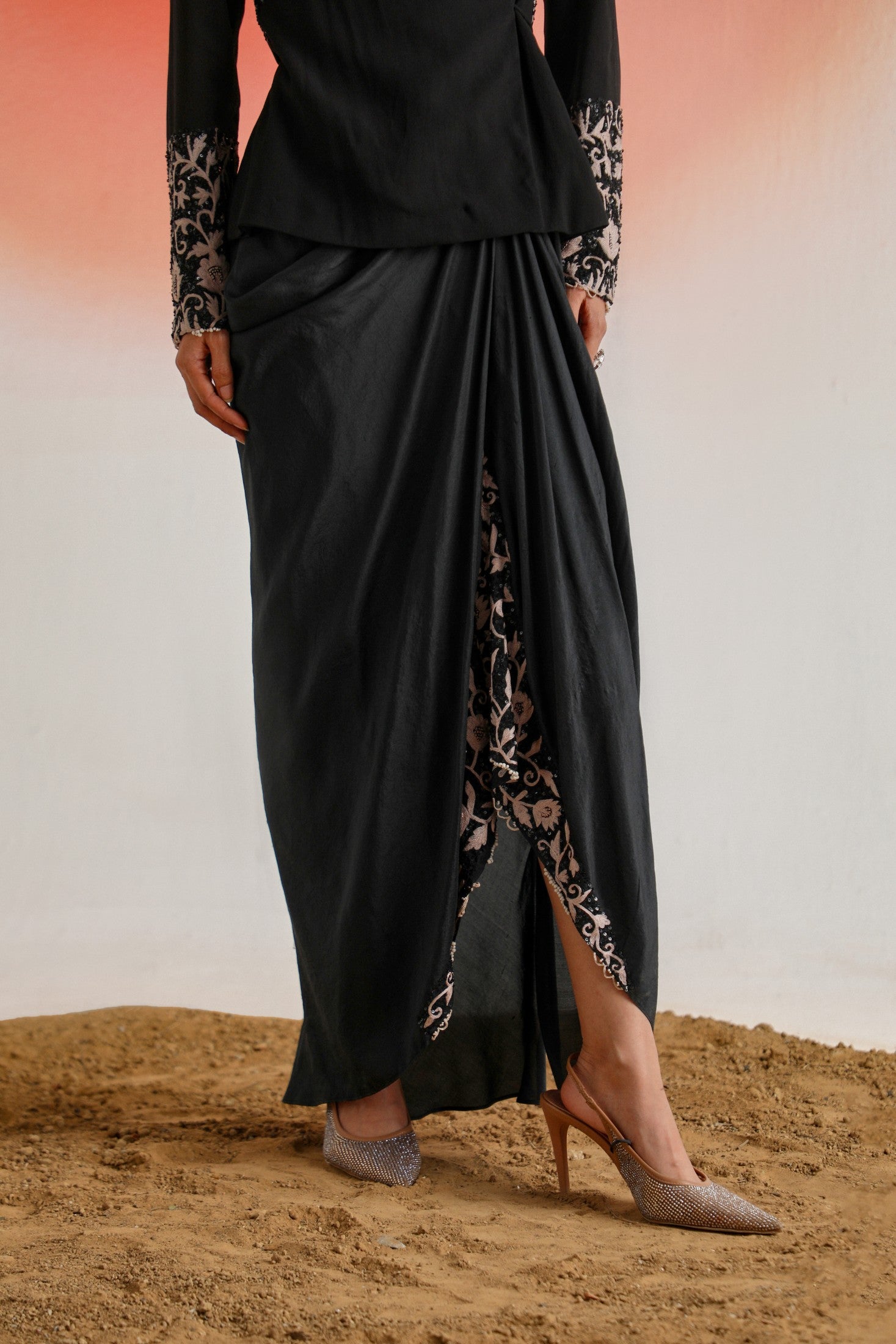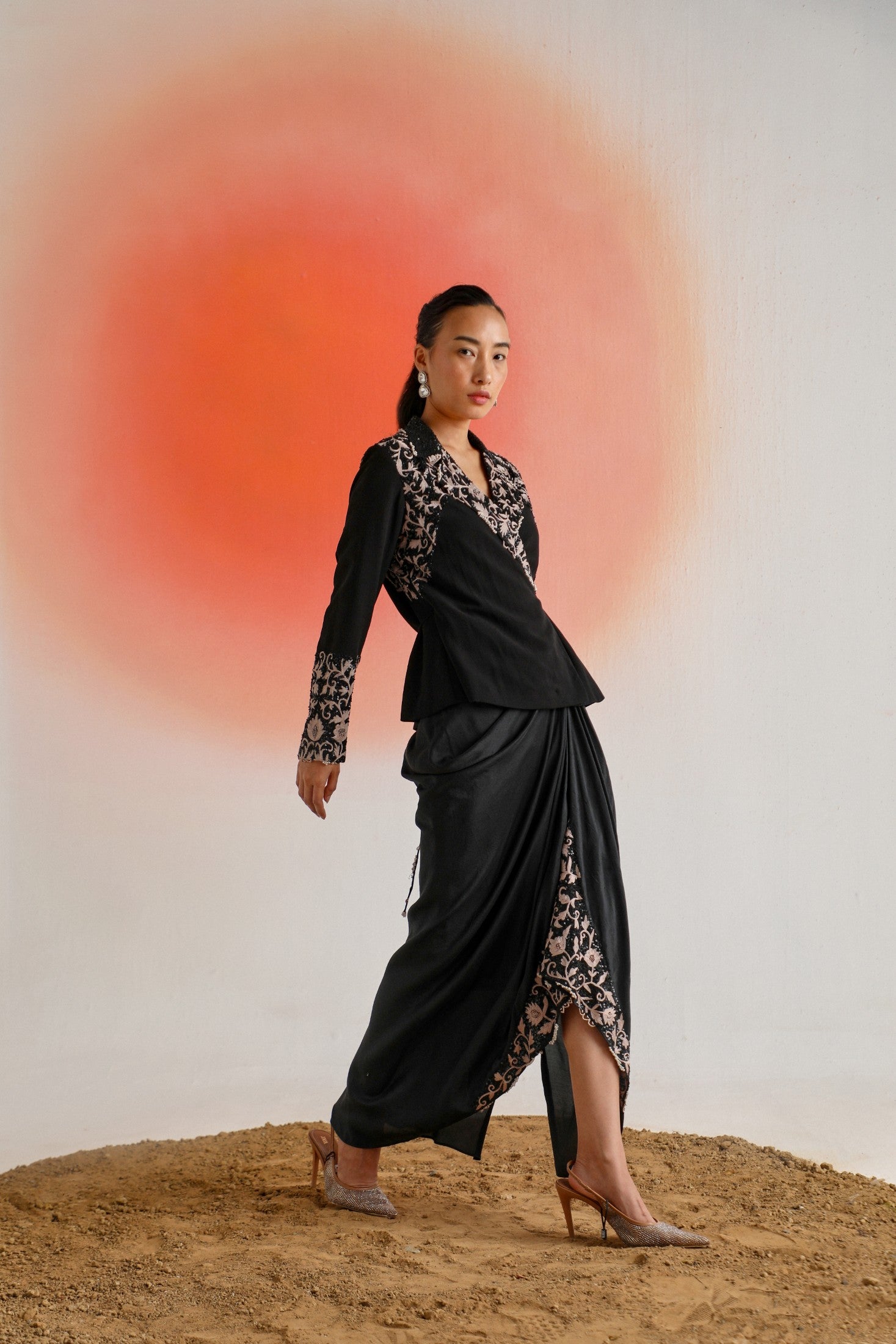 Black Angrakha-Style Embroidered Jacket with Inner & Pick-Up Skirt