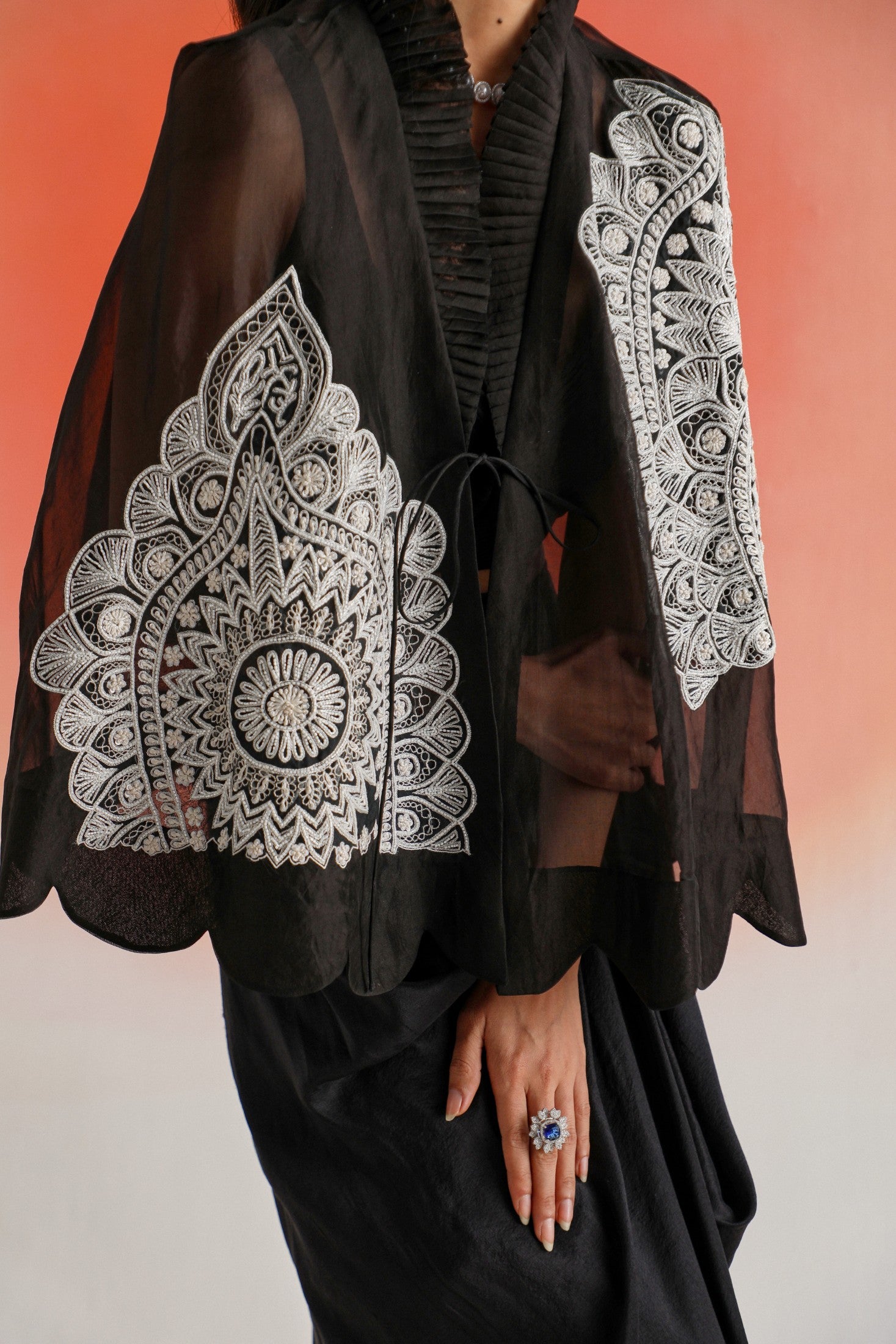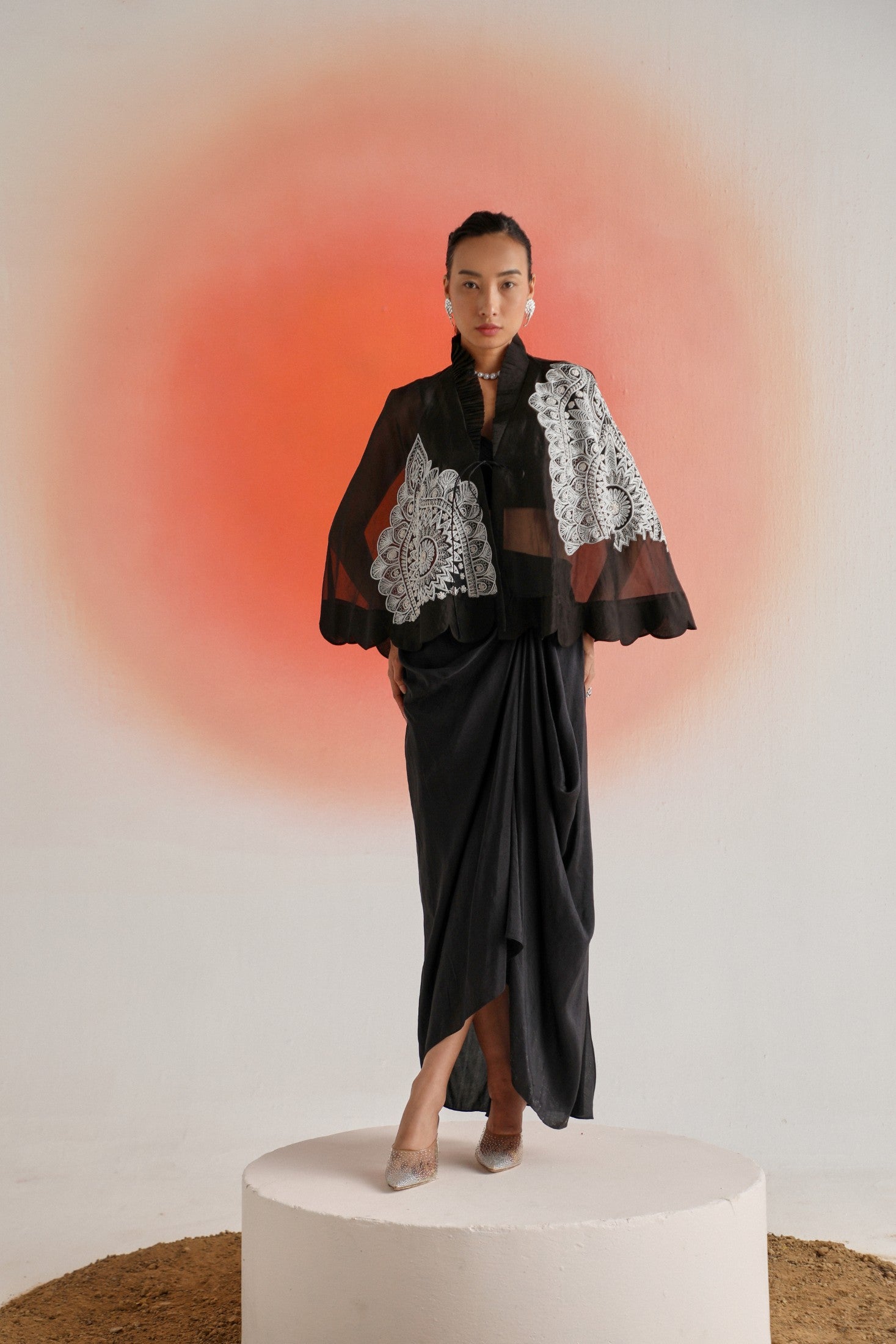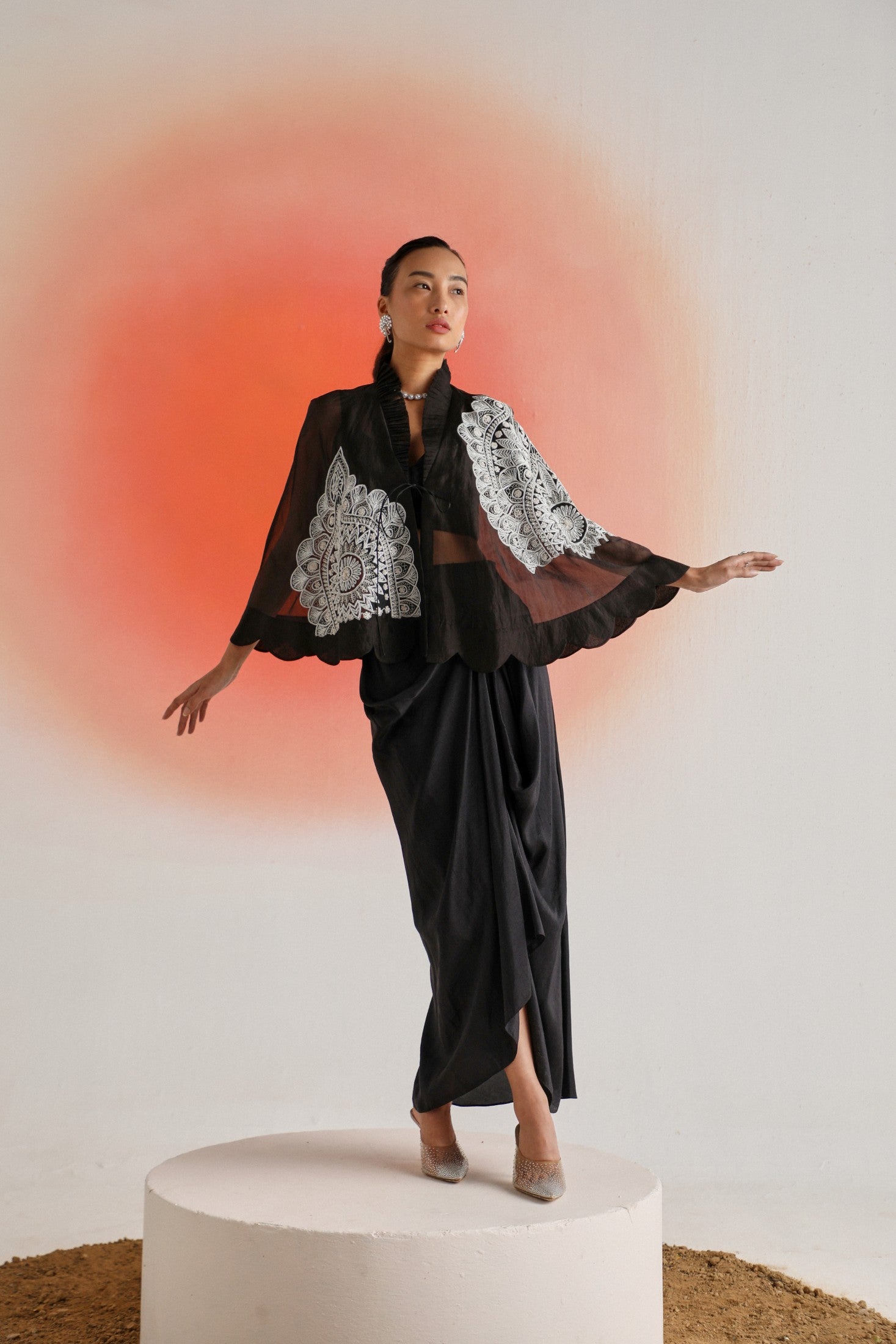 Black Organza Cape with White Handcrafted Embroidery, Inner & Silk Pick-Up Skirt