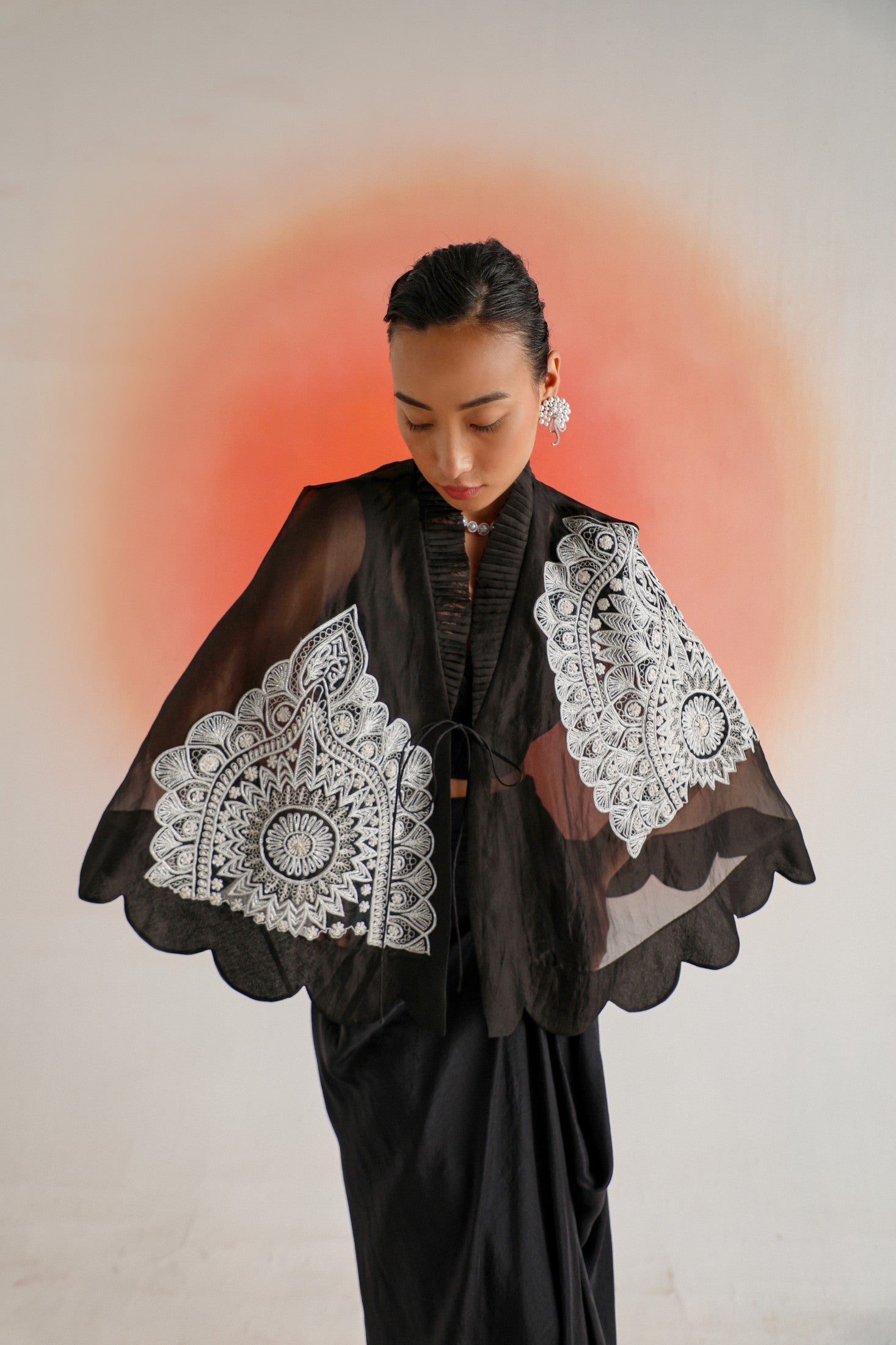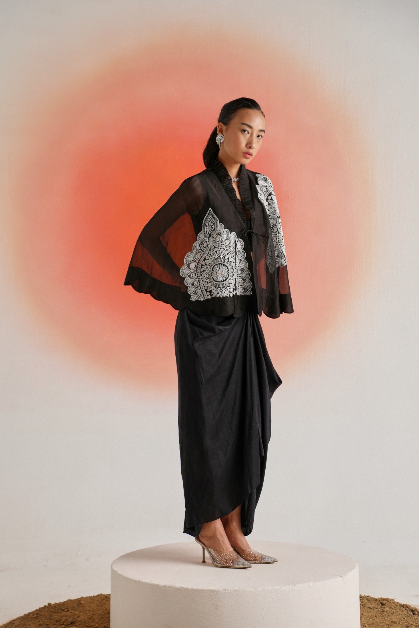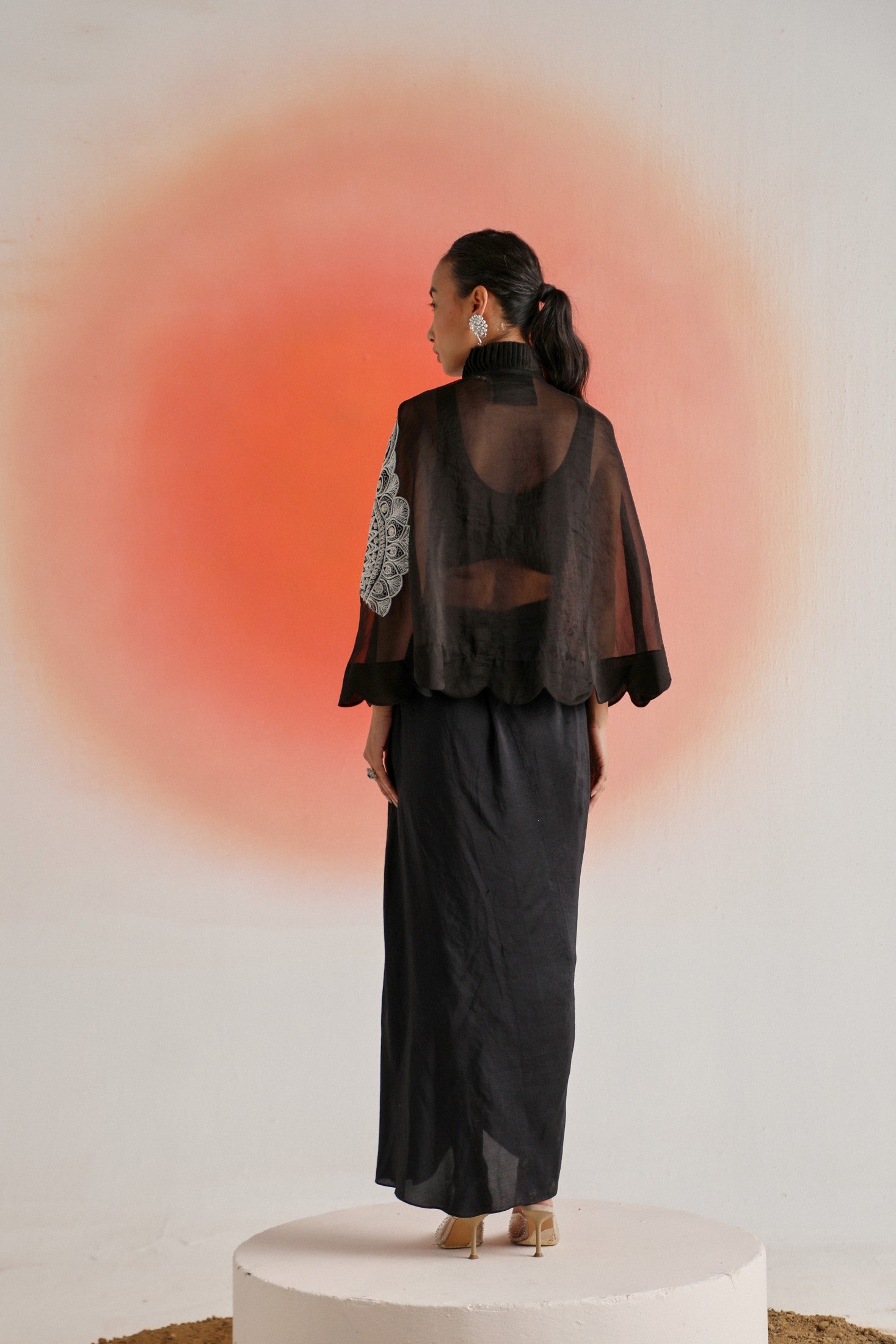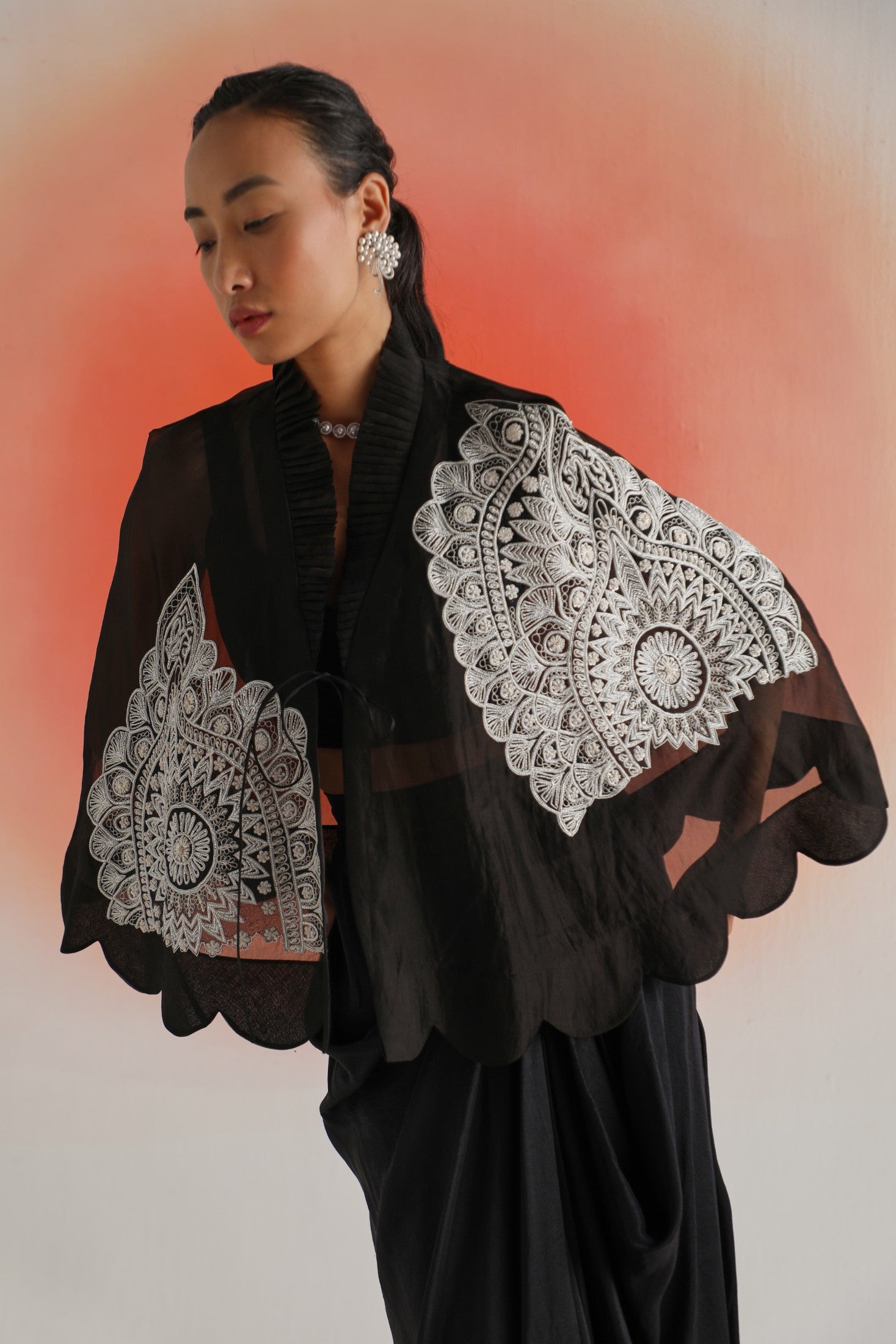 Black Organza Cape with White Handcrafted Embroidery, Inner & Silk Pick-Up Skirt