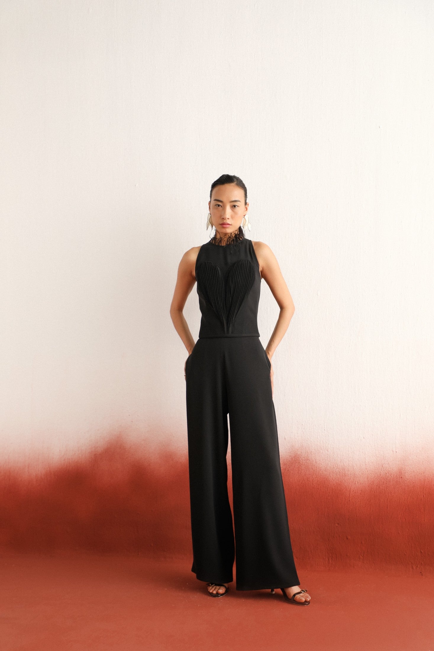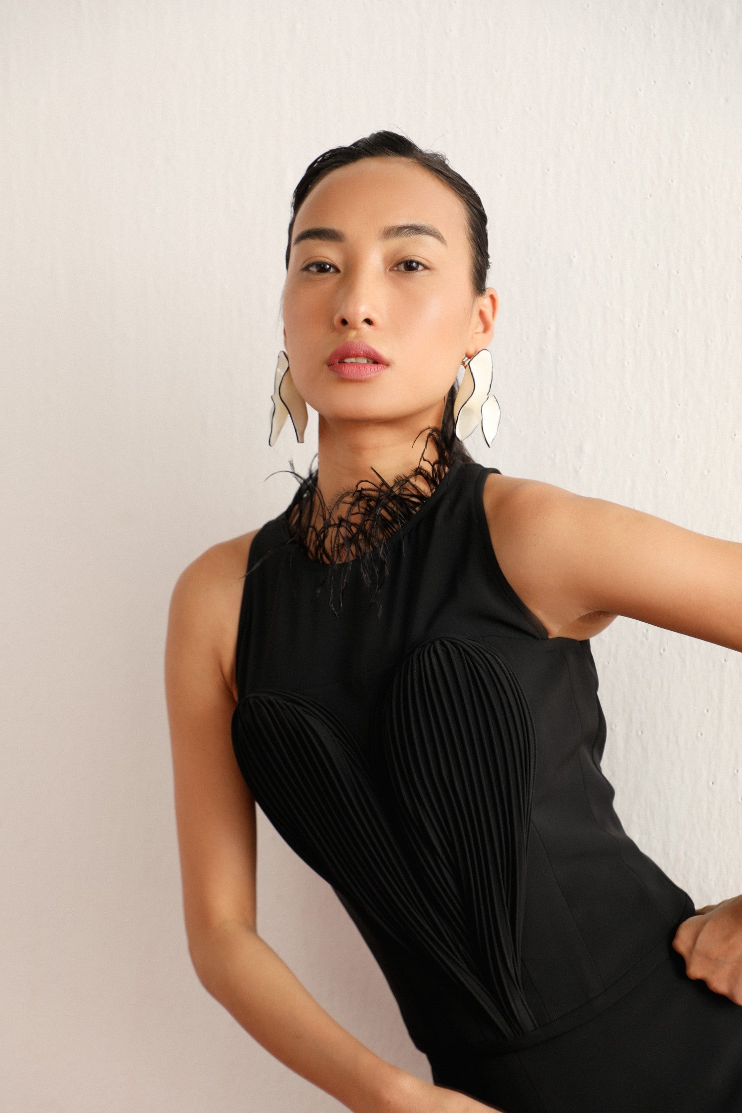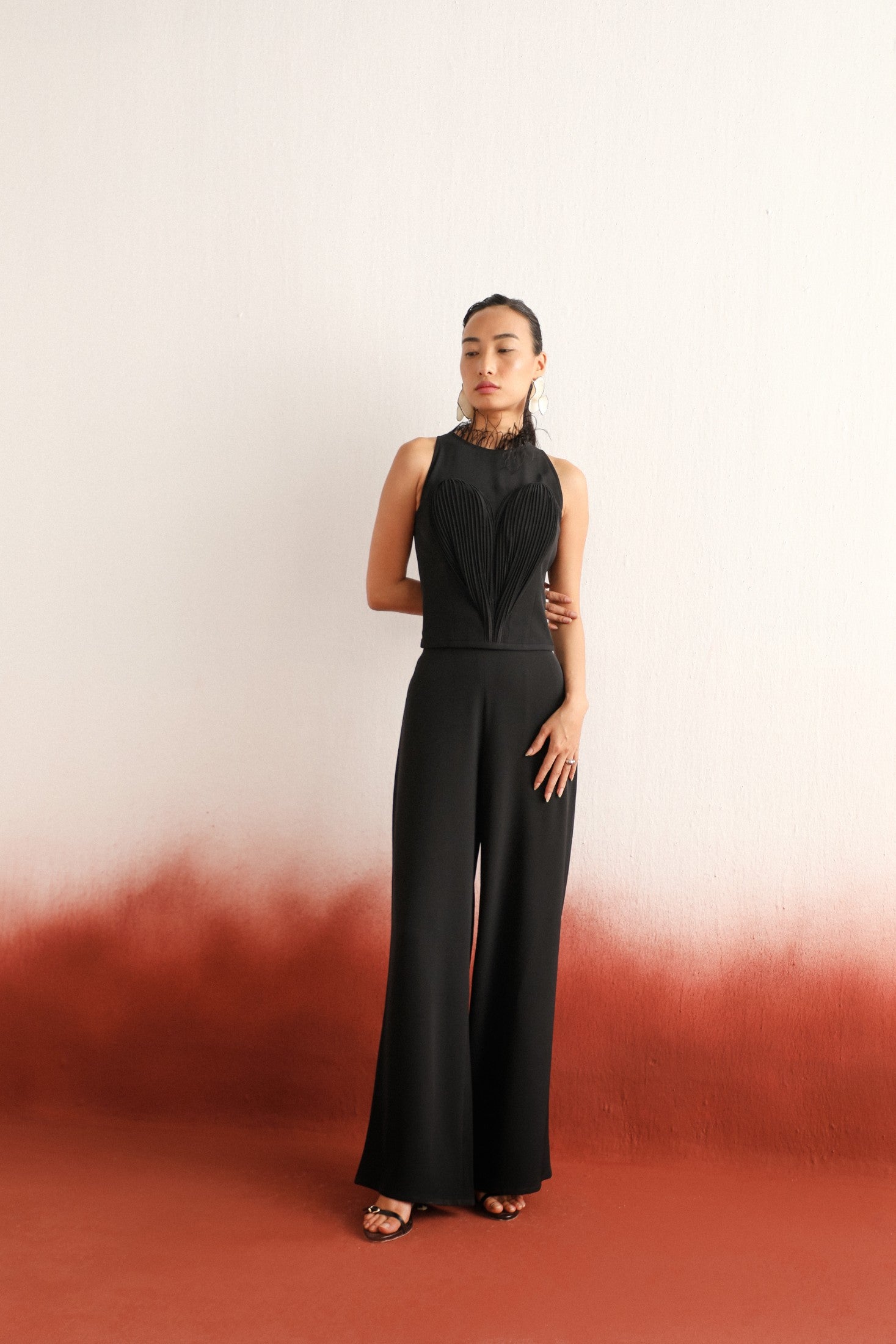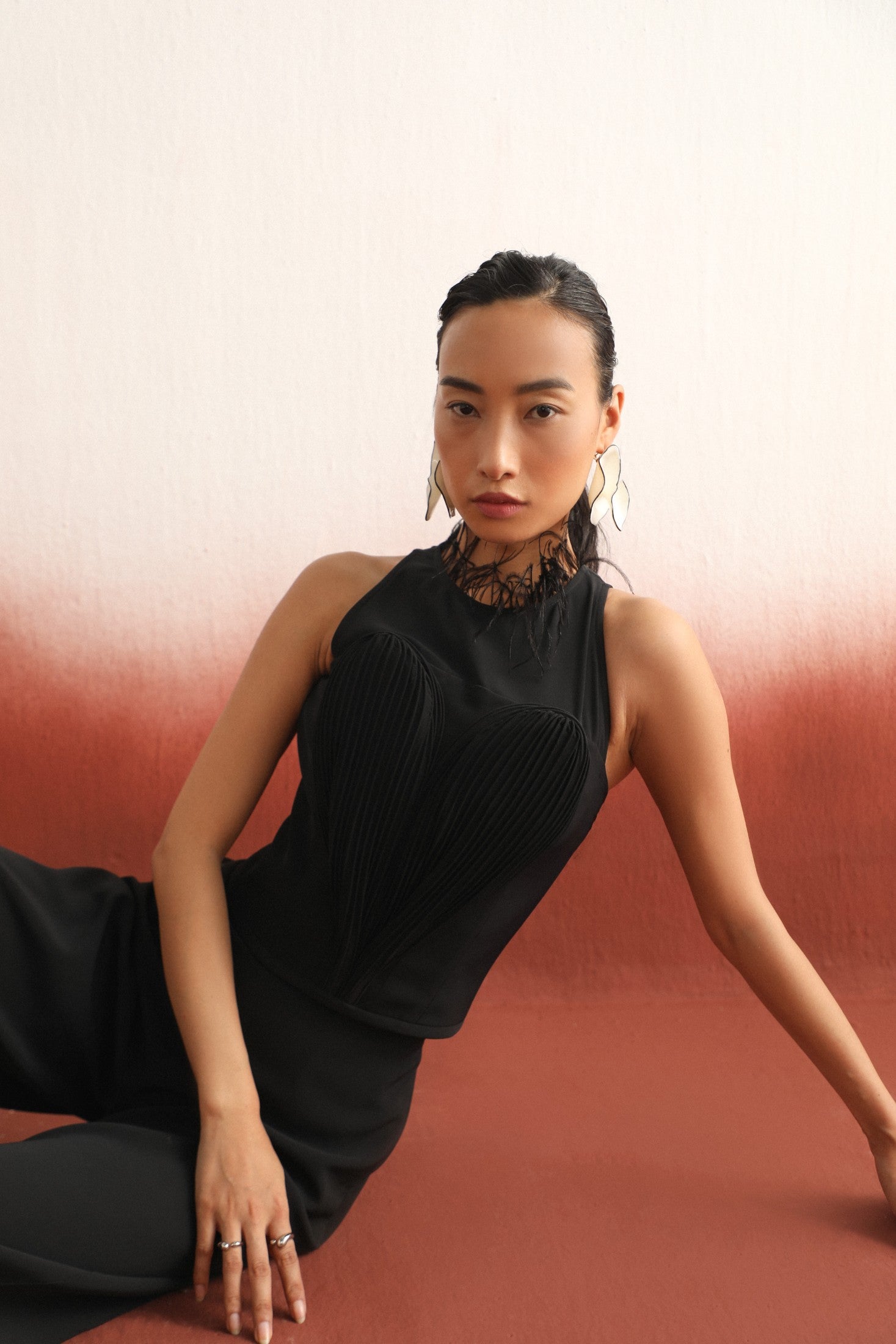Striking and sculptural, this black corset features a romantic heart-shaped structure silhouette that accentuates and defines wpmen. Paired with tailored pants for a sleek finish, it’s a powerful yet elegant ensemble — perfect for making a statement with style and confidence.