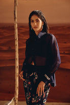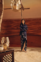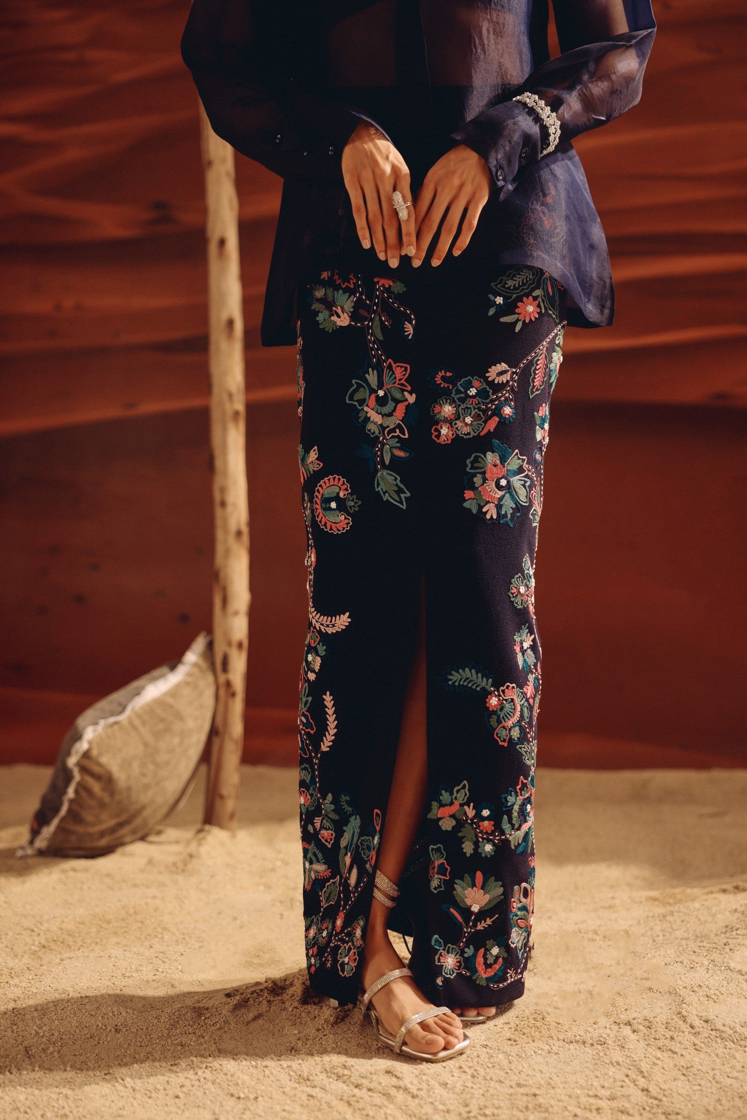 Whispers of elegance unfold in this ethereal navy blue creation. The sheer organza shirt, kissed by light, the elegent navy skirt adorned with exquisite multi-colour floral embroidery — each bloom thoughtfully placed, painting a story of artistry and grace. , moves with quiet allure, adding a modern rhythm to its timeless silhouette. A symphony of texture and tone, this ensemble evokes the poise of couture and the poetry of twilight — crafted for the woman who embodies both strength and softness.