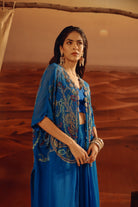 A vision of contemporary grace and artistic detailing, this sapphire blue ensemble exudes refined sophistication. The long chiffon cape, fluid and weightless, is adorned with exquisite multi-colour placement embroidery — each motif thoughtfully composed to create a canvas of colour and texture. Beneath, a delicately crafted bustier adds a modern edge, while the plain pants ground the look with clean, minimal elegance. Perfect for festive soirées, modern celebrations, or elegant gatherings, this ensemble captures the essence of effortless luxury — where vibrant artistry meets timeless refinement.