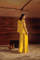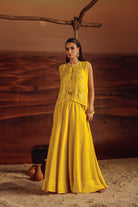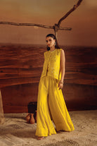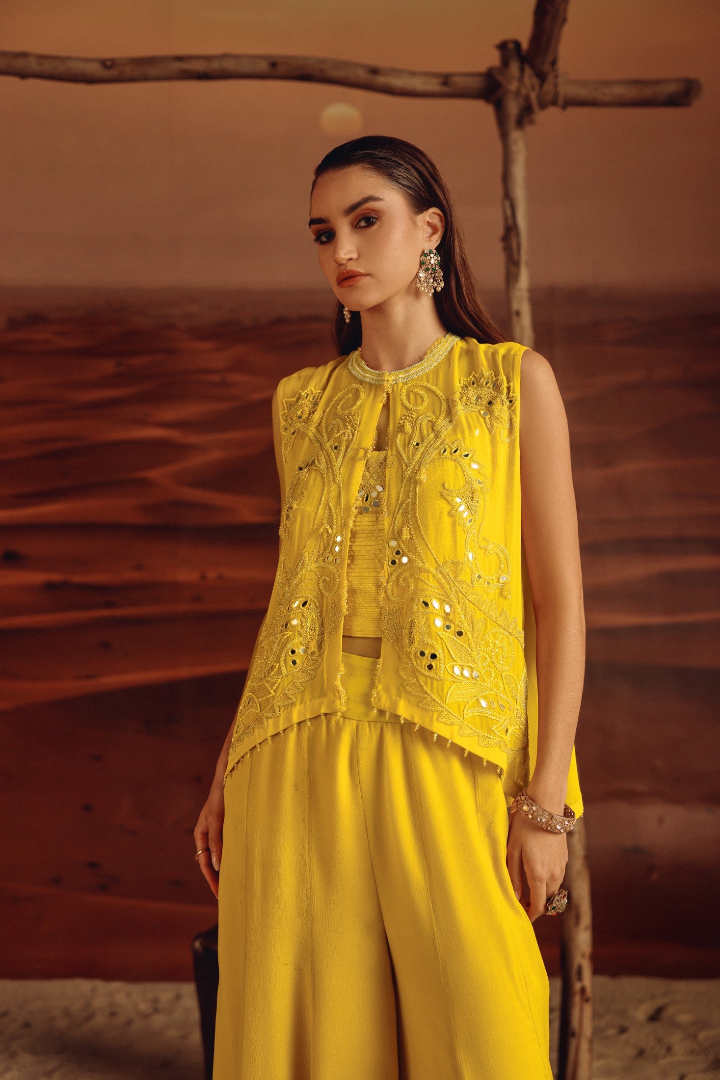 Bathed in the golden warmth of mustard sunlight, this ensemble weaves tradition and contemporary flair into one harmonious silhouette. The short jacket, adorned with delicate embroidery, whispers tales of intricate artistry, while the flowing sharara sways like a gentle breeze, capturing movement and grace. Layered over a subtle inner, the look balances structure and fluidity, evoking effortless elegance. Ideal for festive soirées, celebratory rituals, or moments that demand a quiet statement, this outfit radiates luminous charm, where every thread tells a story of timeless craftsmanship.