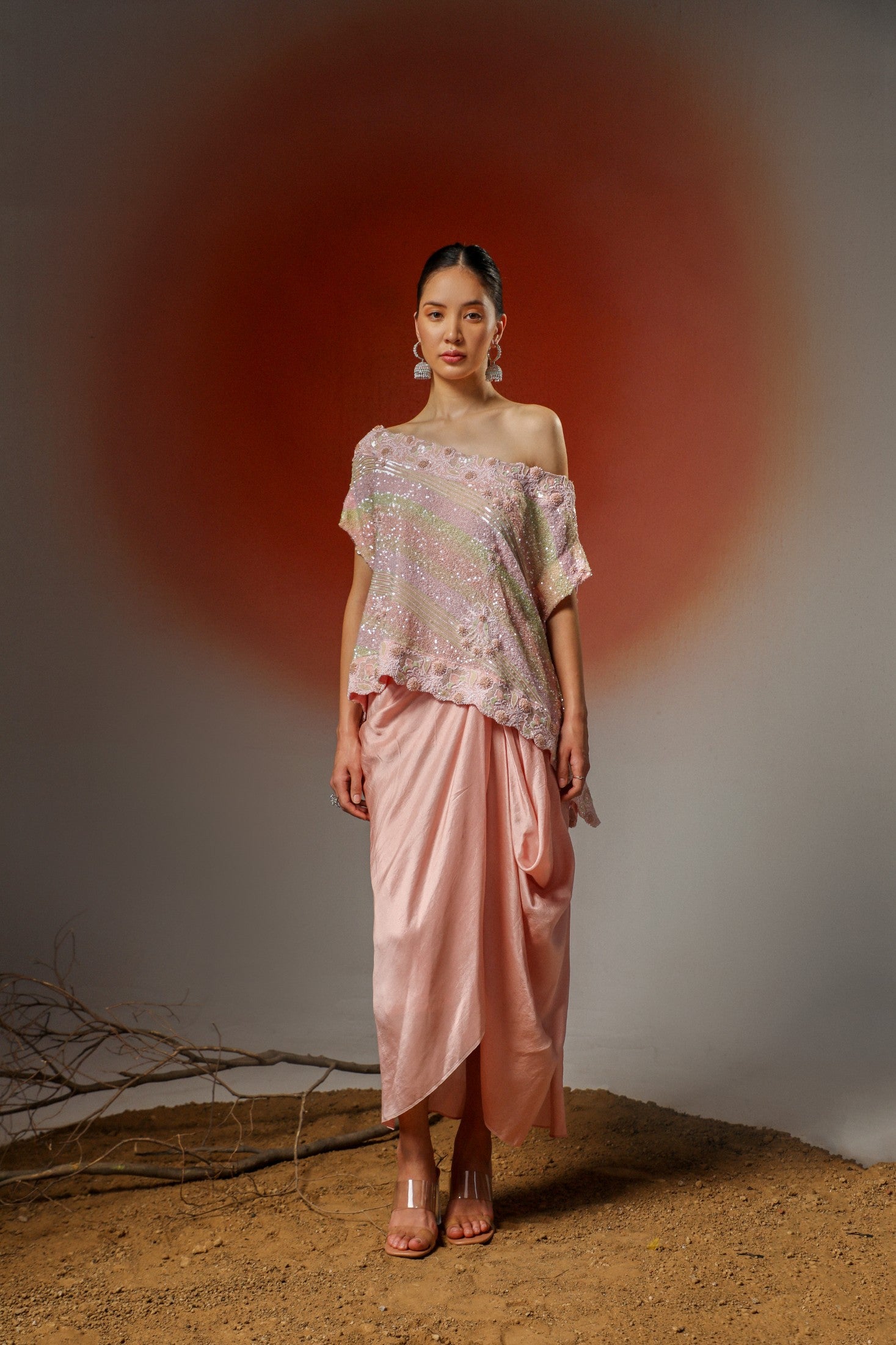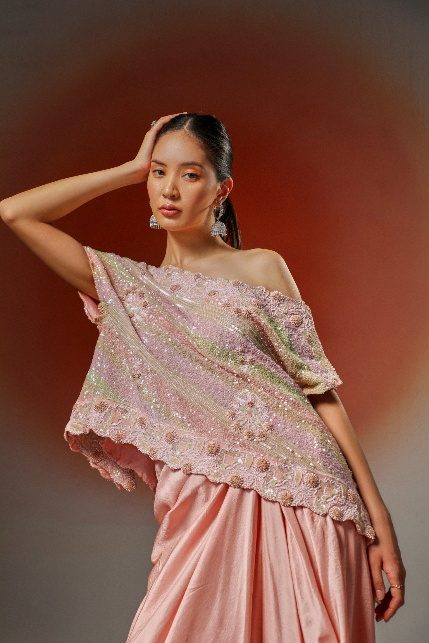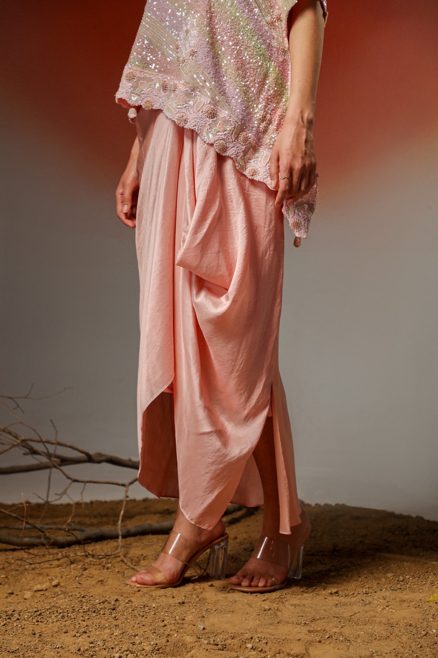 Soft yet statement-making, this peach pink ensemble features a delicately embellished cape adorned with intricate chikankari embroidery. Paired with a pick-up skirt, it’s thoughtfully designed to turn heads at special occasions while ensuring graceful movement and all-day comfort.