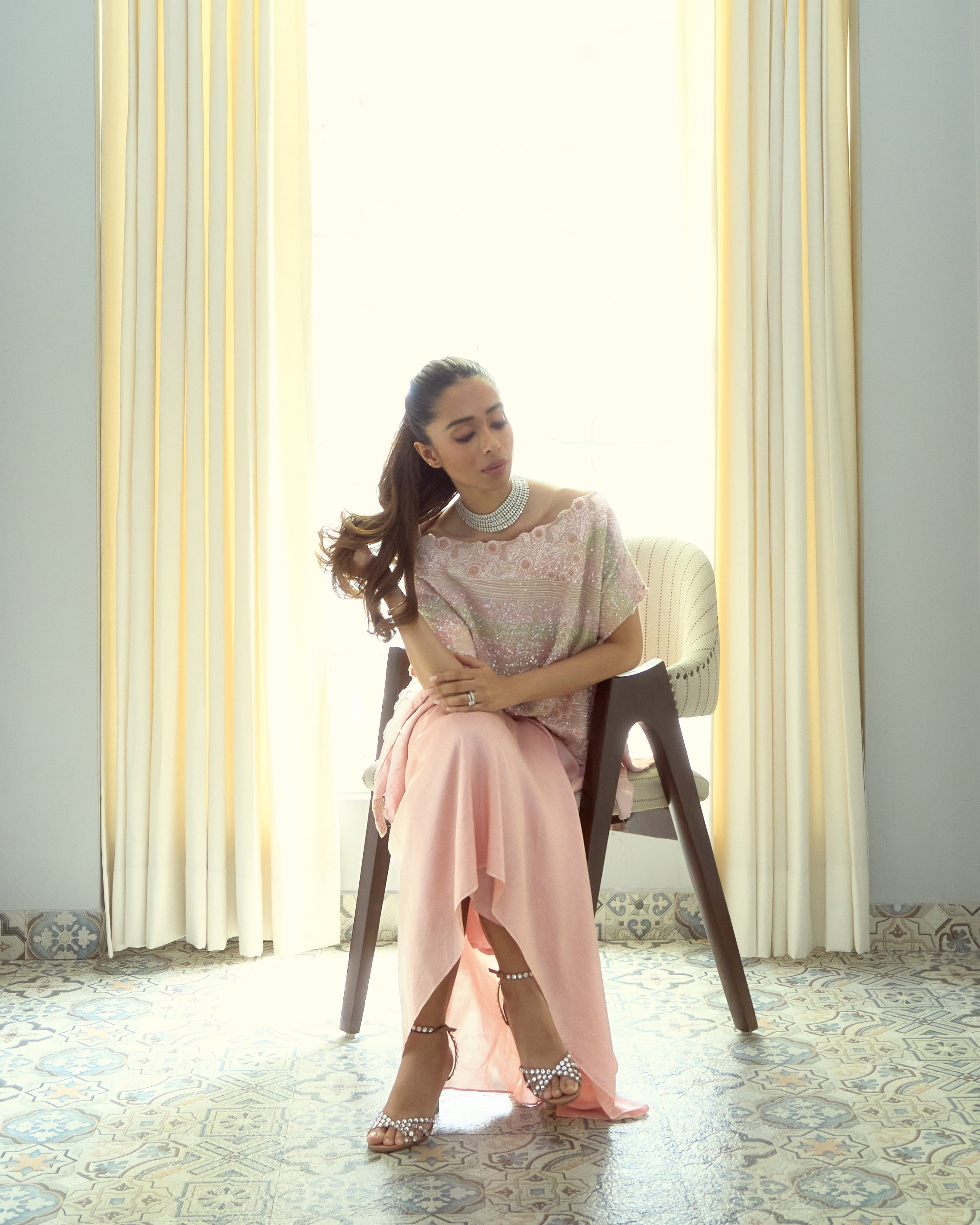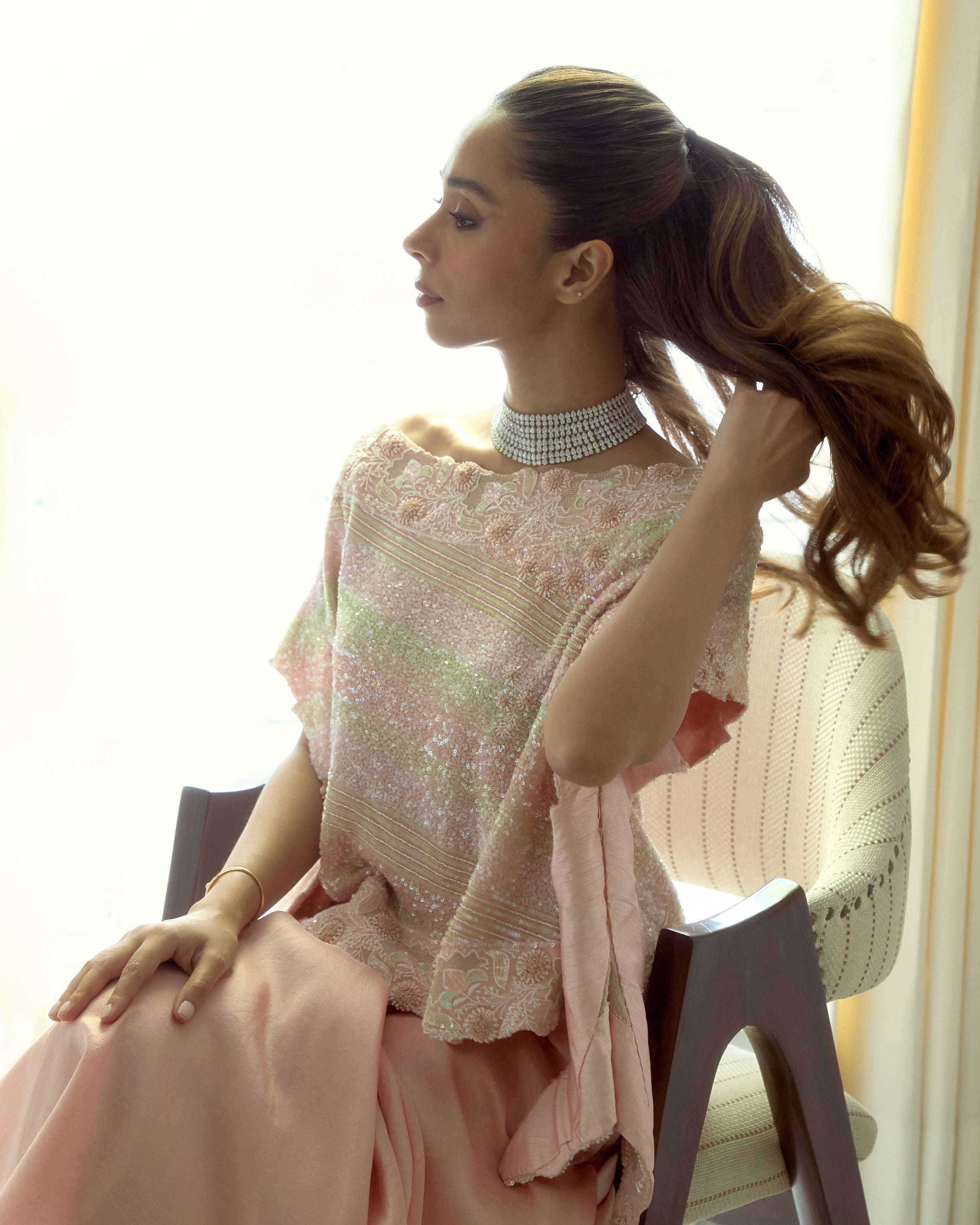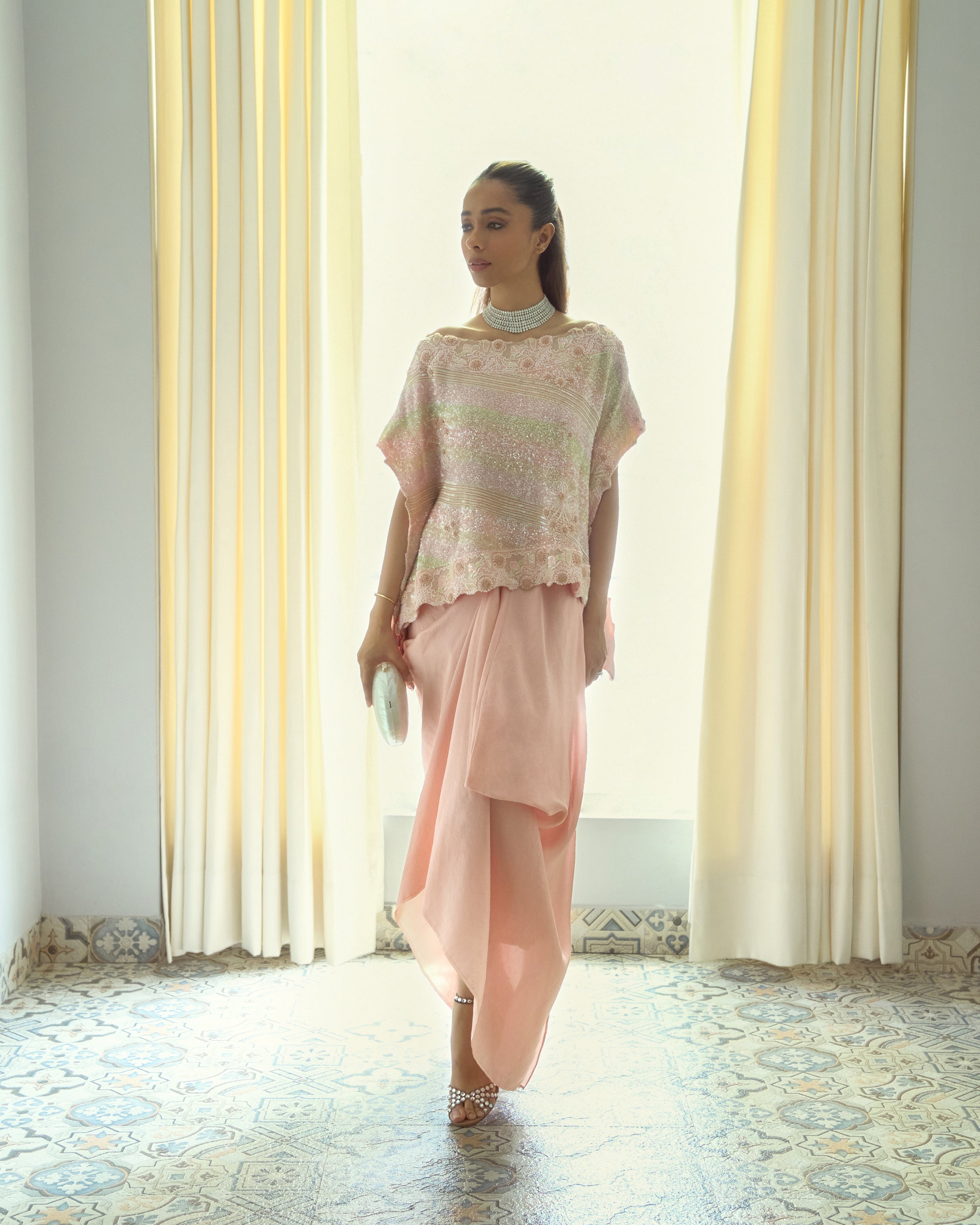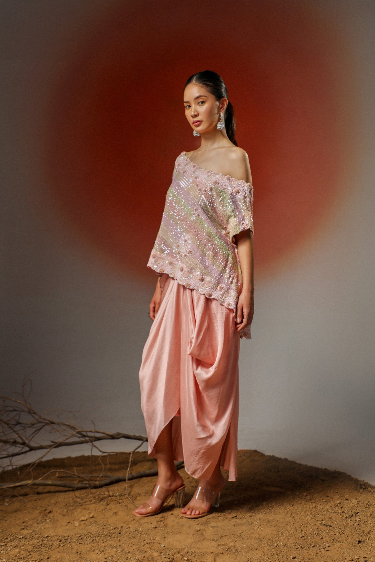 Soft yet statement-making, this peach pink ensemble features a delicately embellished cape adorned with intricate chikankari embroidery. Paired with a pick-up skirt, it’s thoughtfully designed to turn heads at special occasions while ensuring graceful movement and all-day comfort.