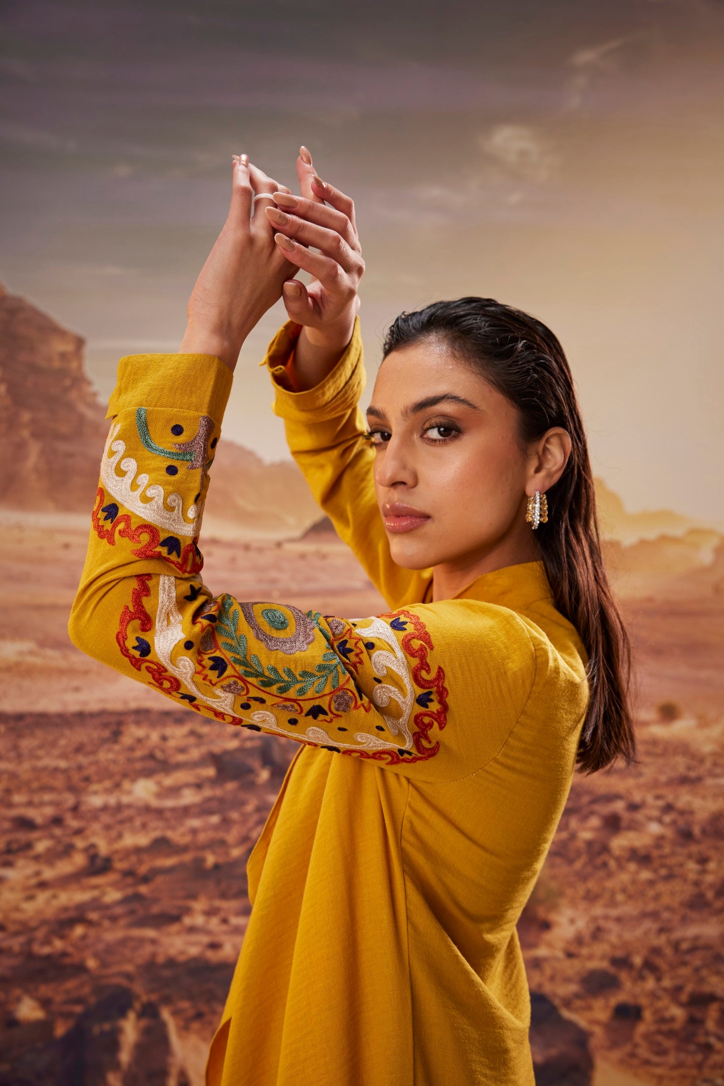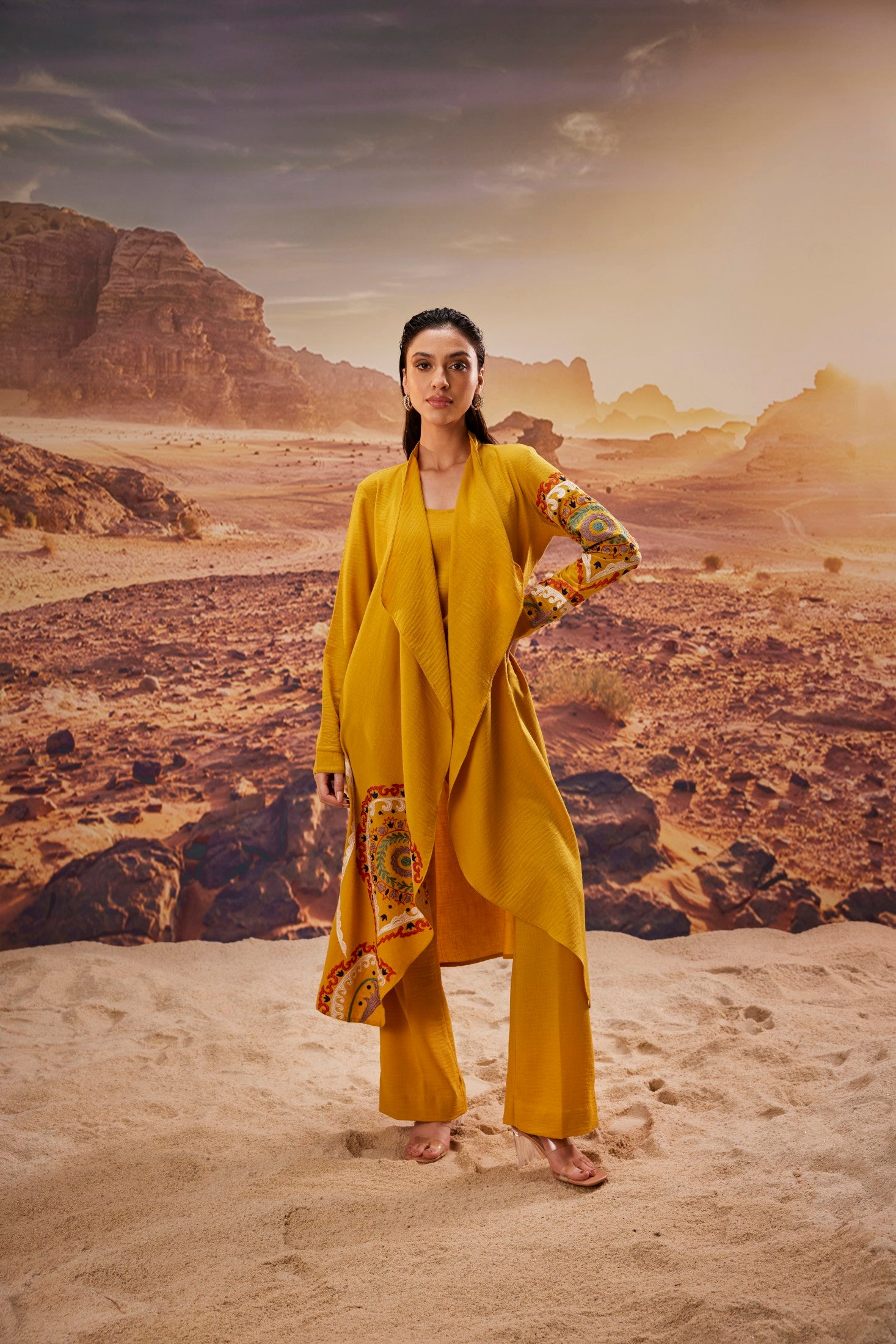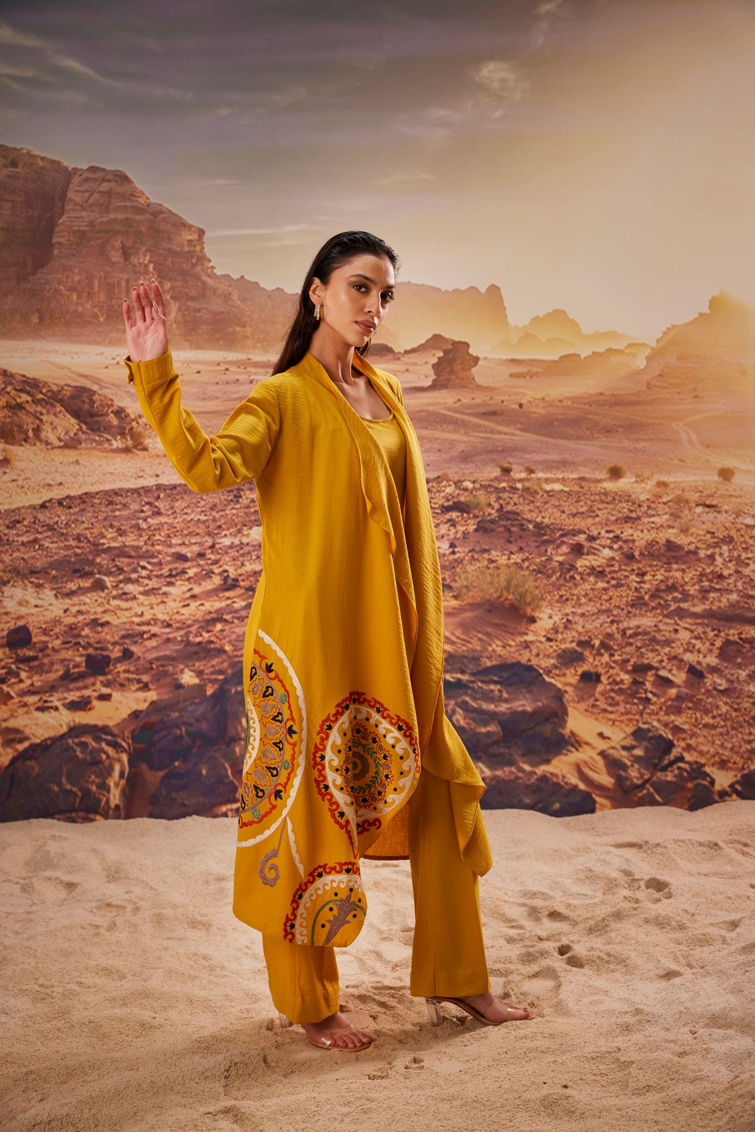Bright and elegant, this mustard ensemble features a flowy long jacket adorned with vibrant multicolour embroidery, paired with a coordinating inner and tailored pants. The rich hue and intricate detailing make it a standout choice for festive gatherings, cultural celebrations, or stylish daytime events — blending tradition with contemporary flair.