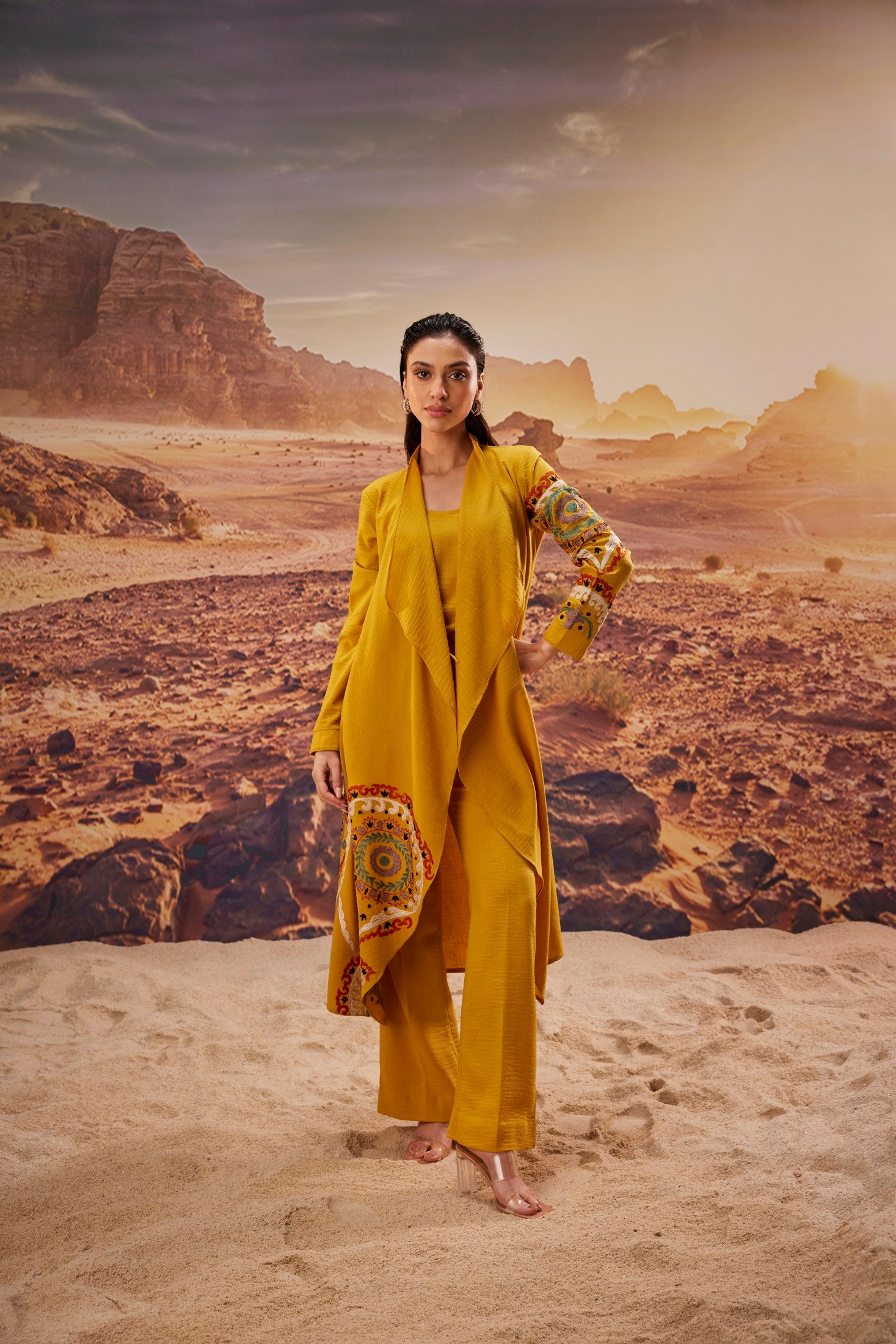 Mustard Long Jacket with Inner & Pants Featuring Multicolour Embroidery