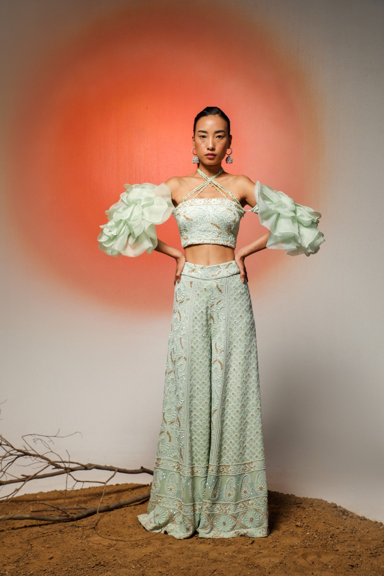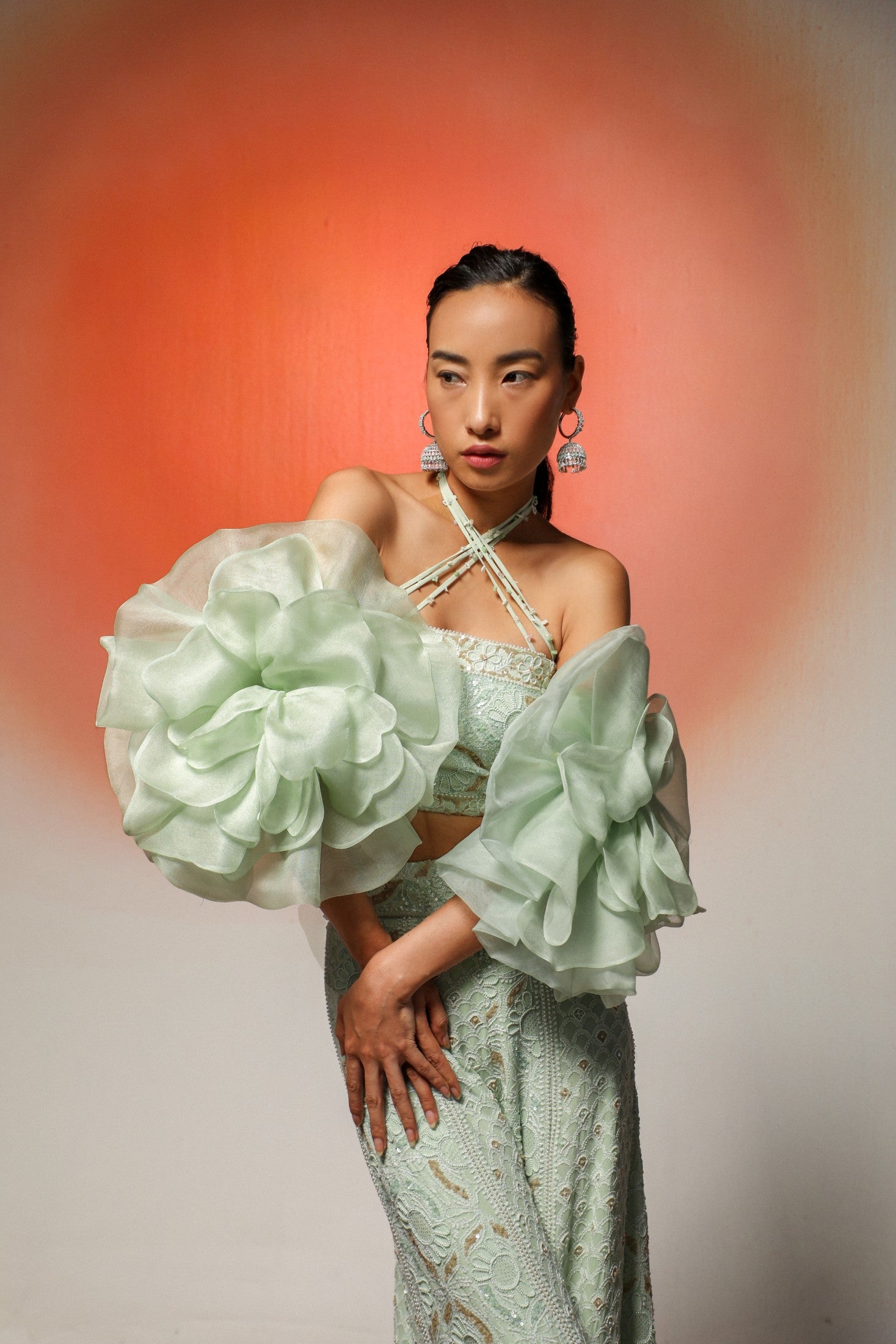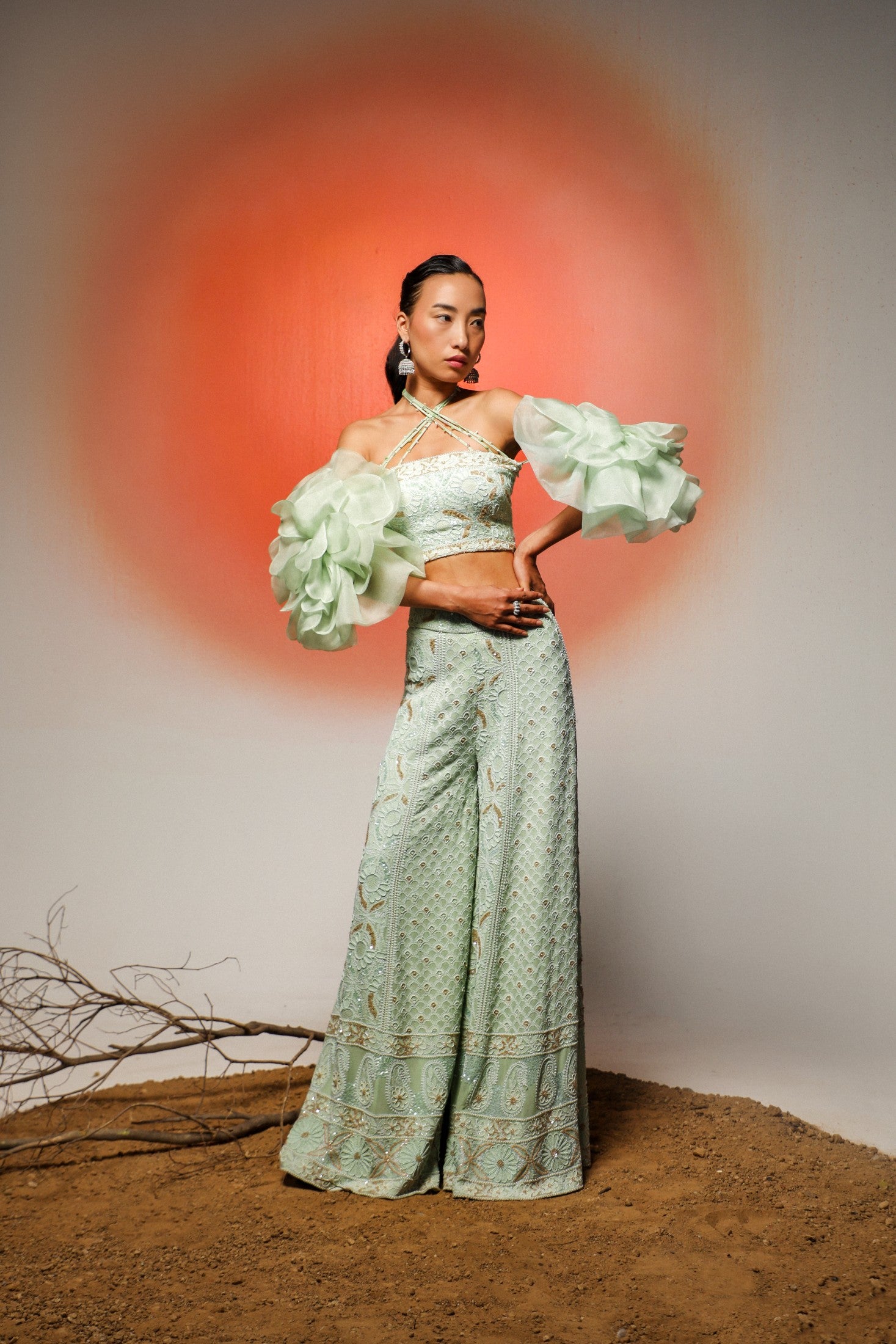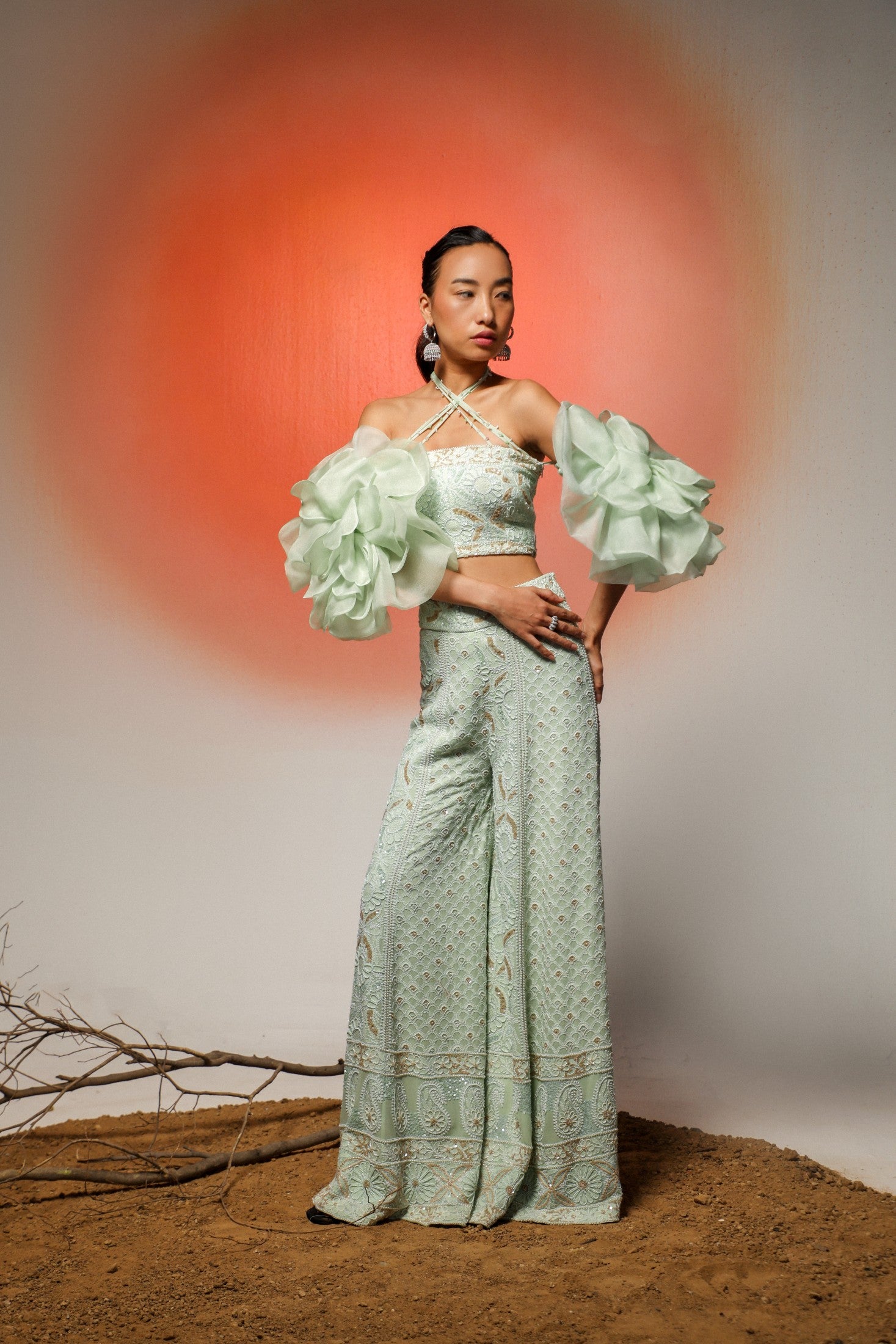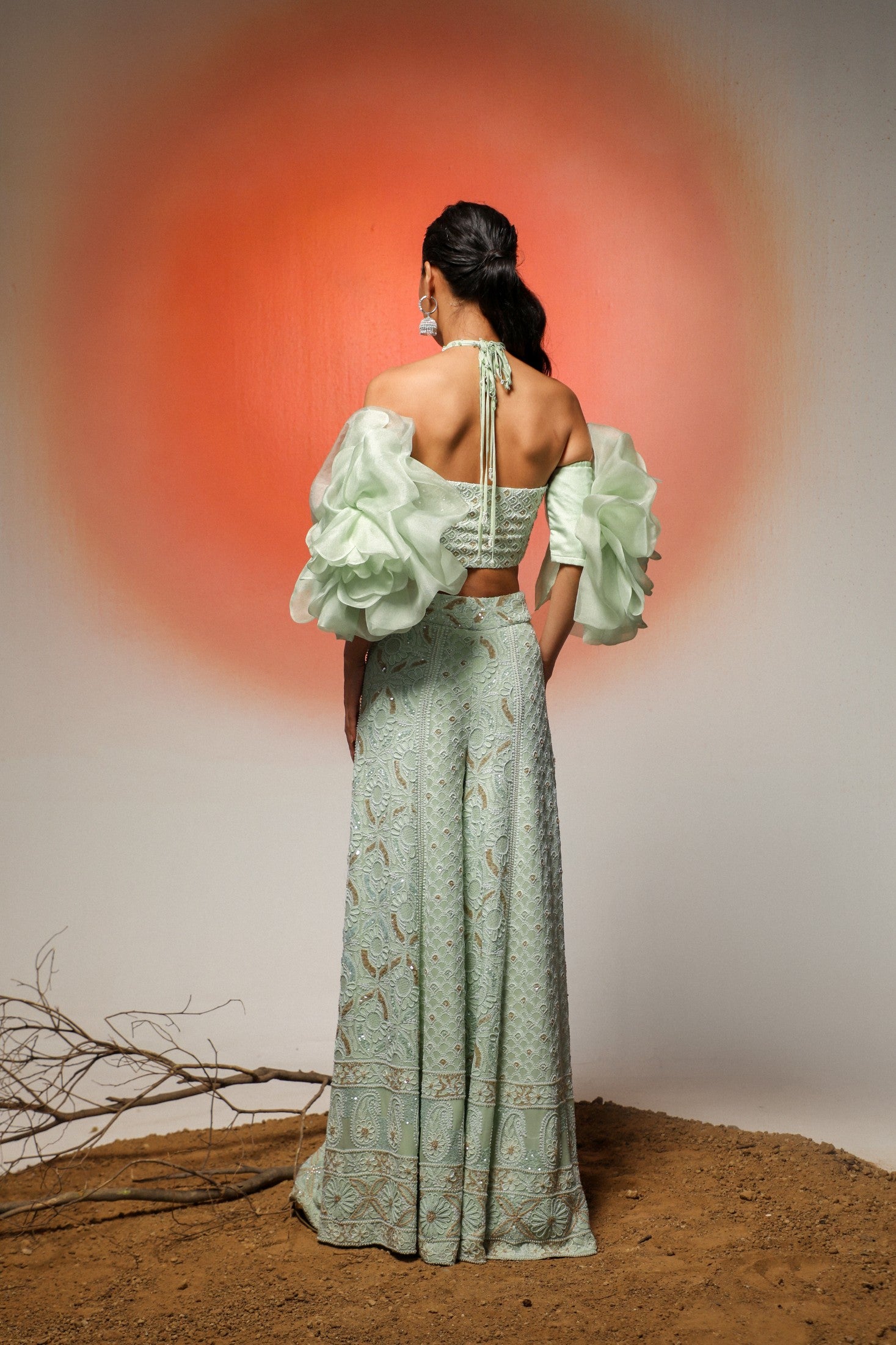 Mint Sea Green Fully Embellished Sharara Set with Embroidered Top and Petals Organza Sleeves
